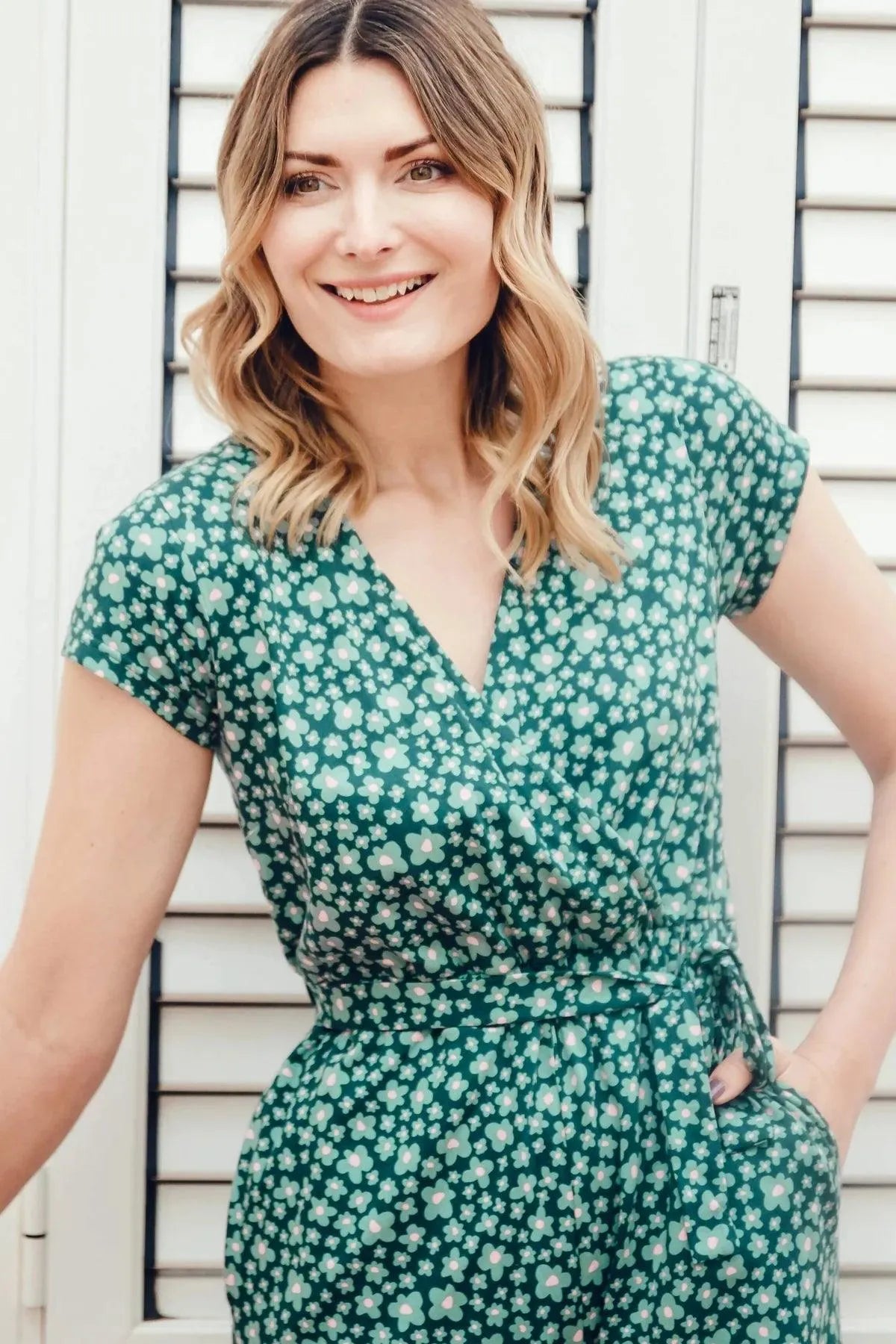 Dunkelgrüner „Field of Daisies“-Jumpsuit aus kurz geschnittenem Jersey „Sugarhill Katrina“.