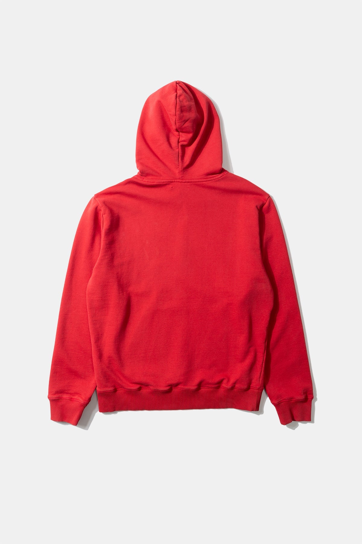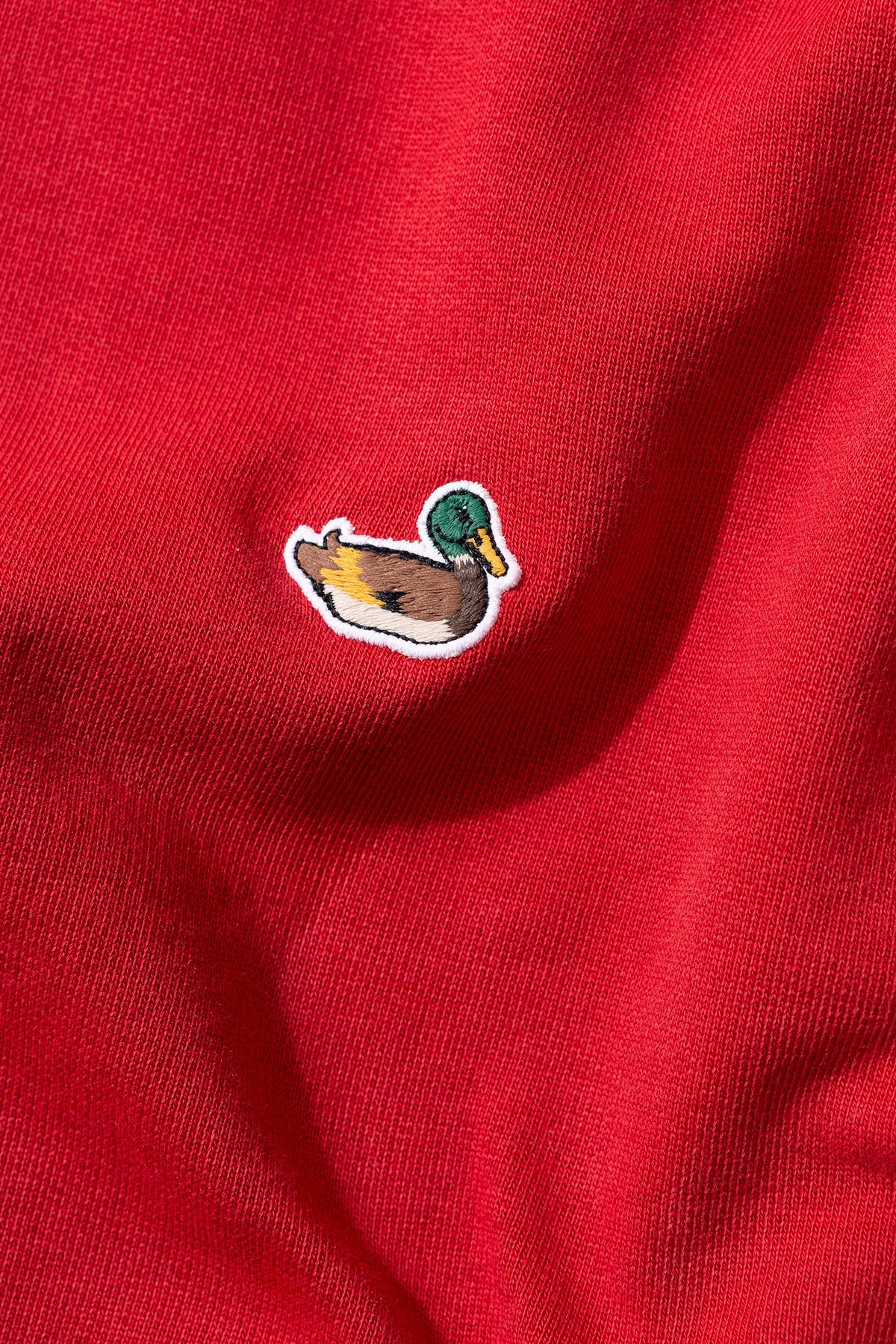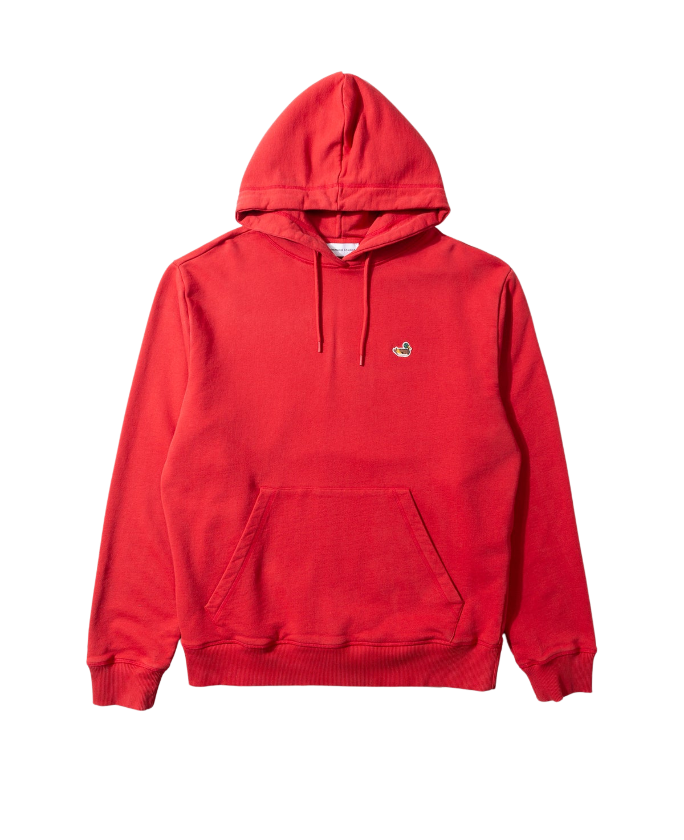 Sudadera clásica roja con capucha y, acabado en puños y dobladillo. Fabricada en algodón 100% orgánico. Acabada con nuestro emblemático logotipo de pato bordado en el lado izquierdo del pecho. Fabricada en Portugal.