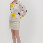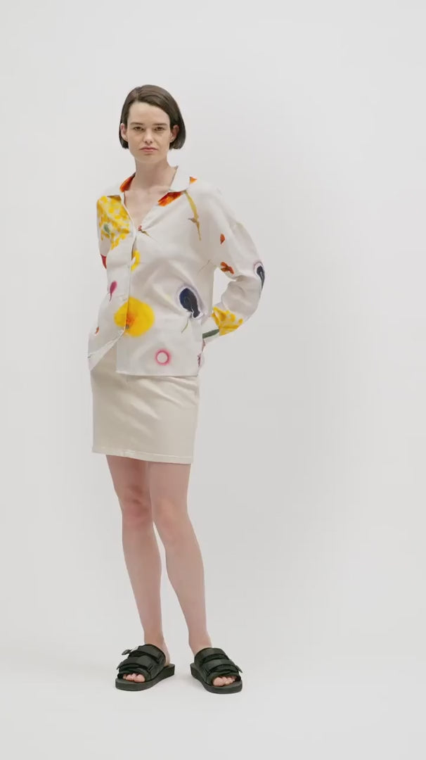 Feuz Day Margaret weiße Bluse aus Bio-Baumwolle, in Zusammenarbeit mit der Künstlerin gearbeitet Thierry Feuz . Die Arbeit des Künstlers wurde im Digitaldruck erfasst.