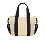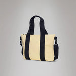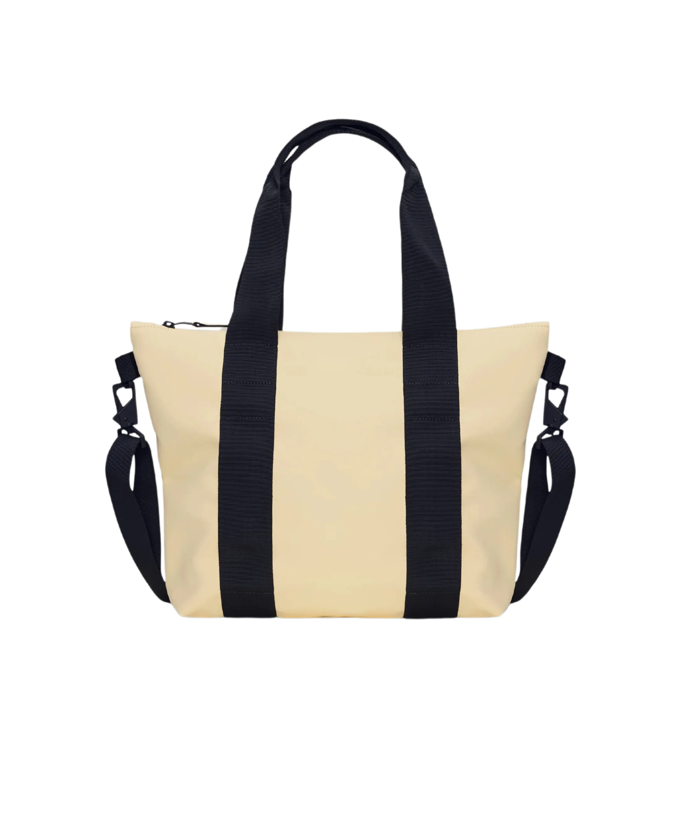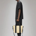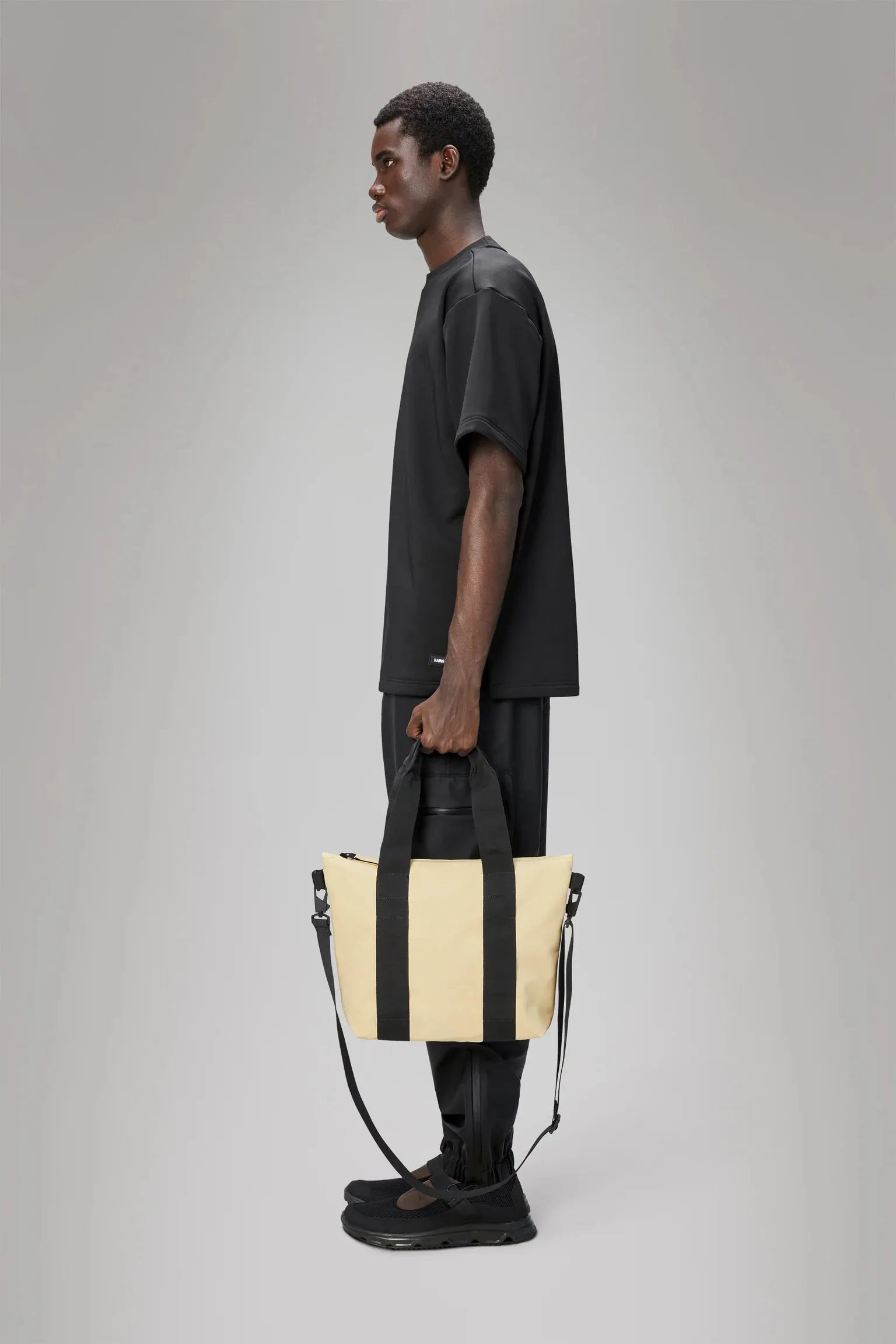 Die Micro Tote Bag aus dem charakteristischen wasserabweisenden Polyurethan-Gewebe von Rains bietet Haltbarkeit, Tragbarkeit und ein weiches Finish.