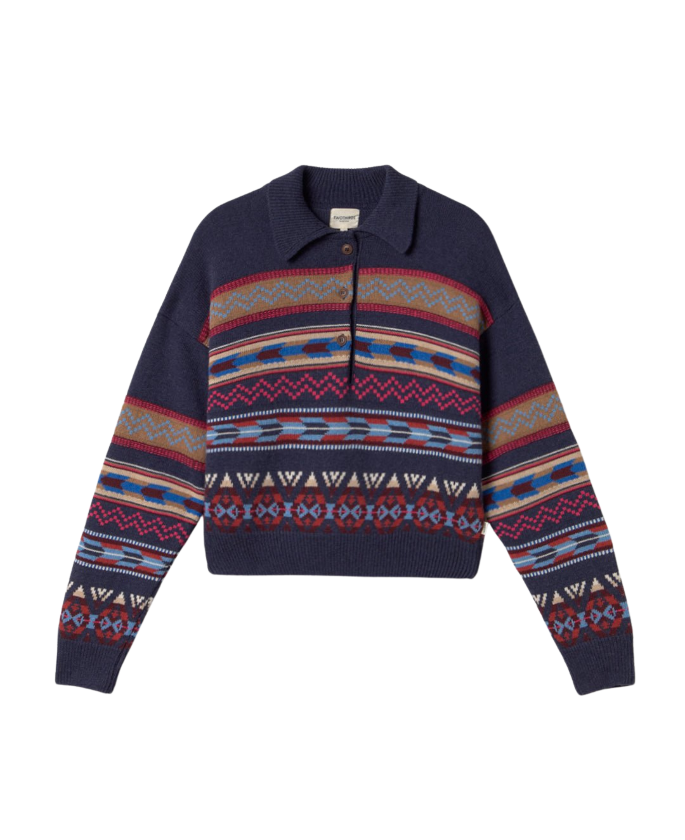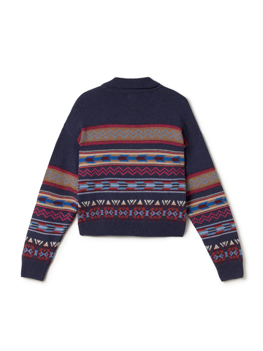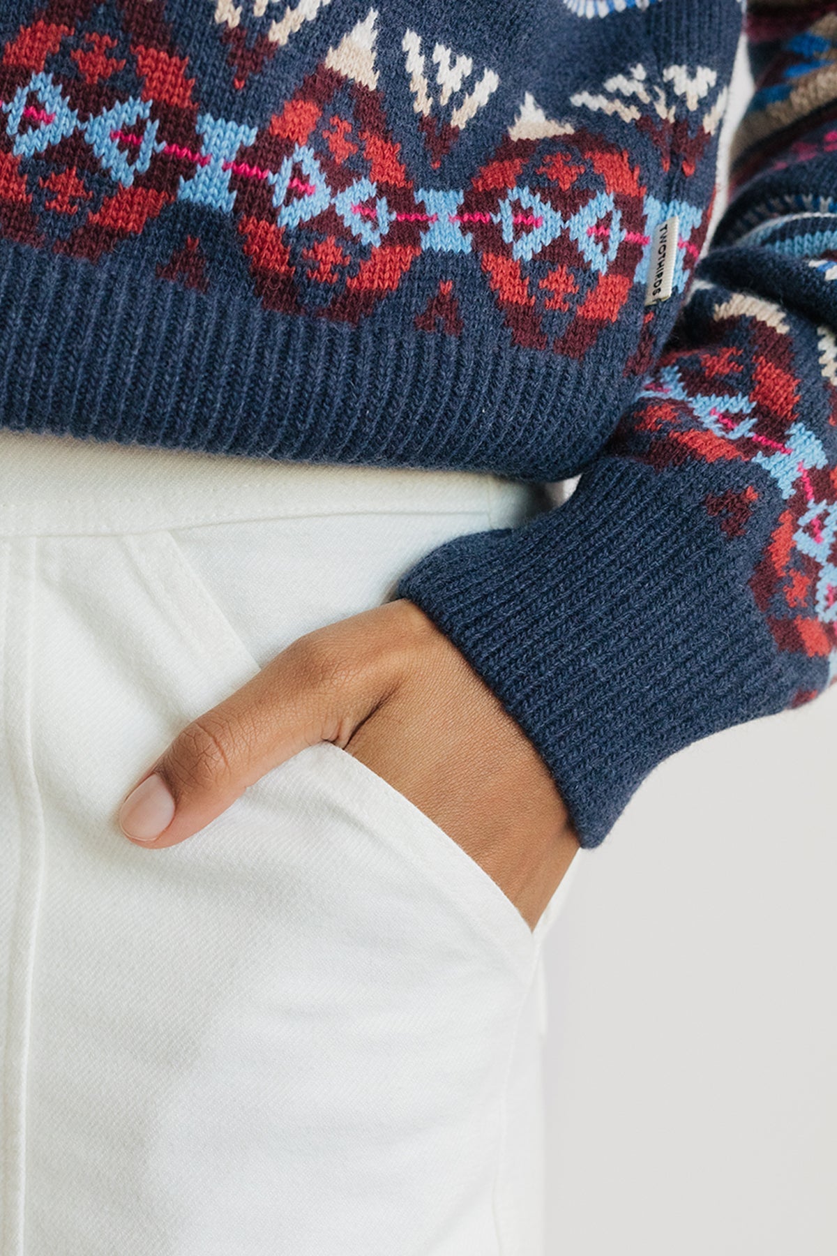 Su corte es ligeramente corto (crop), con hombros caídos y un cuello distintivo que aporta personalidad al diseño. Los botones con relieve “TWOTHIRDS” y el patrón jacquard reflejan la atención al detalle de la marca. Diseñado en Barcelona y fabricado en Portugal bajo procesos responsables, es una prenda ideal para el día a día o para elevar un look casual con un toque refinado.
