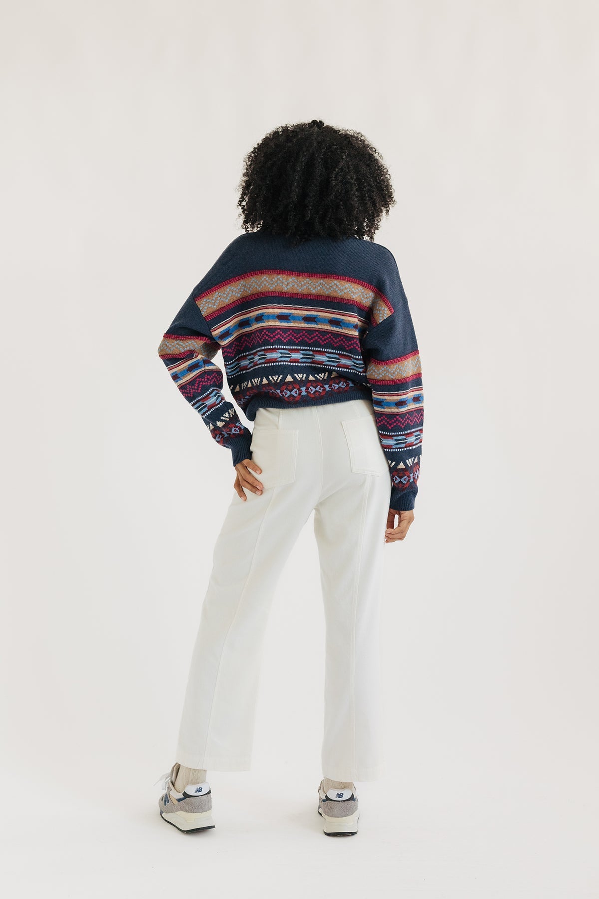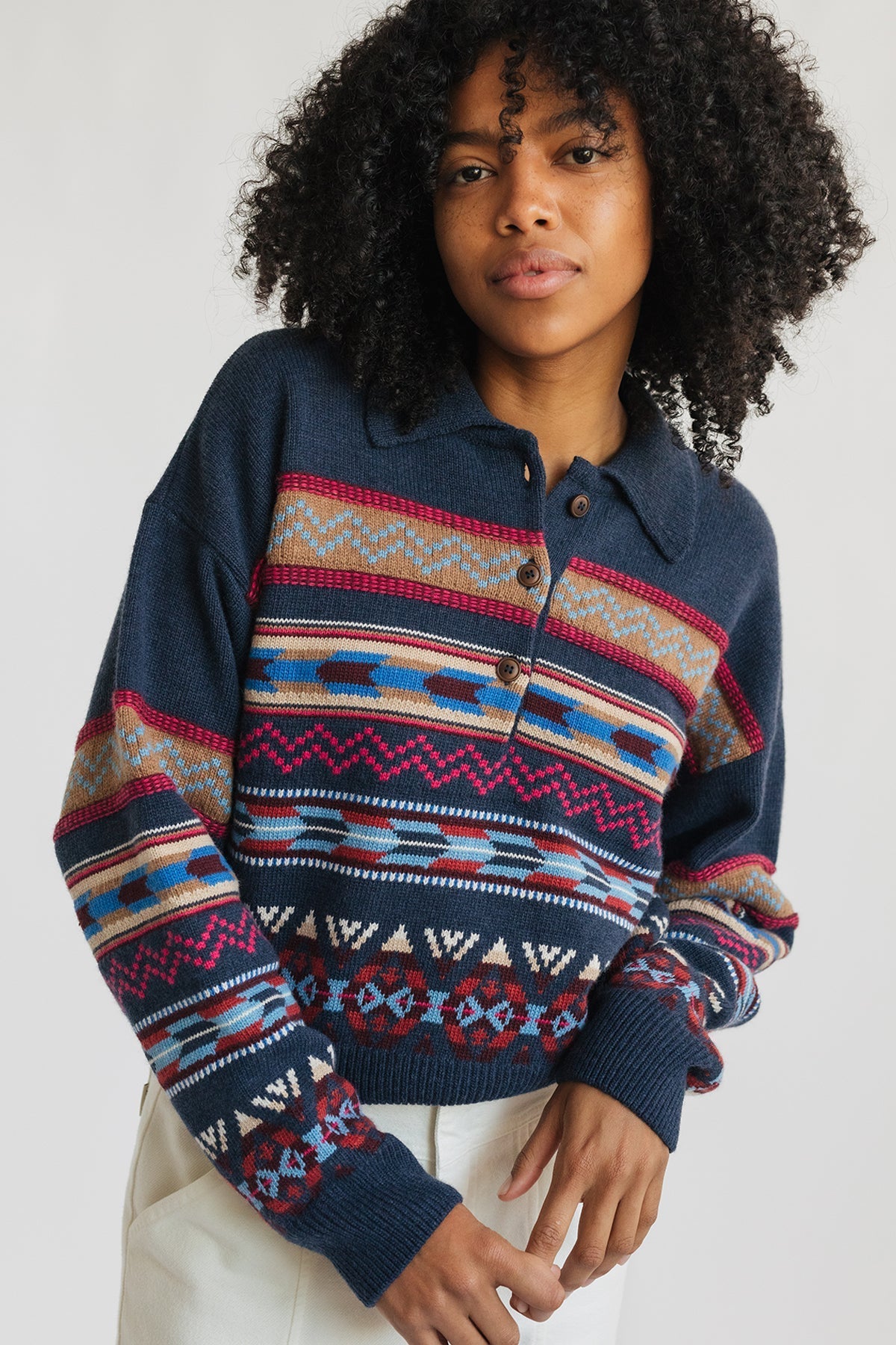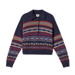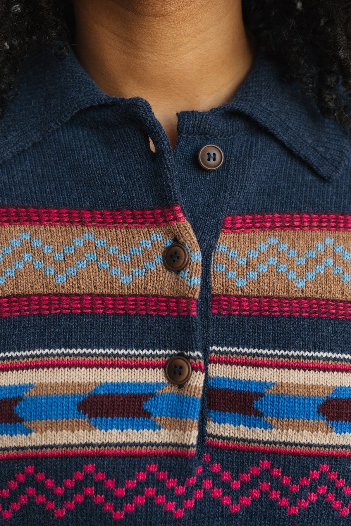 Su corte es ligeramente corto (crop), con hombros caídos y un cuello distintivo que aporta personalidad al diseño. Los botones con relieve “TWOTHIRDS” y el patrón jacquard reflejan la atención al detalle de la marca. Diseñado en Barcelona y fabricado en Portugal bajo procesos responsables, es una prenda ideal para el día a día o para elevar un look casual con un toque refinado.