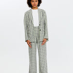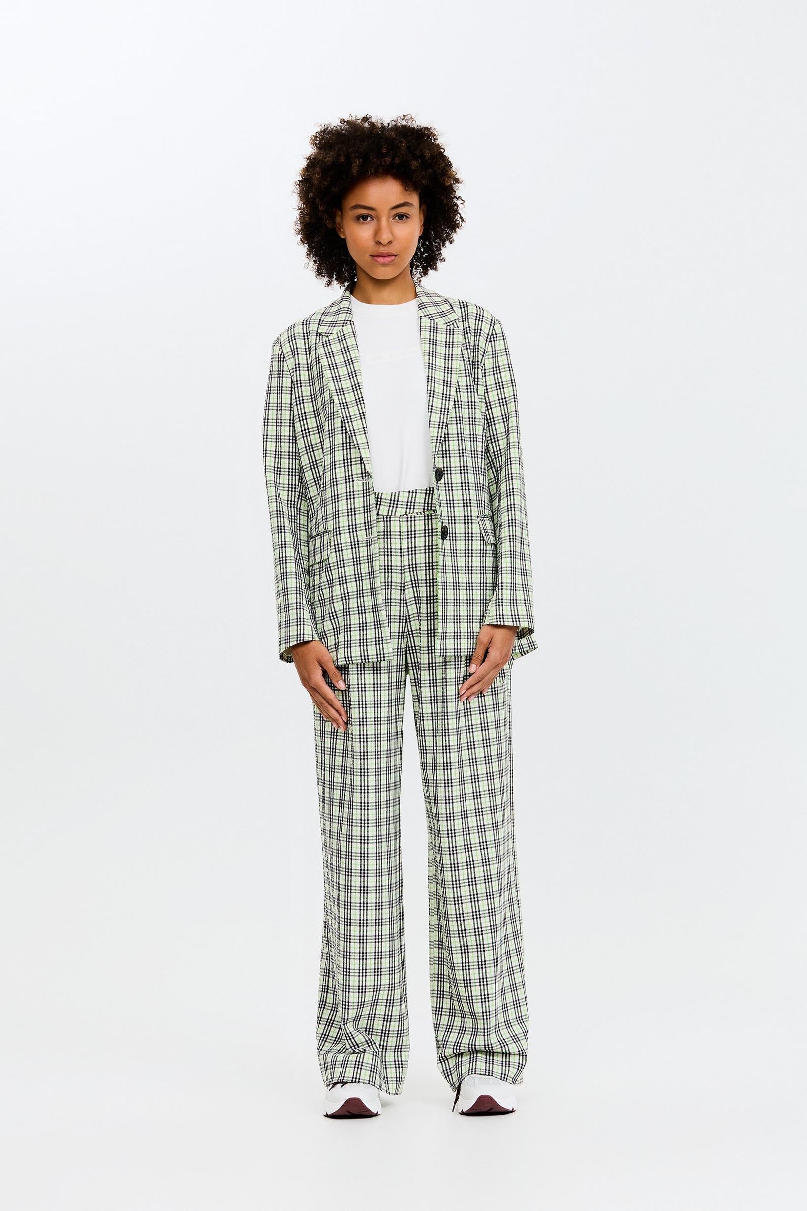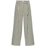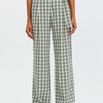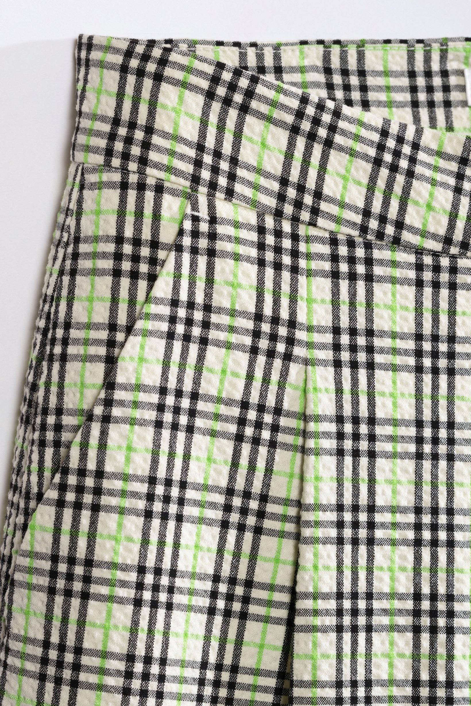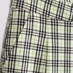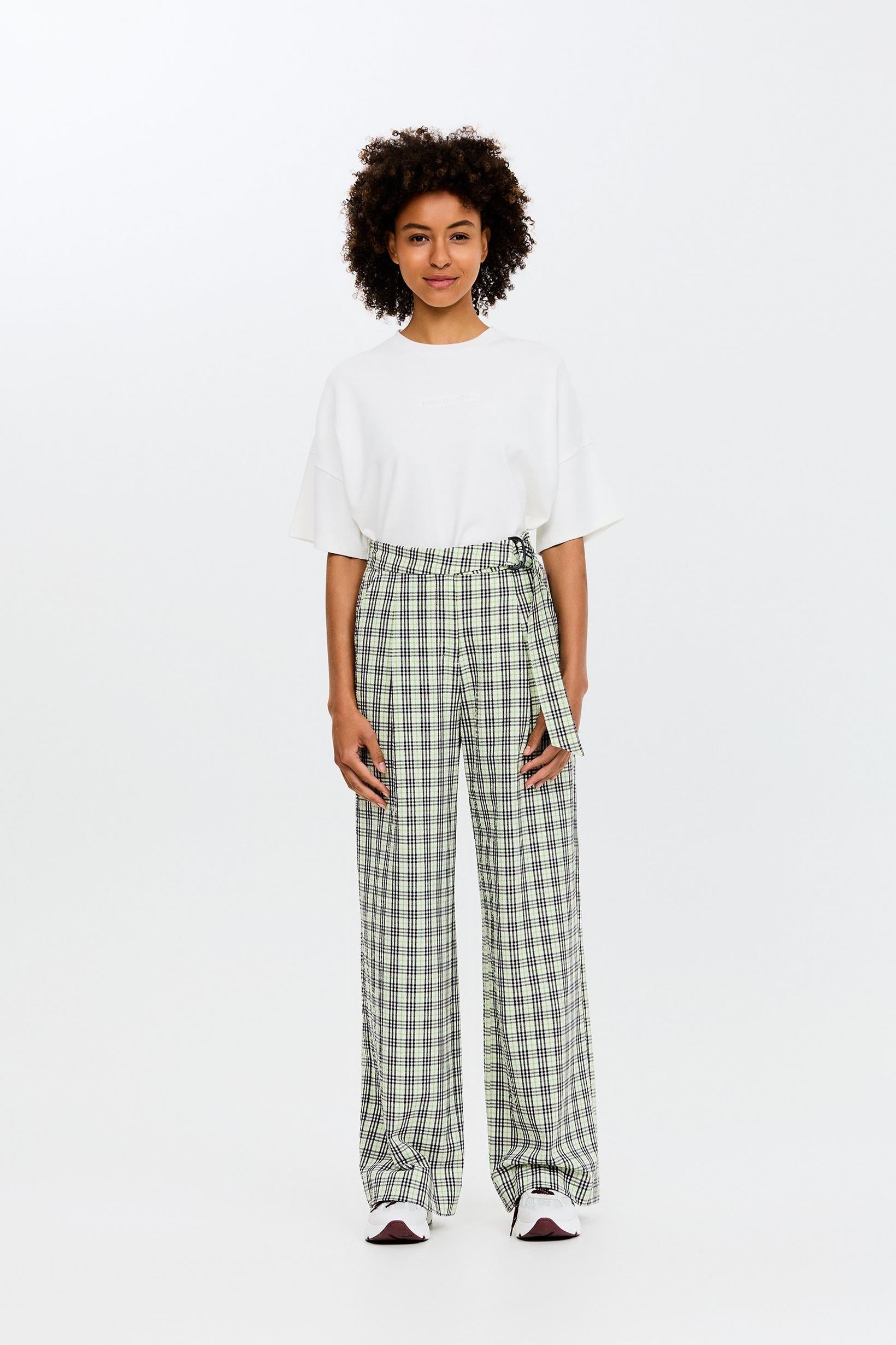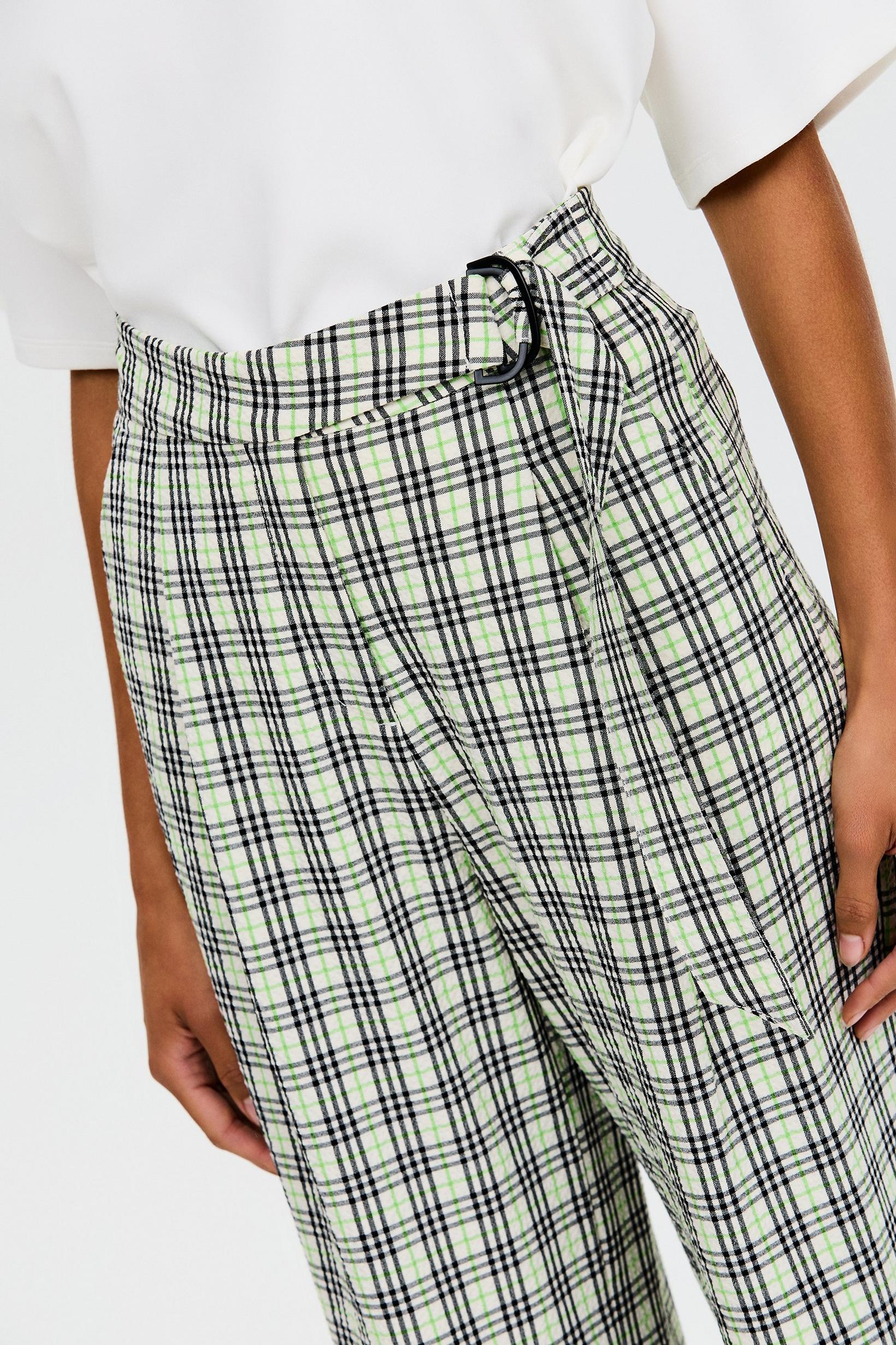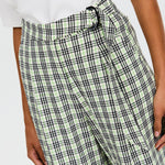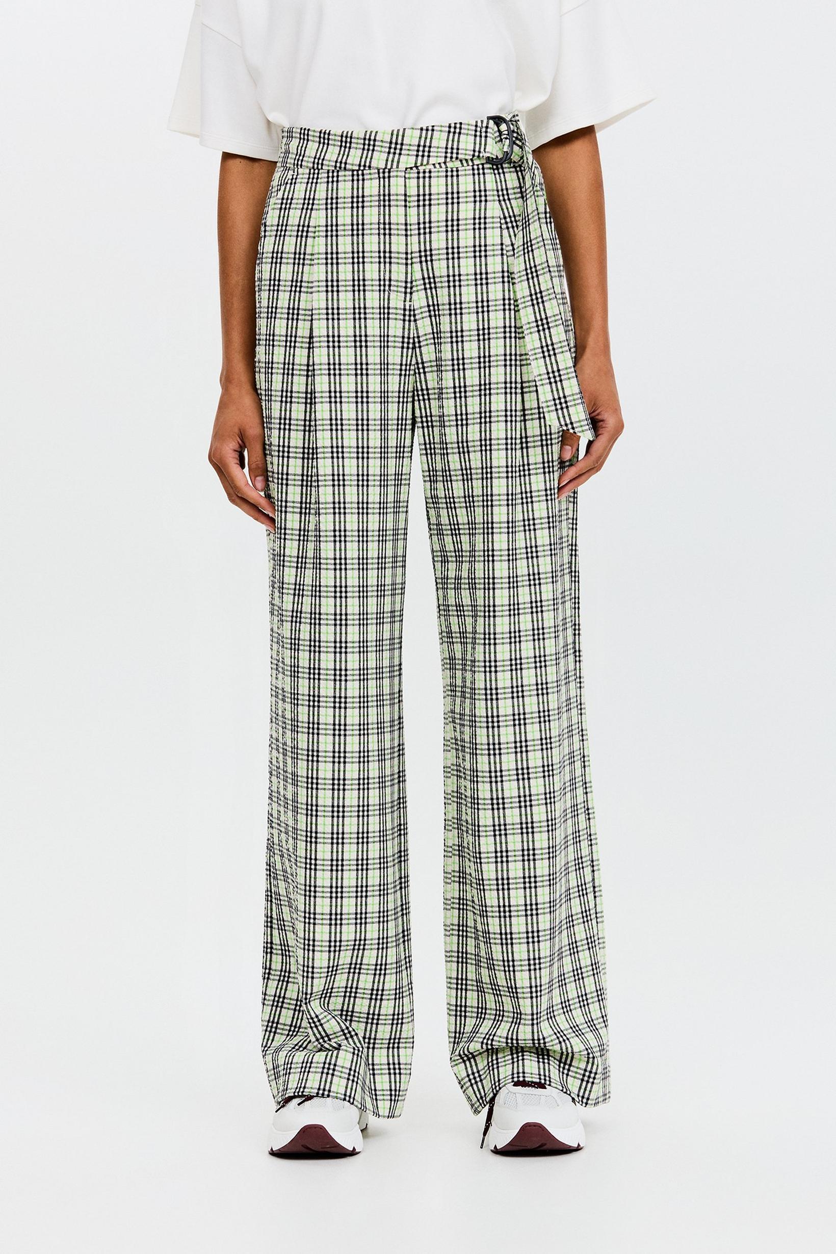 Estos pantalones anchos a cuadros para mujer son la base de un elegante conjunto llamativo. Un toque de color verde intenso le da a estos pantalones de cintura alta ese toque extra. Esta prenda tiene bolsillos y una hebilla en la cintura, y se puede llevar con la blusa a juego como conjunto.