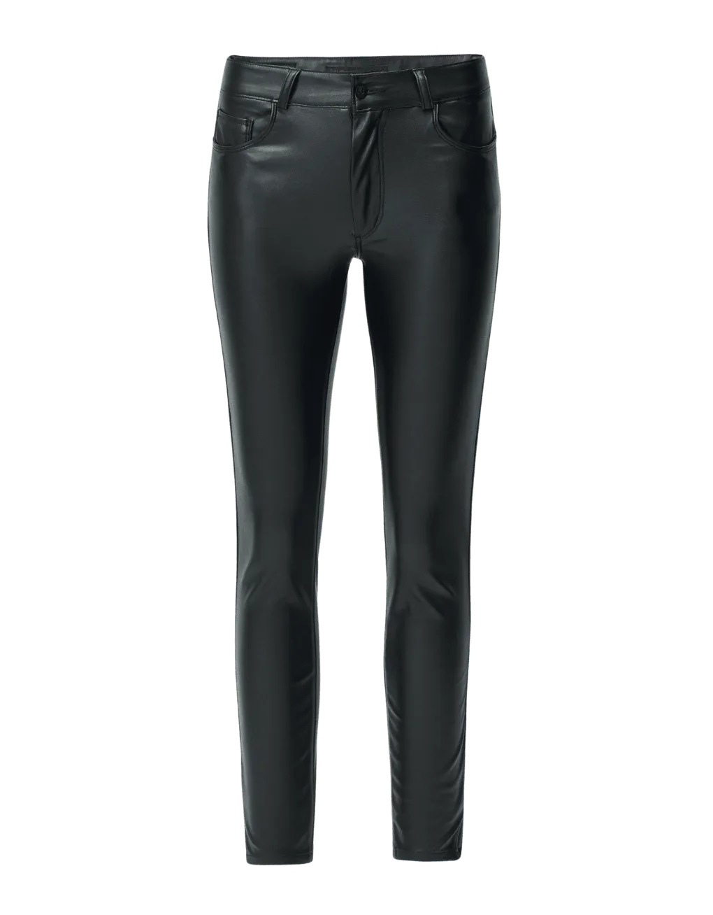 Hose in Lederoptik. Push-Up-Schicksal. Schwarz. Enges, verkürztes Bein. Hohe Taille. Mit Reißverschluss. Fünf Taschen. Mit Clips. Öffnungsdetail unten.