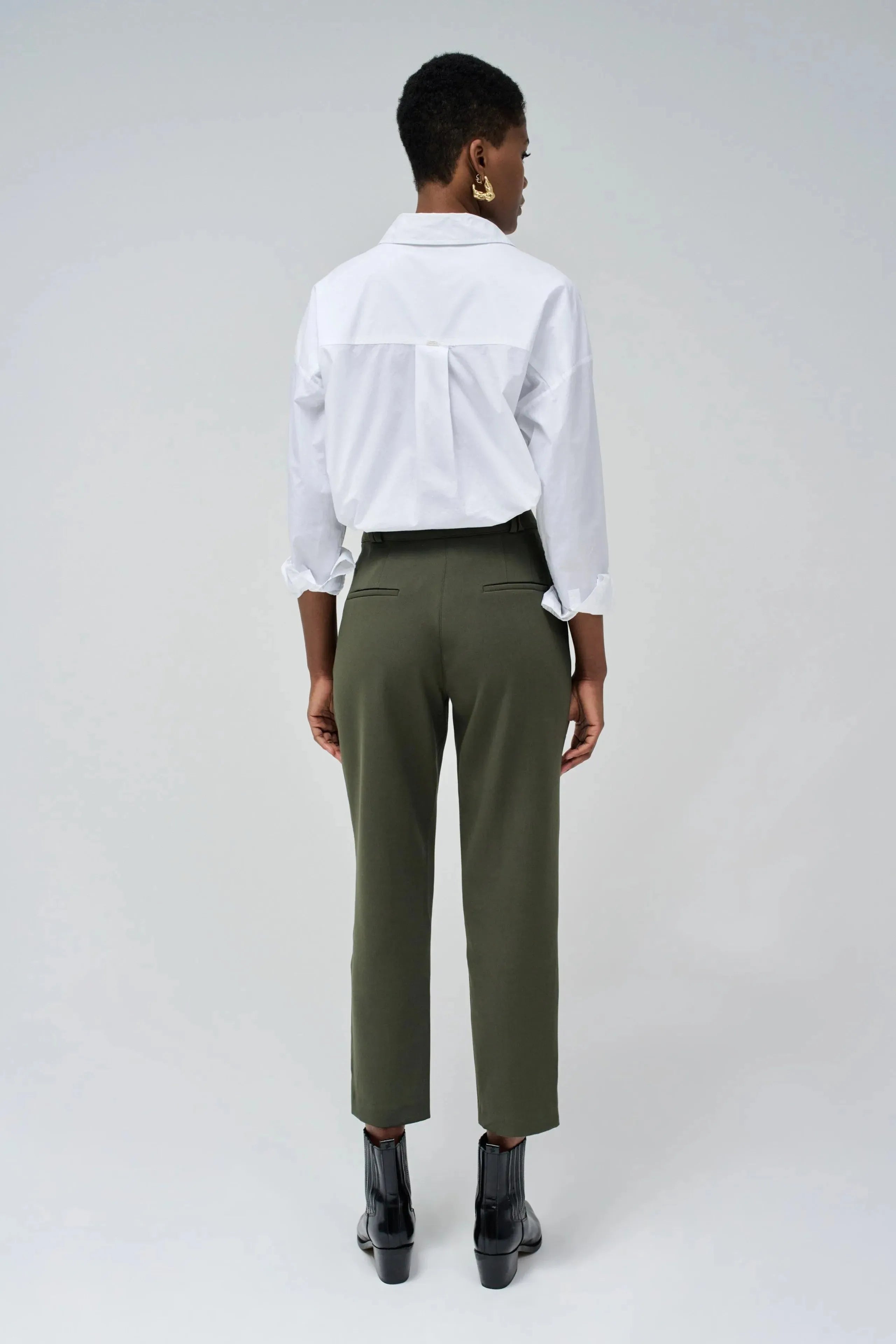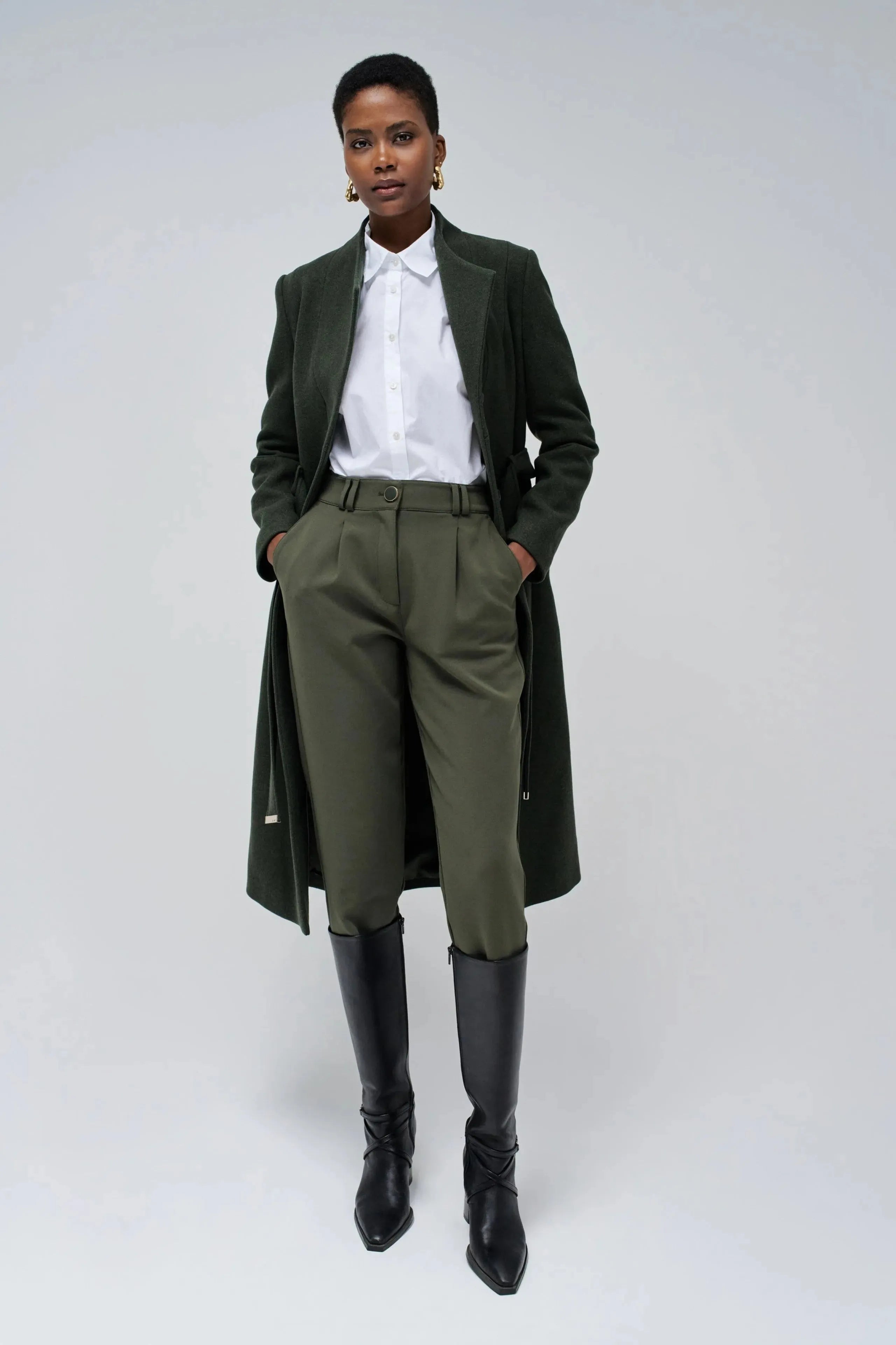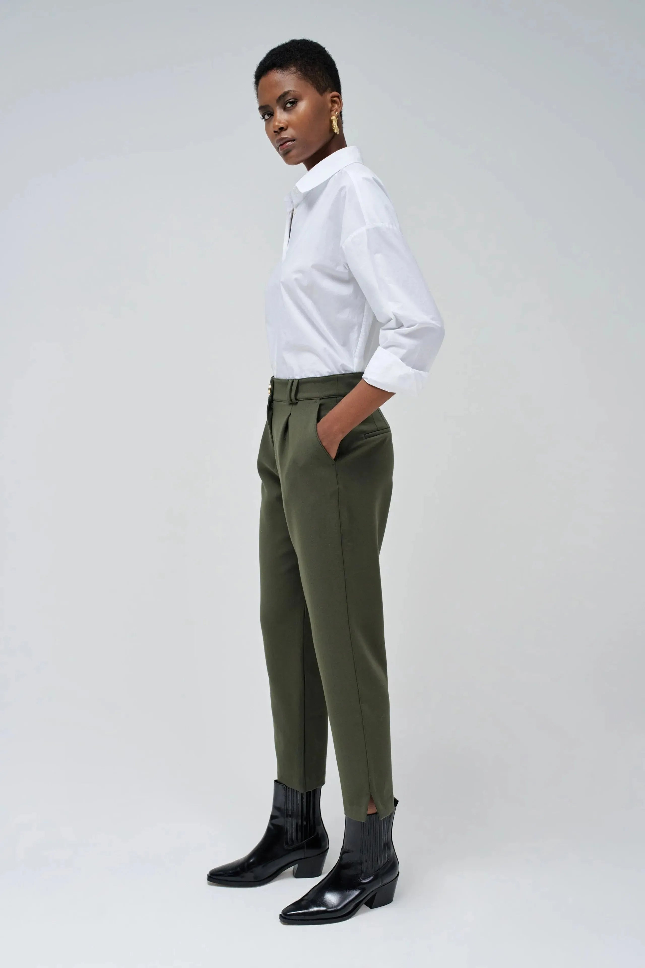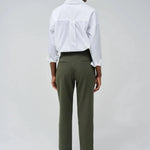 Verleihen Sie Ihrer Garderobe mit dieser grünen Webhose einen modernen Touch. Mit ihrer schmalen Passform und dem schmalen Bein bietet sie eine stilvolle und moderne Passform. Der hohe Bund mit Gürtelschlaufen und der grüne Reißverschluss mit Knopf sorgen für ein elegantes Finish. Zwei Fronttaschen sorgen für zusätzliche Funktionalität und Stil.