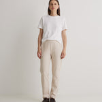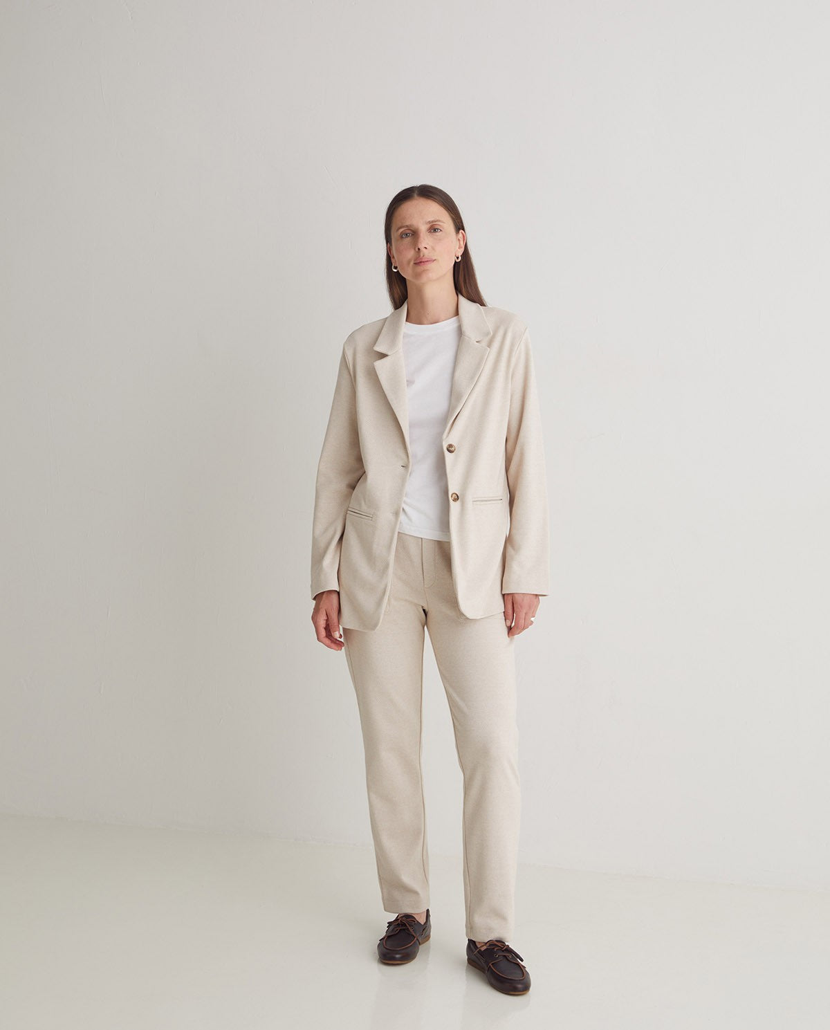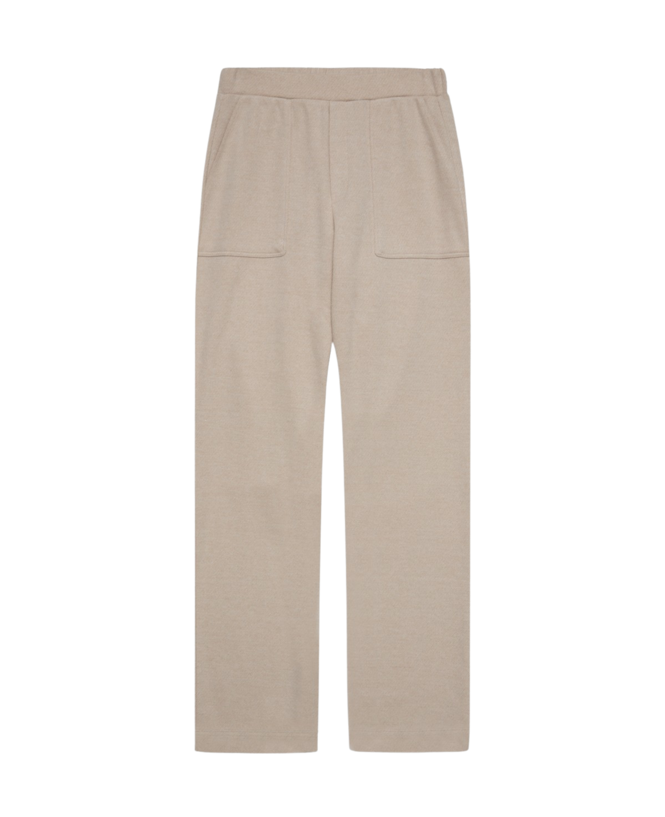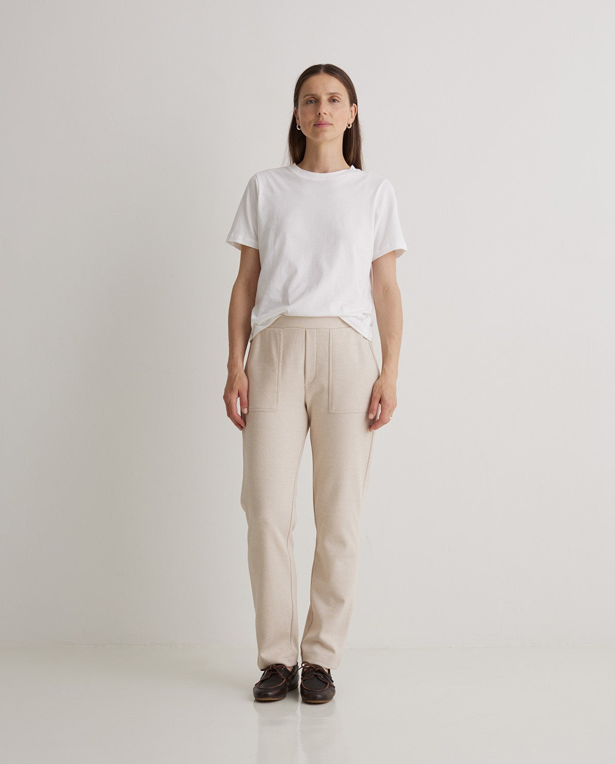 Pantalón recto de punto. Estampado de micro rayas. Diseño afranelado. Regular fit. Sin cierre. Cintura elástica. Dos bolsillos frontales y 2 bolsillos traseros de vivo con botón.