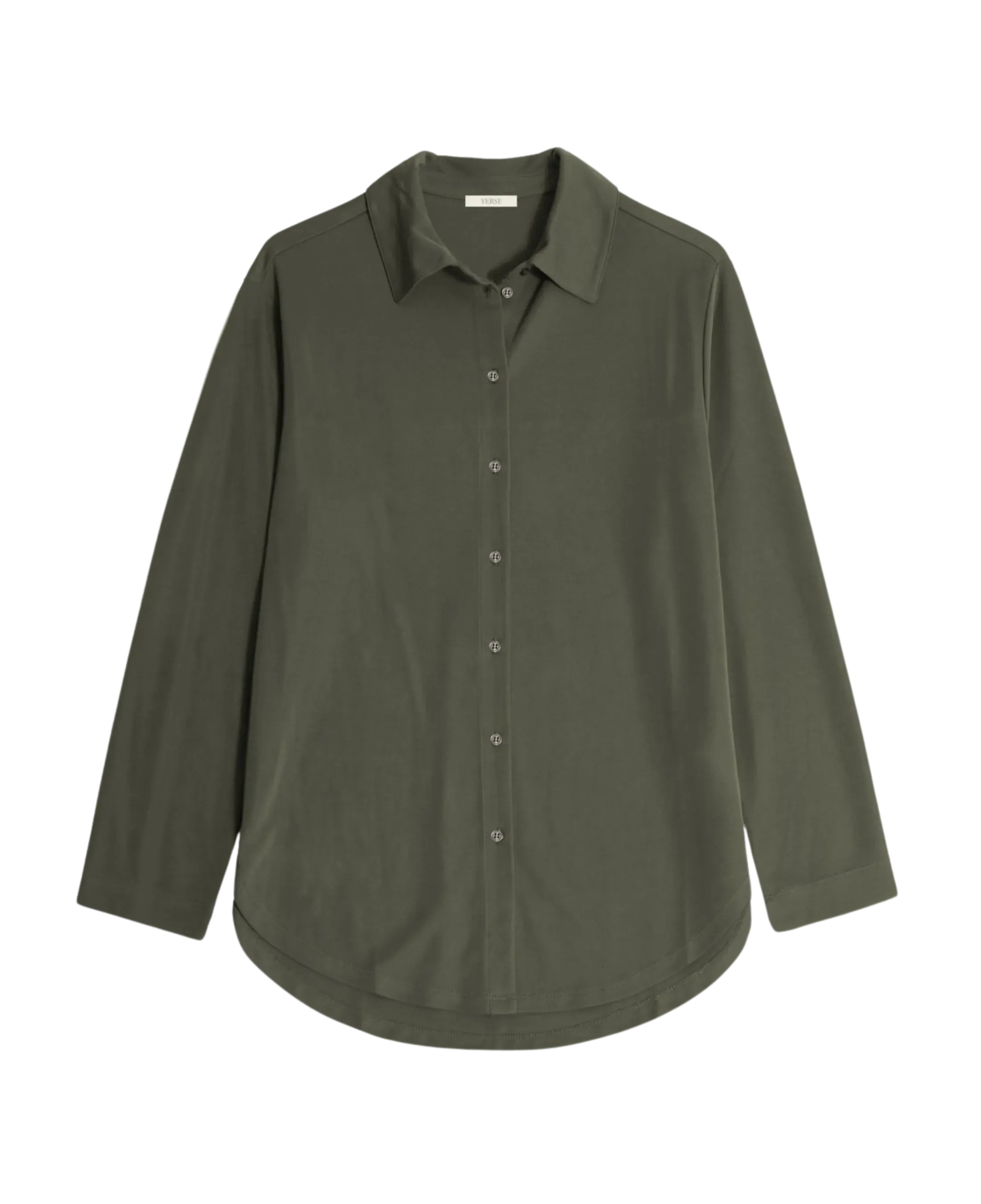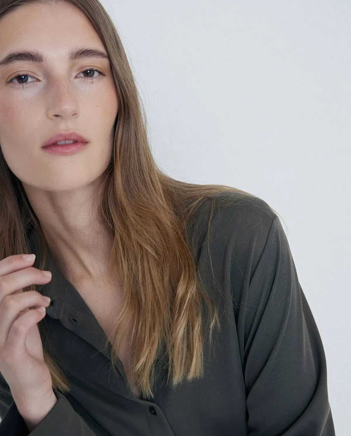 Fließendes Hemd. Hemdkragen. Lange Ärmel. Knopfverschluss vorne.