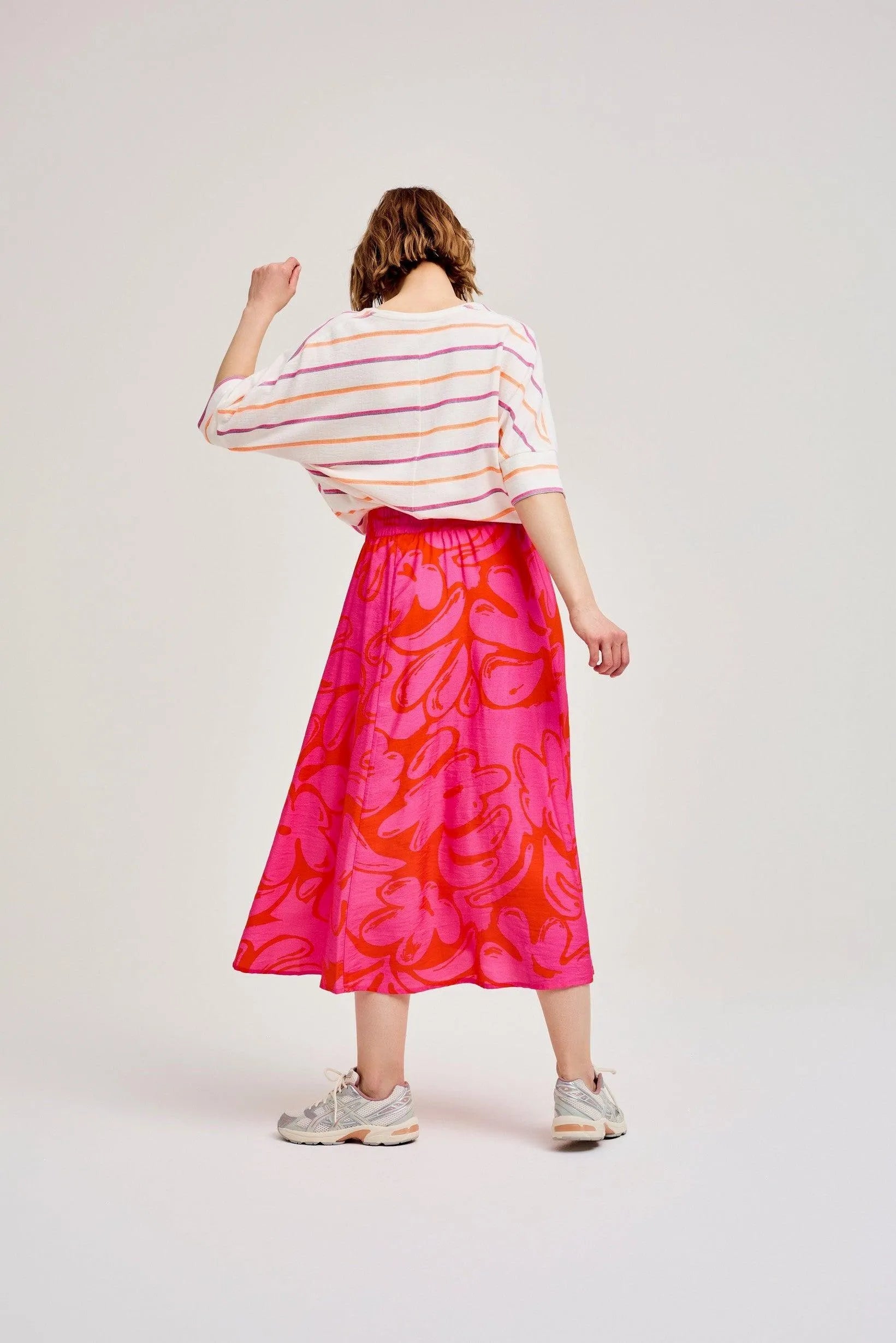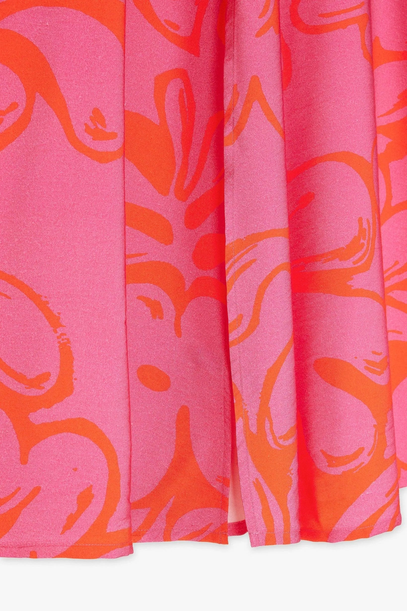 Rosafarbener Midirock für Damen mit elastischem Bund, Öffnung und selbst entworfenem Blumendruck. Dieses Kleidungsstück besteht unter anderem zu 89 % aus Modal.