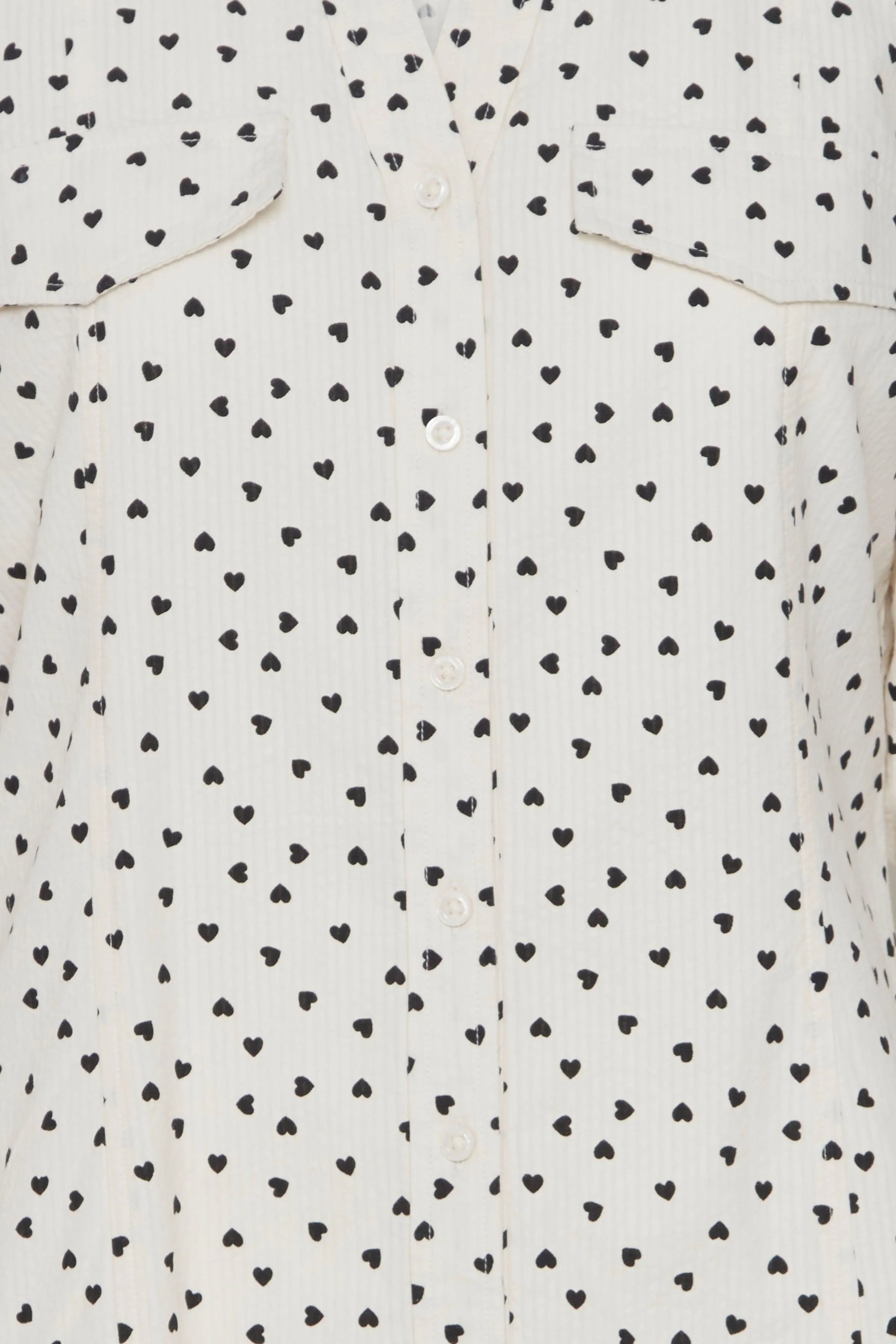ICHI-Kleid mit Ellbogenärmeln und schwarzem Herzdruck auf weißem Hintergrund.