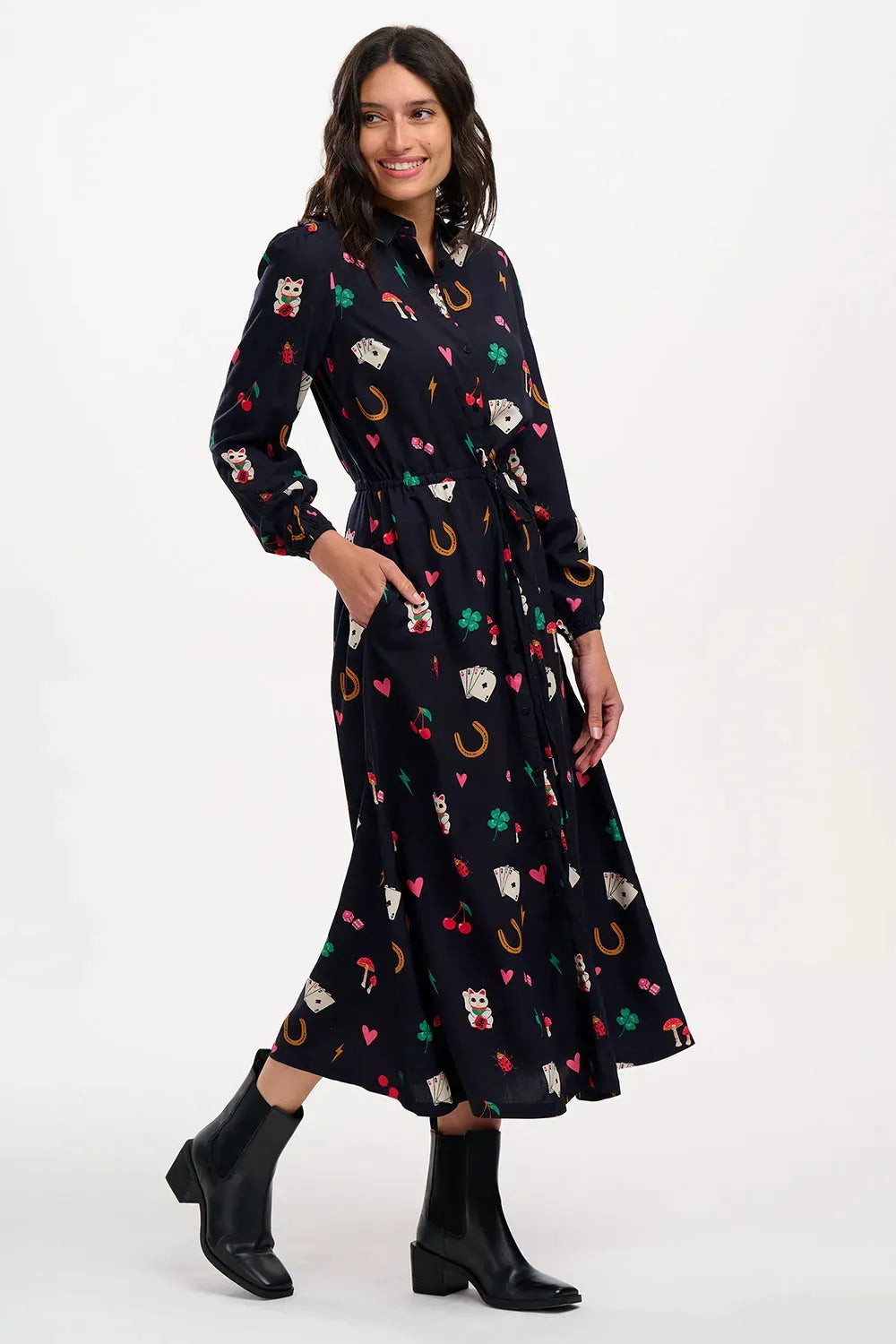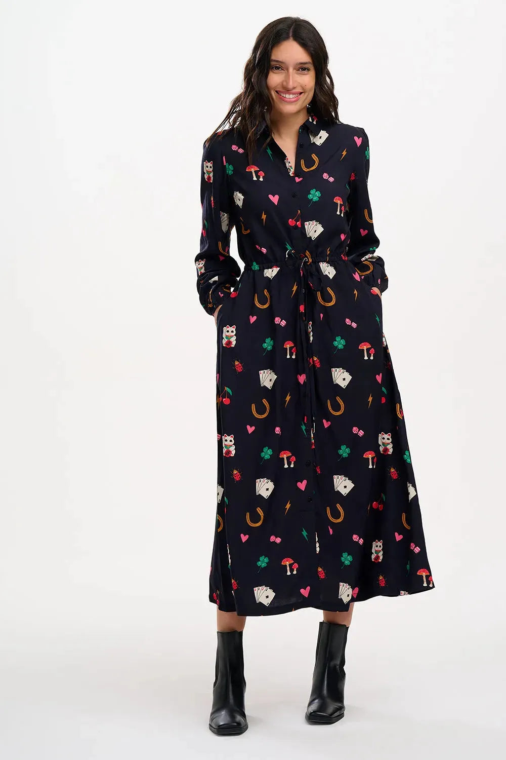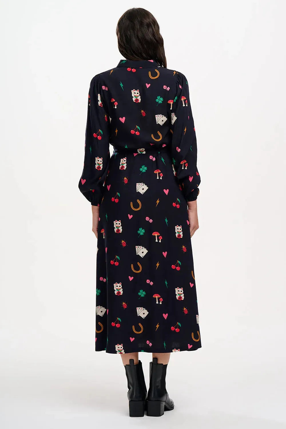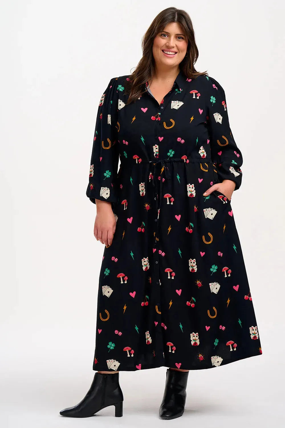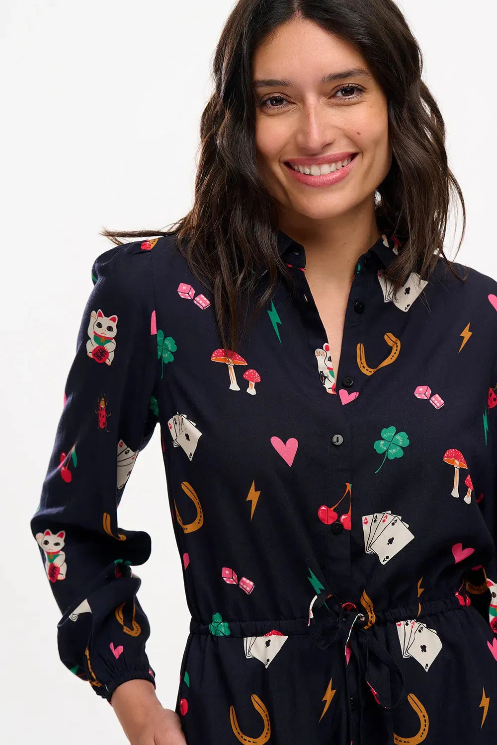 Das neue Dottie vereint die klassische Form eines Hemdblusenkleides. Der Dottie-Stil verfügt über eine Button-Down-Vorderseite, einen weichen Hemdkragen und einen schmeichelhaften Kordelzuggürtel, der mit einem mittellangen Rock kombiniert wird. Mit dem neuen Lucky Charms-Aufdruck aus Kirschen, Katzen, vierblättrigen Kleeblättern, Herzen, Blitzen und Spielkarten auf schwarzem Hintergrund.