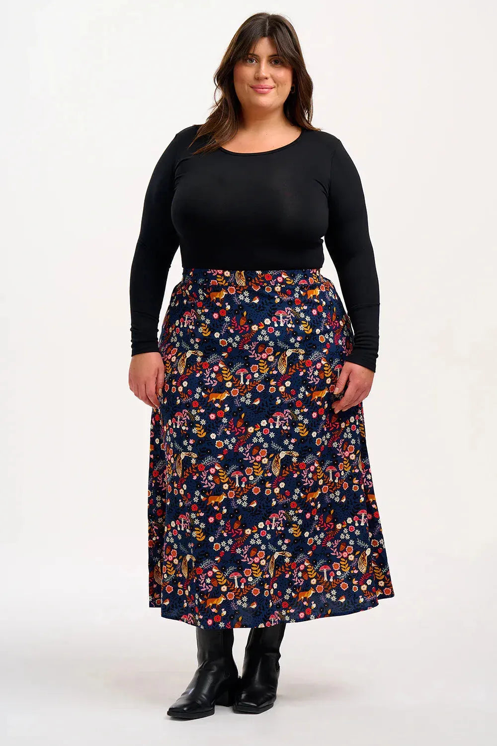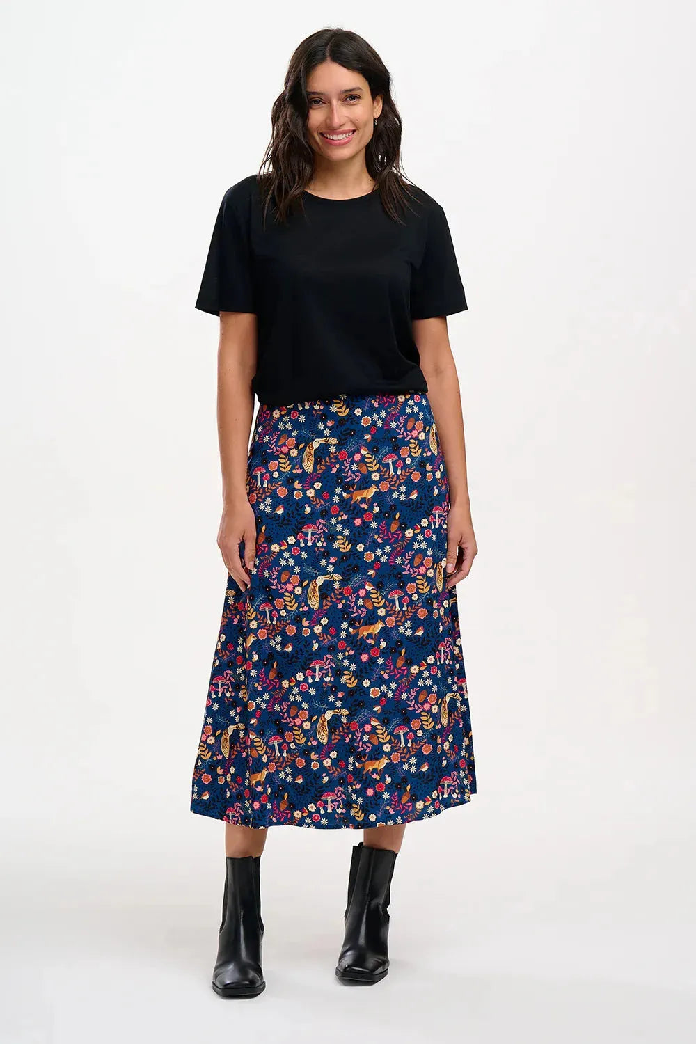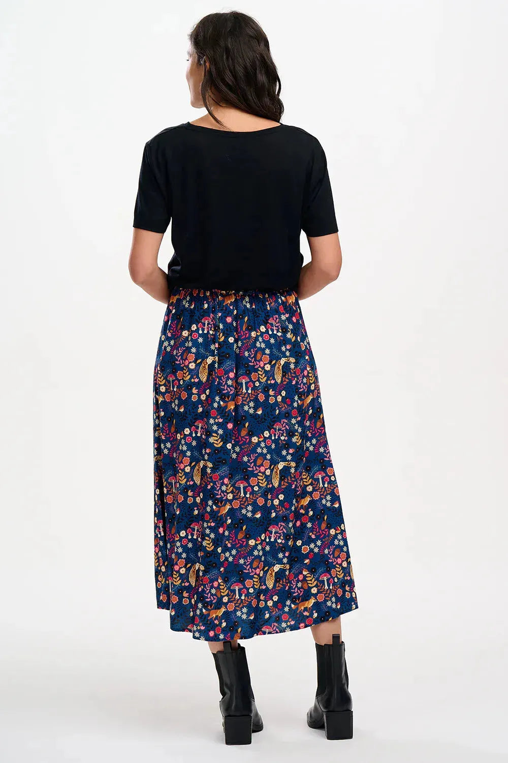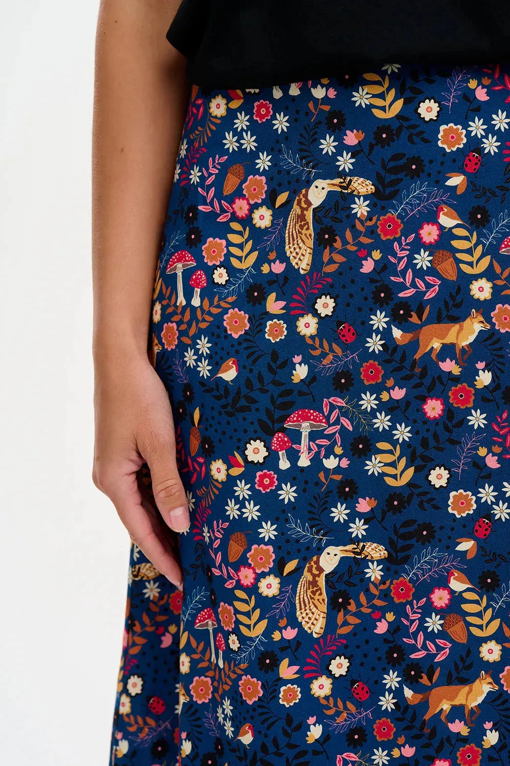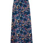 Der Zora-Midirock in A-Linie ist in der Taille tailliert und verfügt über eine flache Vorderseite und einen elastischen Rücken für eine flexible, bequeme Passform. Der Viskosestoff ist leicht und atmungsaktiv, sodass Sie ihn den ganzen Tag bequem tragen können. Mit dem neuen Midnight Woodland Navy-Print aus Blumen, Fauna und Pilzen auf dunkelblauem Grund.