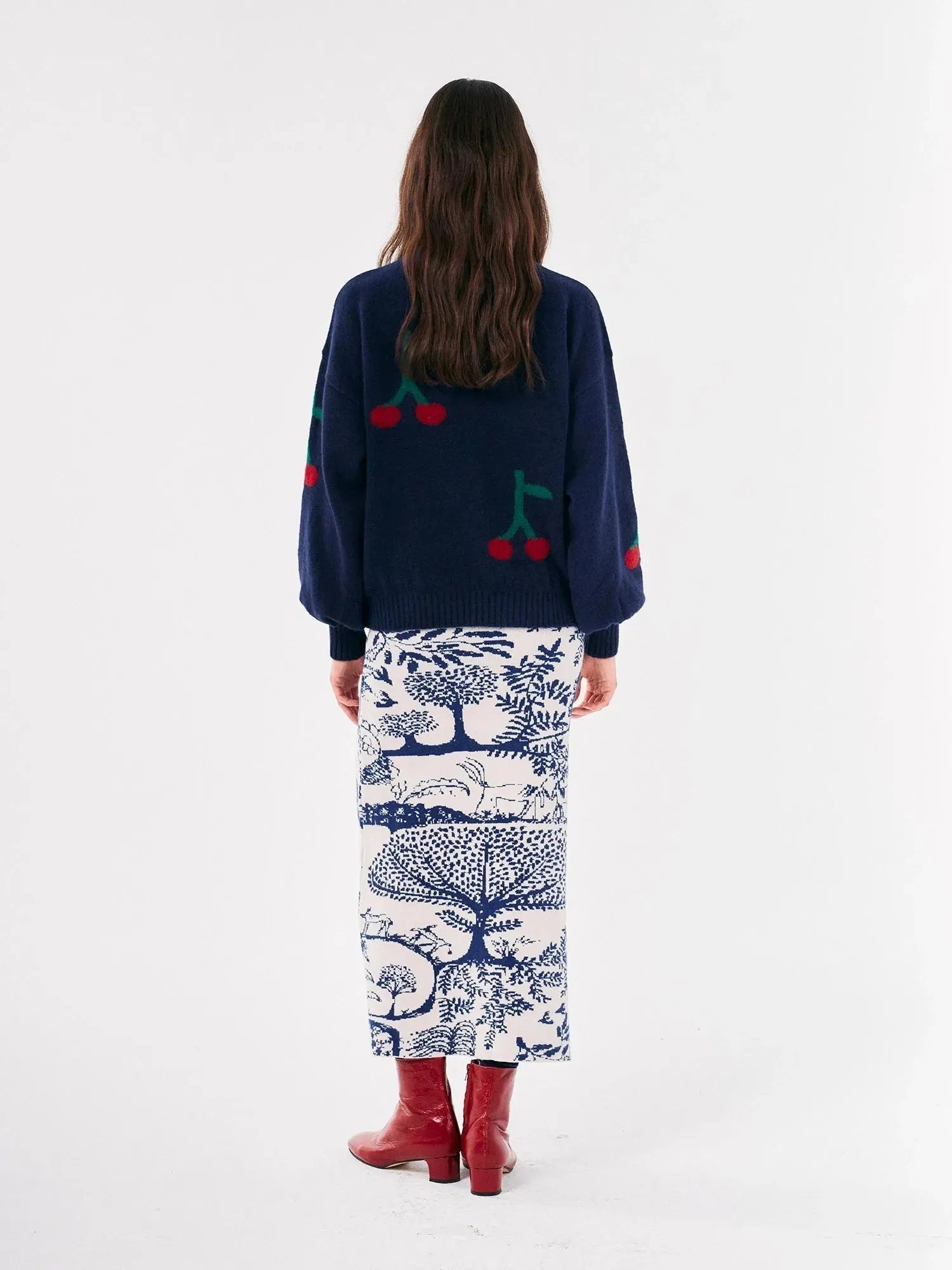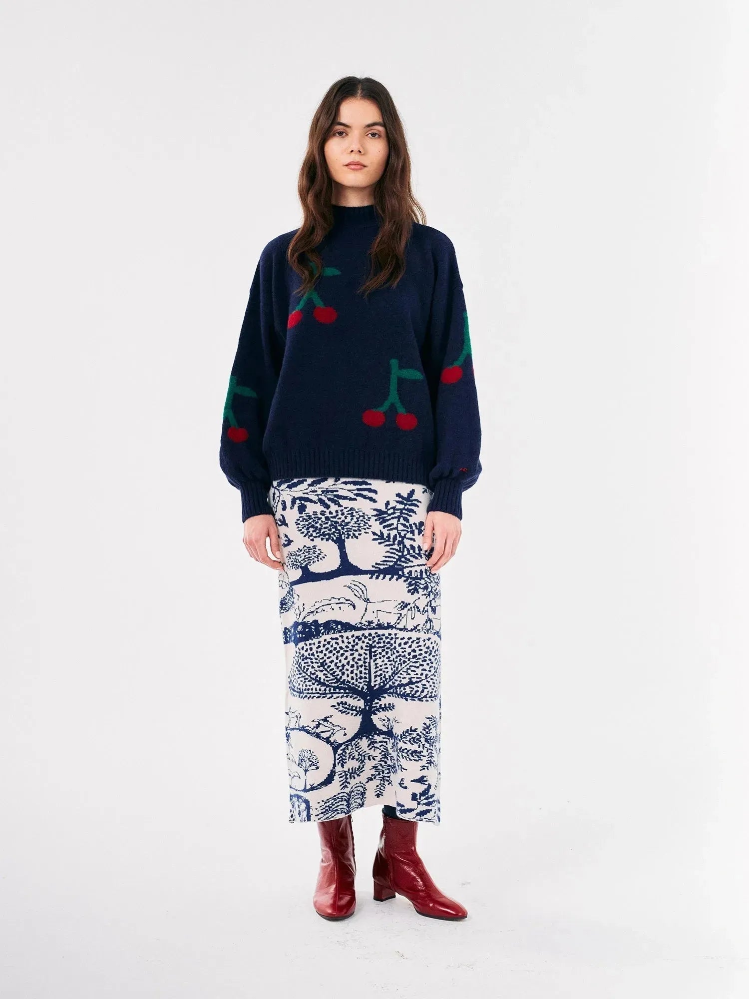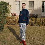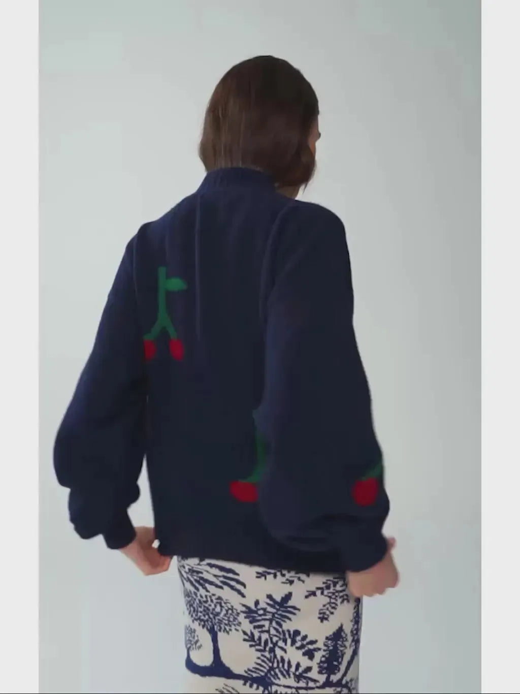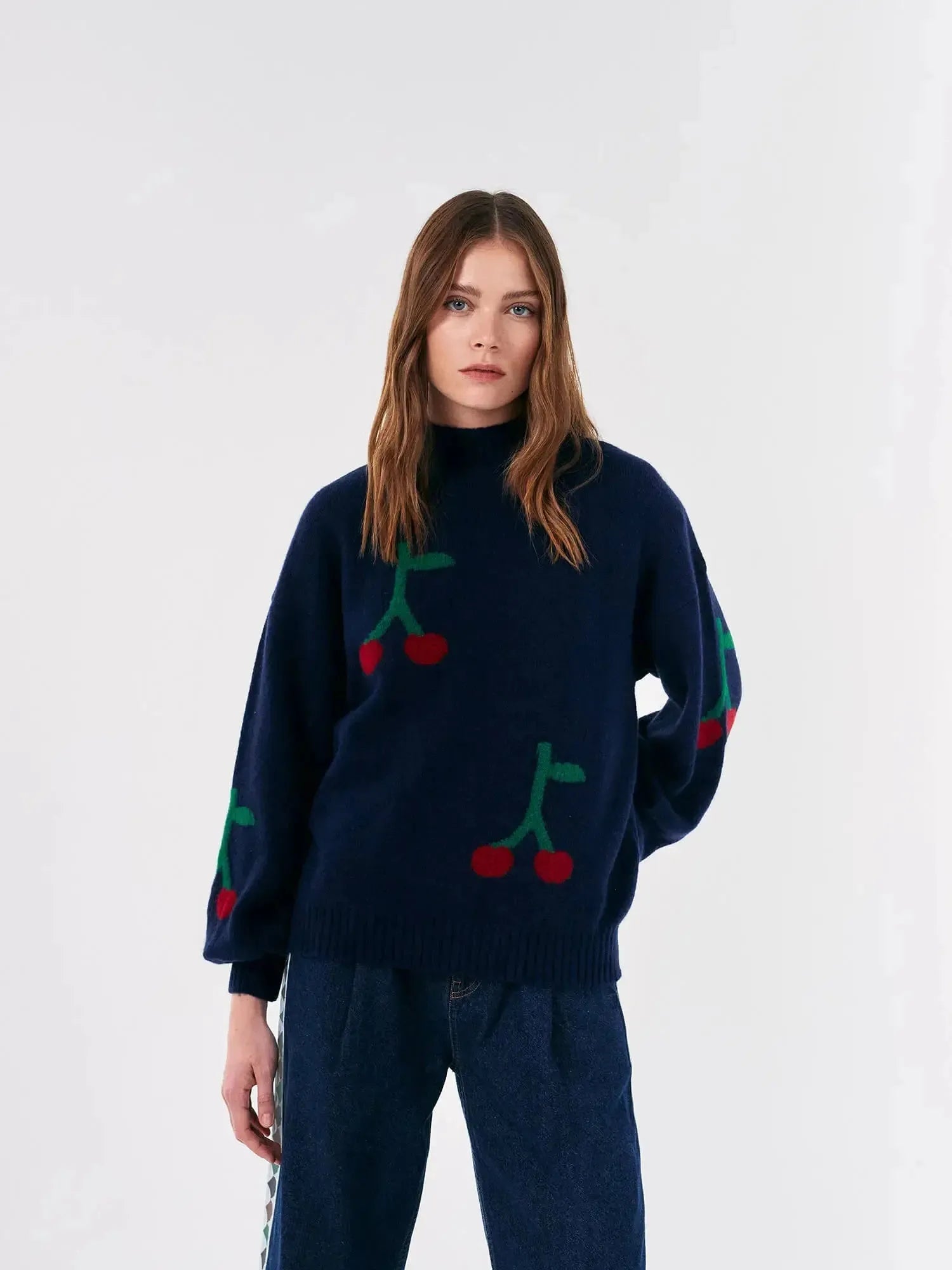Dieser marineblaue Rollkragenpullover präsentiert sich mit einem lustigen roten Kirschen-Print. Er besteht aus einer Mischung aus Acryl, Polyamid, Merinowolle und Elasthan und bietet Ihnen so Wärme und Komfort für jeden Anlass, von der Straßenparty bis zur festlichen Veranstaltung. Er hat eine lockere Passform und überschnittene Schulternähte.