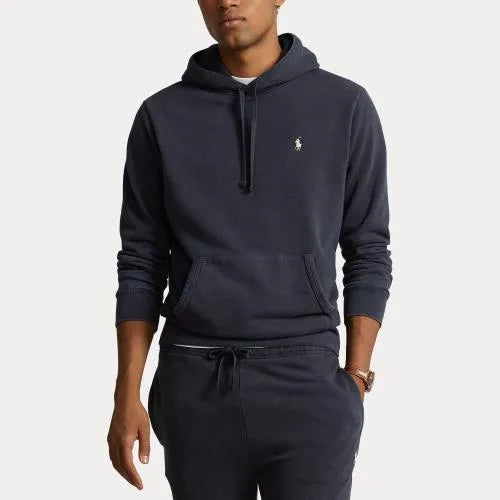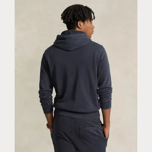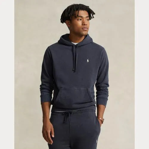 Dieser Baumwoll-Hoodie besteht aus leichterer Baumwolle als unser Fleece, wurde speziell behandelt, um ihm einen Vintage-Look zu verleihen, und verfügt über eine weiche Frottee-Innenseite. Auf der Brust ist unser symbolträchtiges Pony aufgestickt.