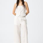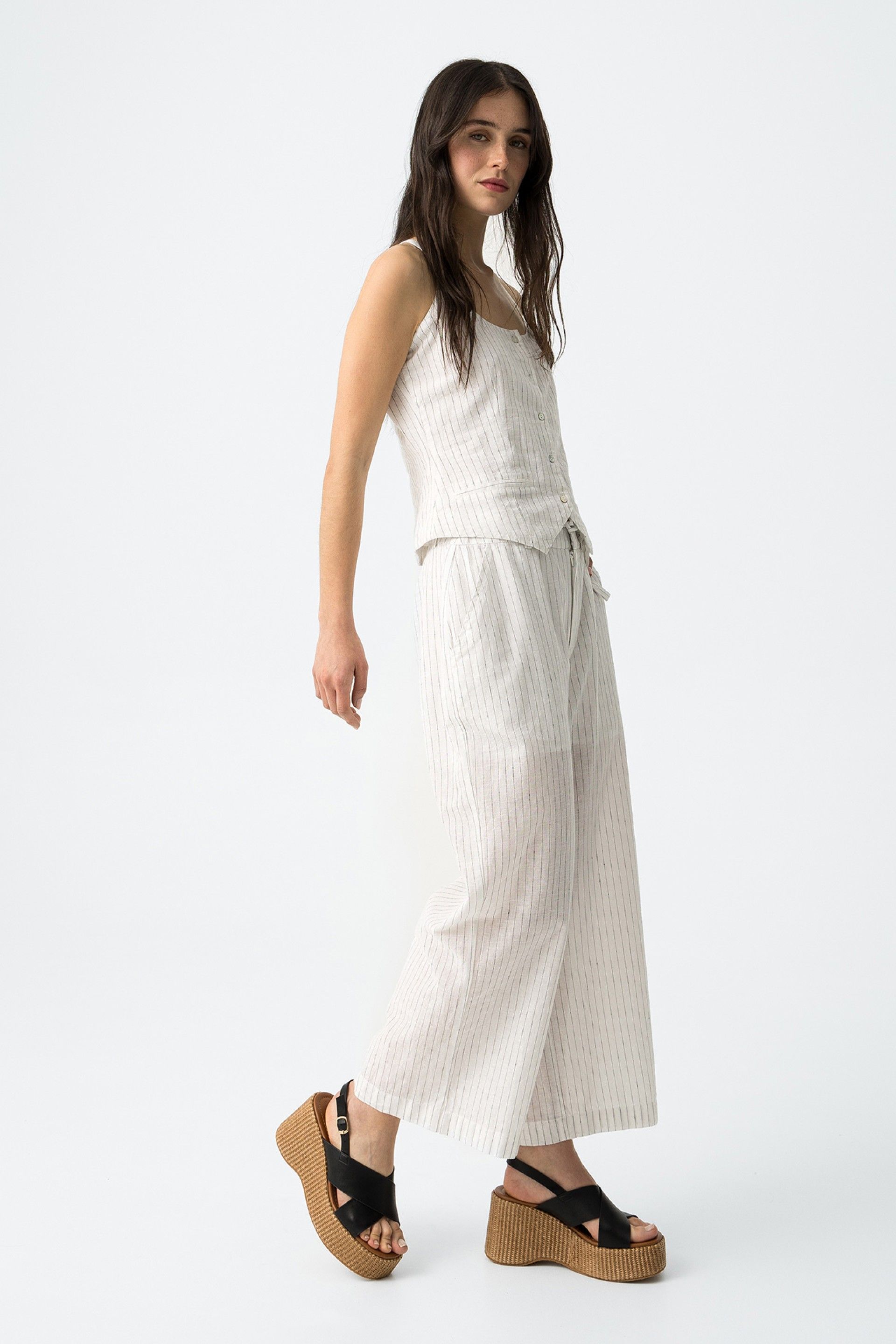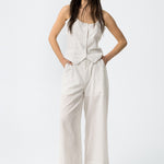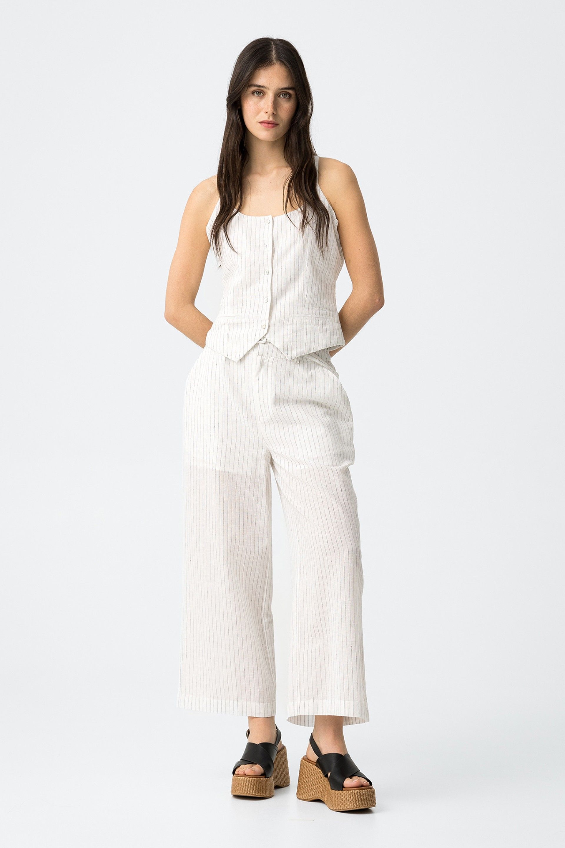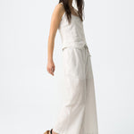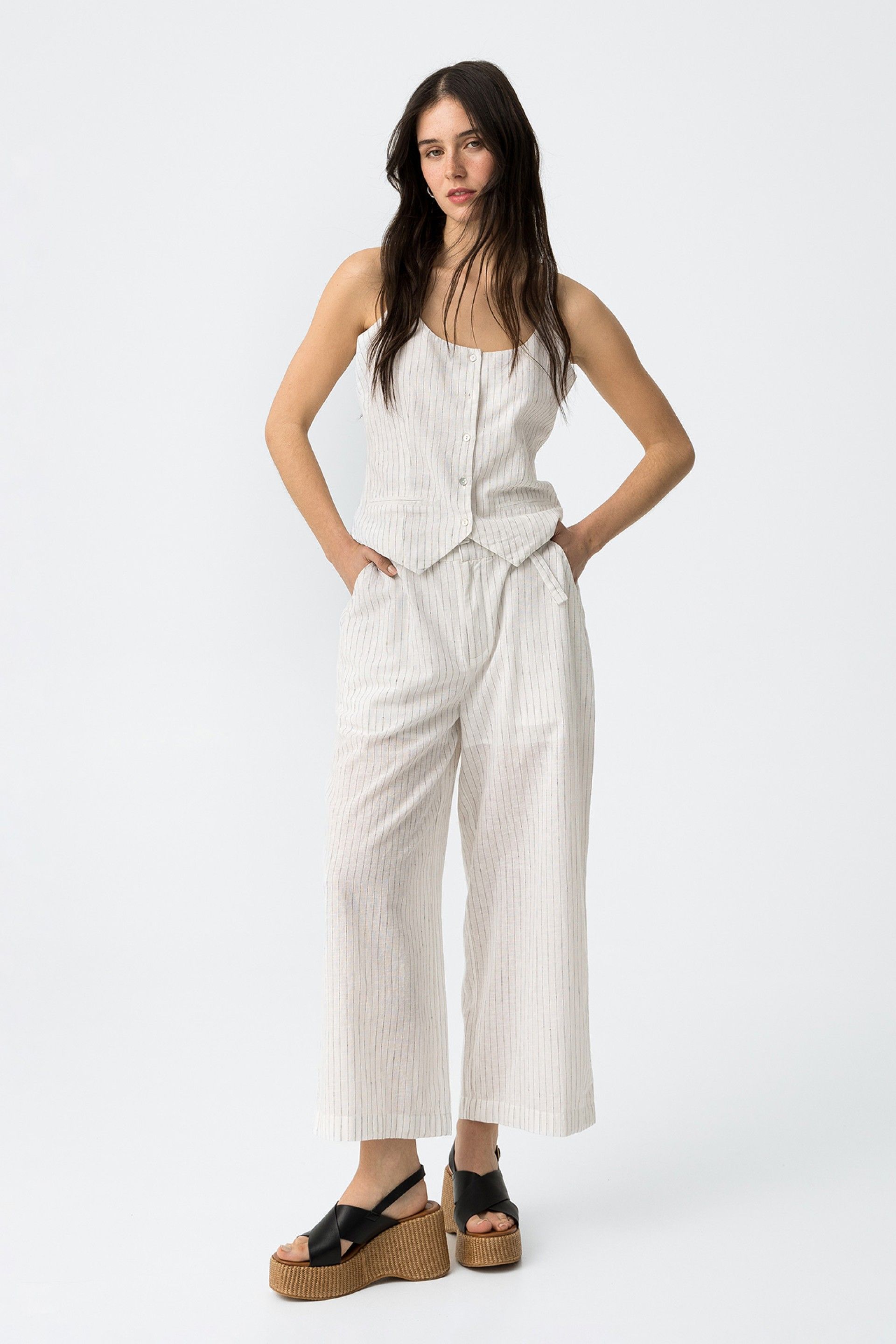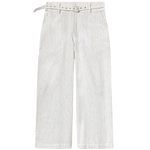 Hose mit mittelhohem Bund und appliziertem Gürtel. Reißverschluss vorne mit Metallhaken und einem Knopf an der Innenseite.