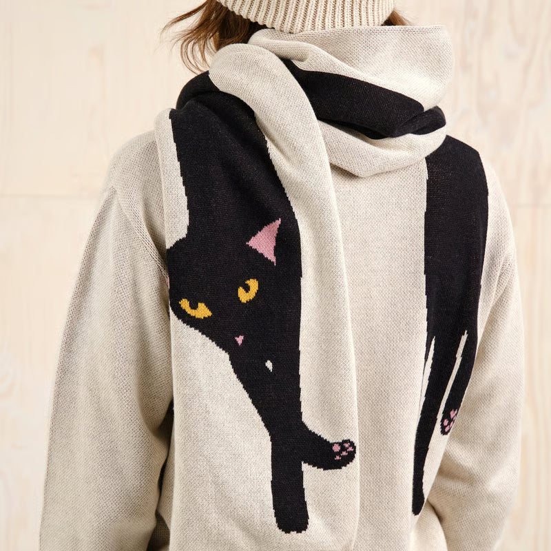 La écharpe Rossberga Long Cat de Dedicated Brand mezcla materiales sostenibles, diseño gráfico y funcionalidad en una pieza de carácter. Tejida en punto jacquard 12 gauge con 100 % algodón orgánico, ofrece suavidad, estructura ligera y una textura de calidad.