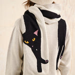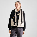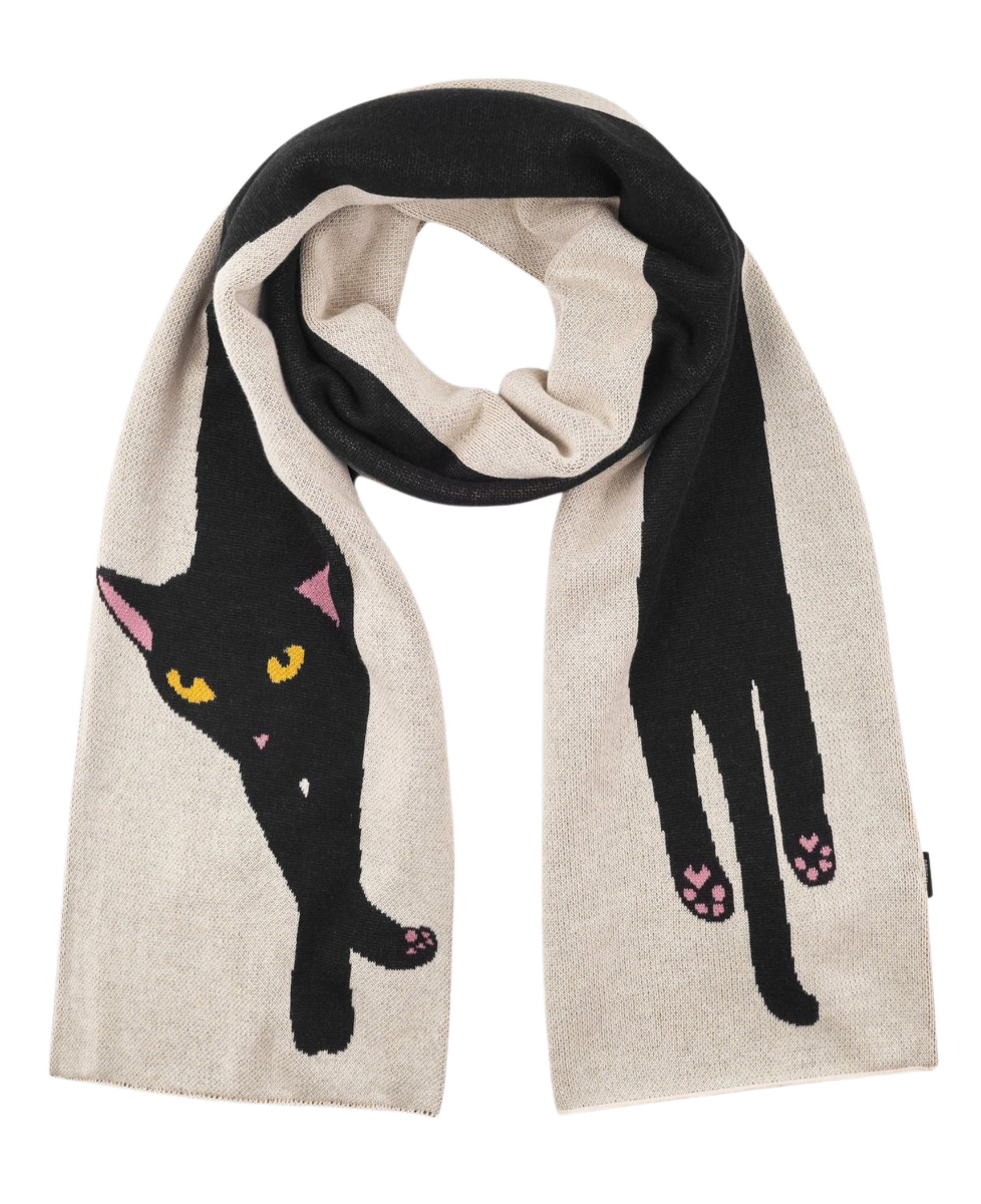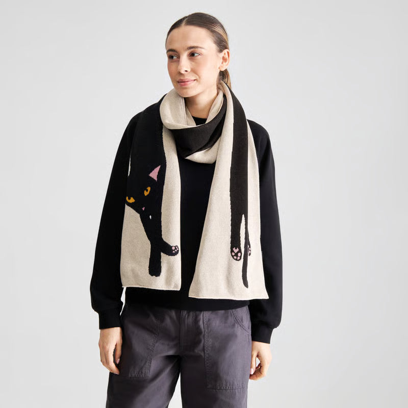 Su diseño “long” permite múltiples estilos de uso: colgada al cuello, con doble vuelta o incluso estilo chal, aportando volumen y presencia. El estampado “Cat” añade un toque lúdico y distintivo sin sacrificar la versatilidad. El tono Vanilla White combinado con matices Whitecap Gray facilita su integración en armarios neutros, minimalistas o urbanos.