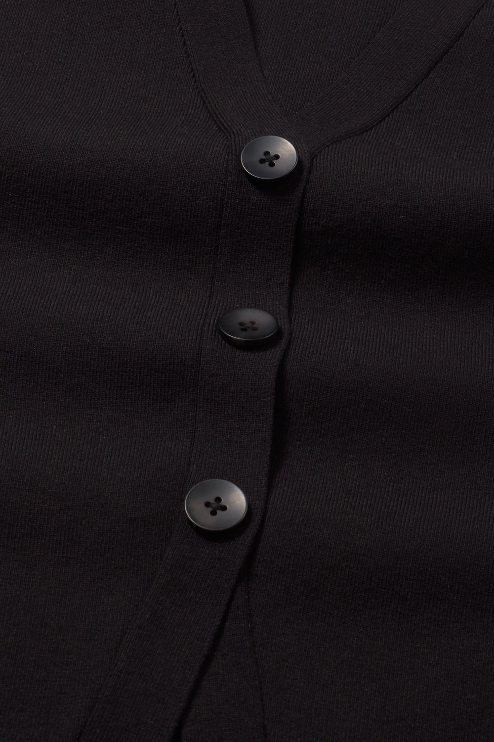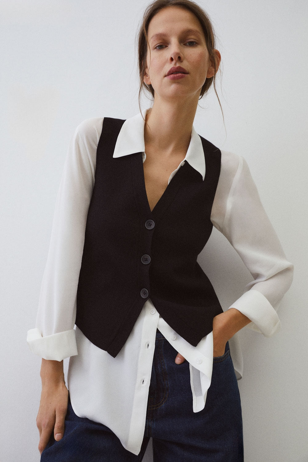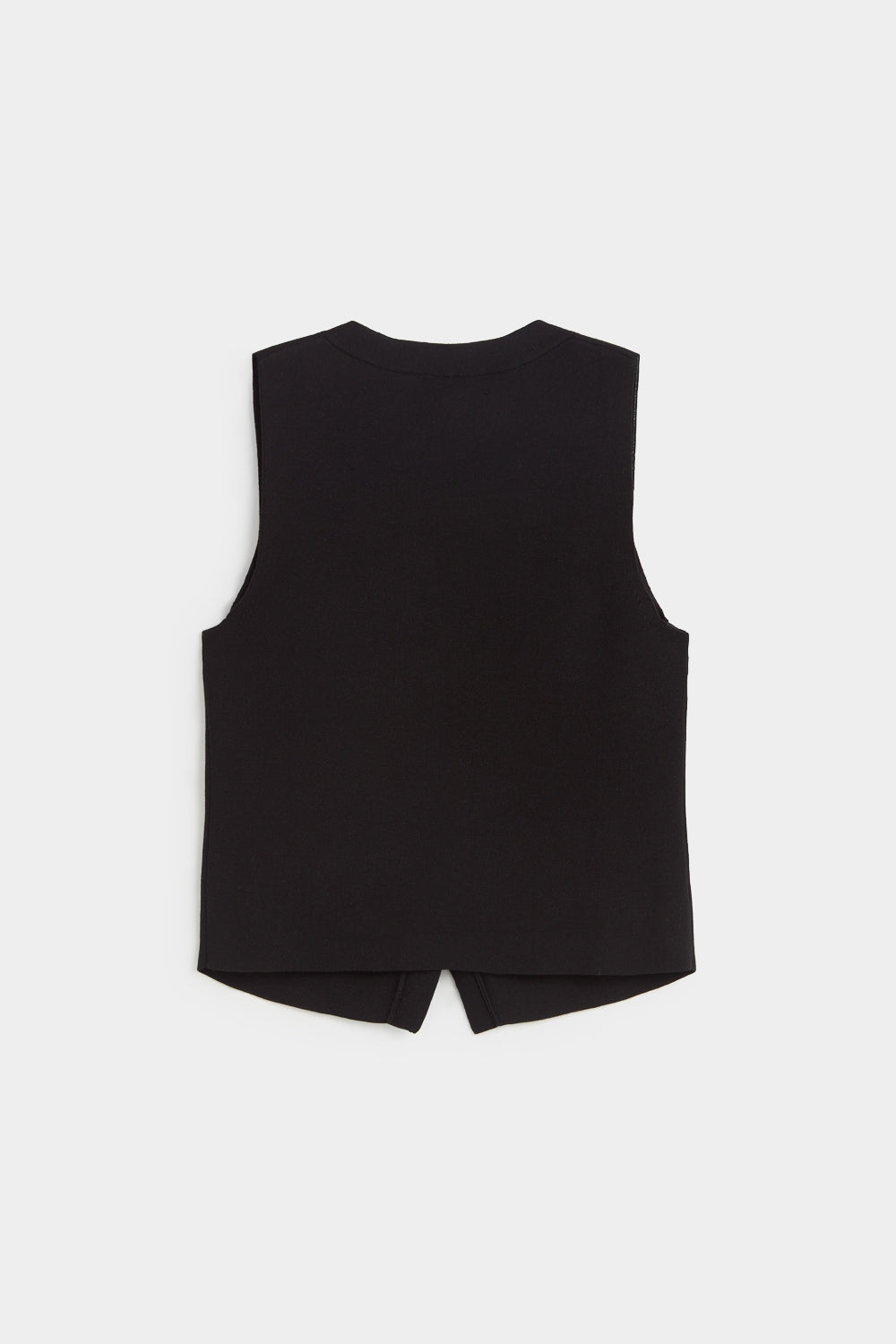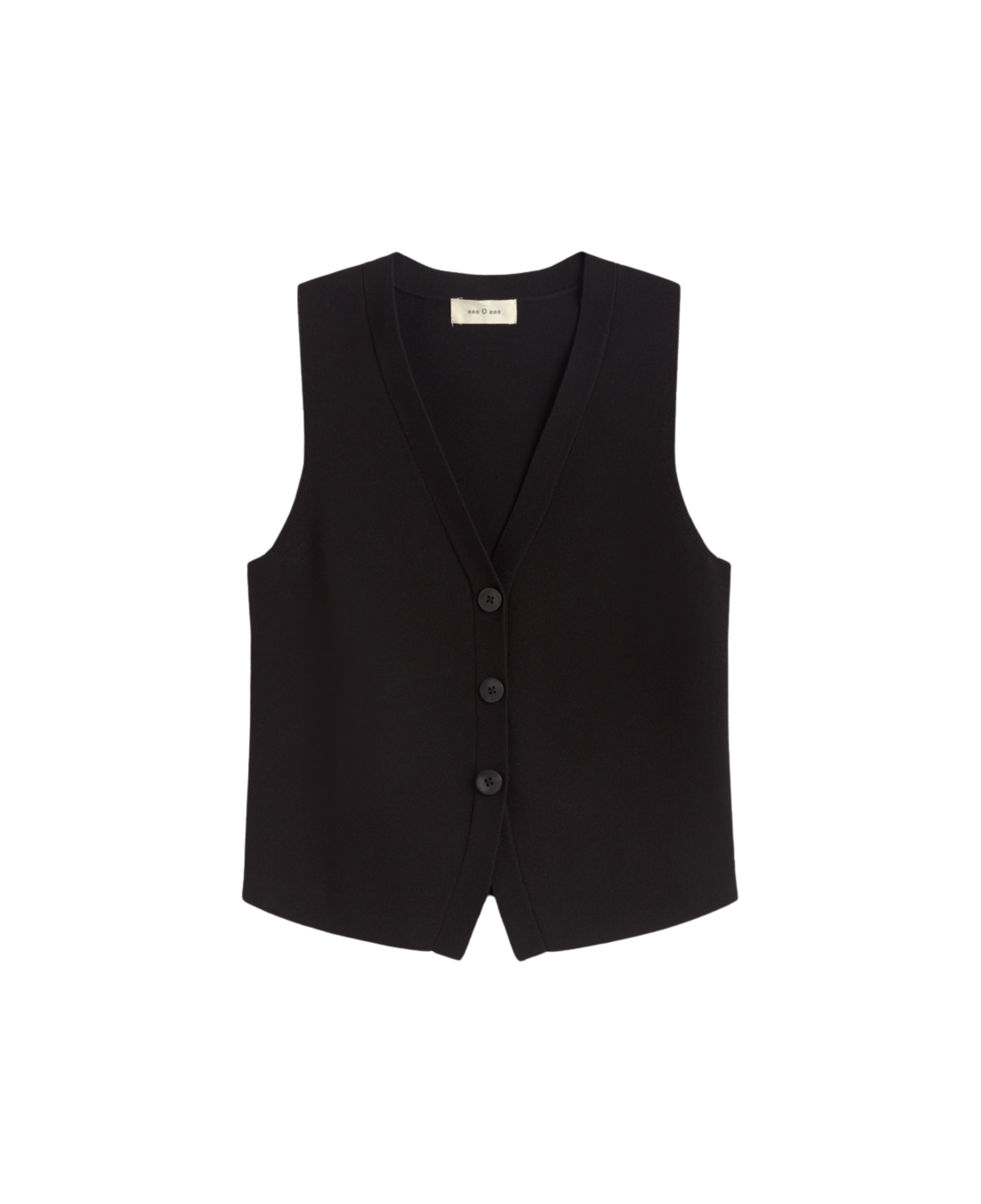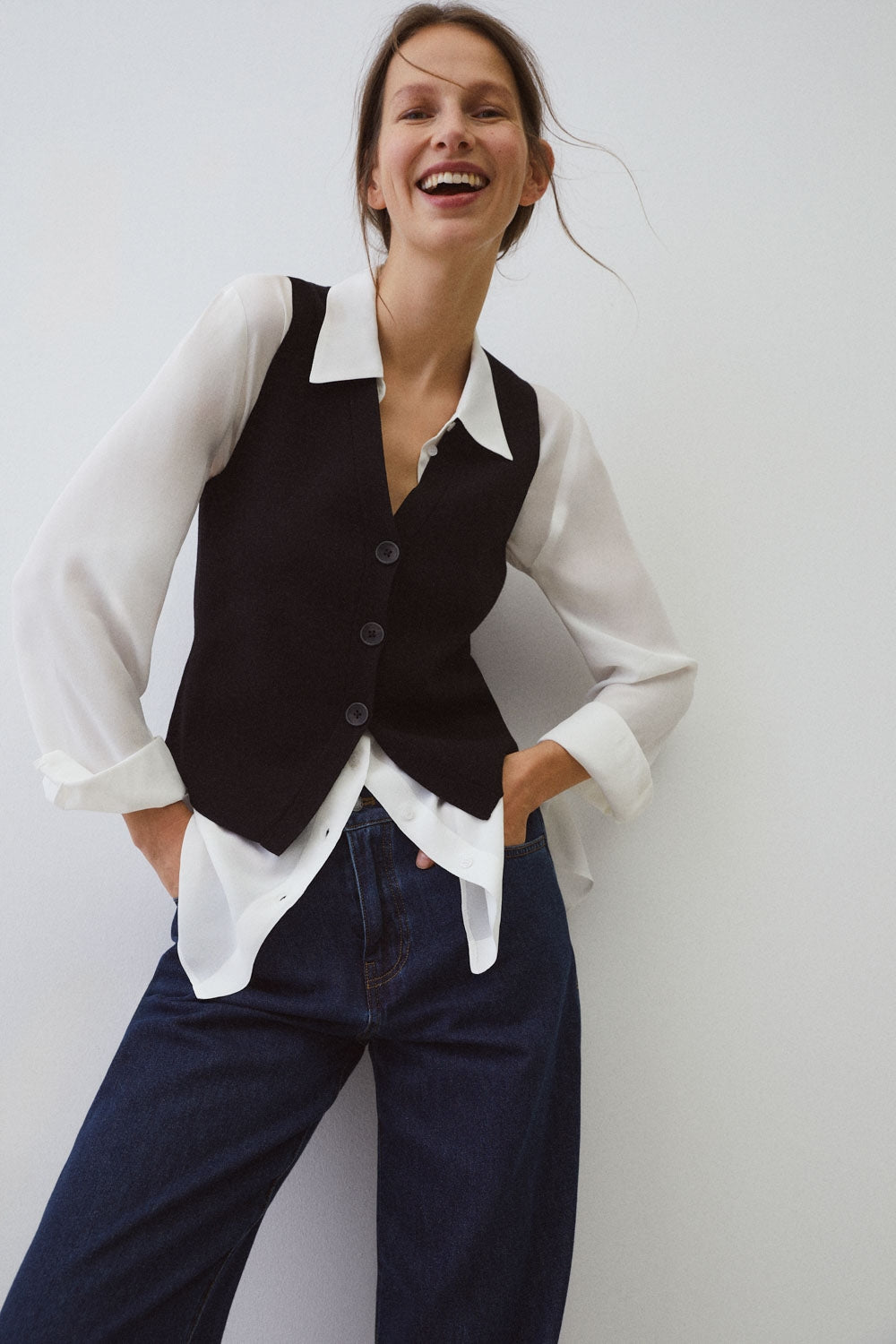 Gestrickte Weste. V-Ausschnitt. Flügelärmel. Farblich passender Knopfverschluss vorne. Gerade Passform.