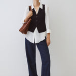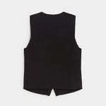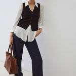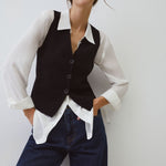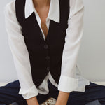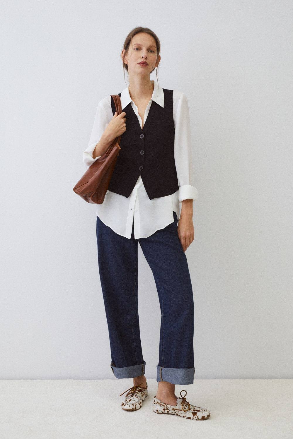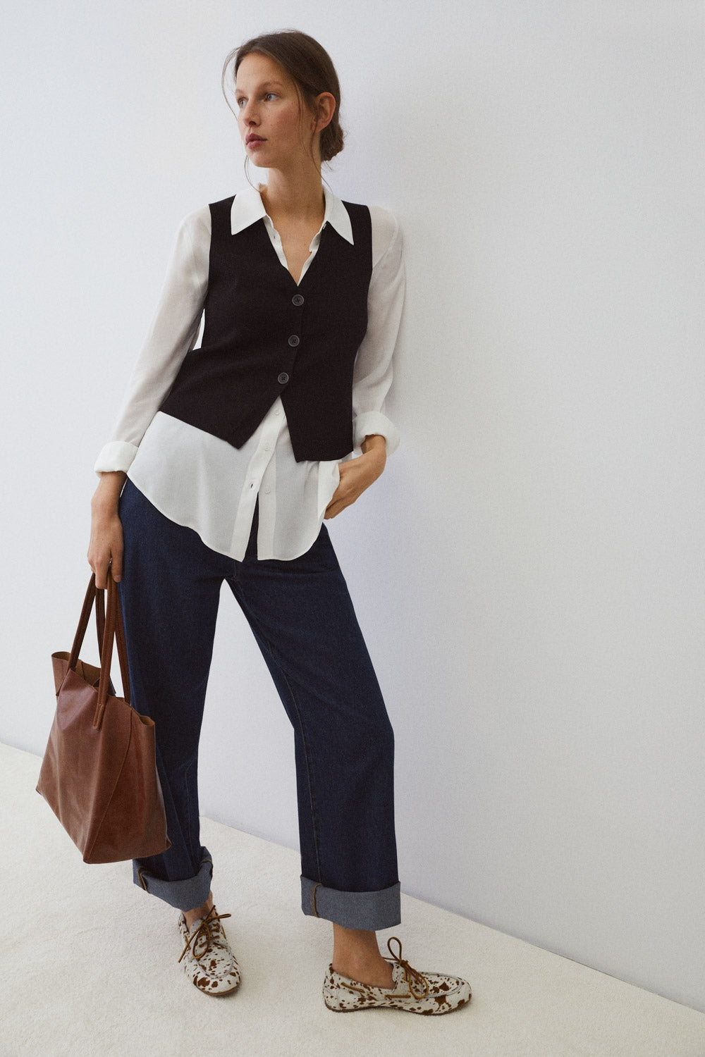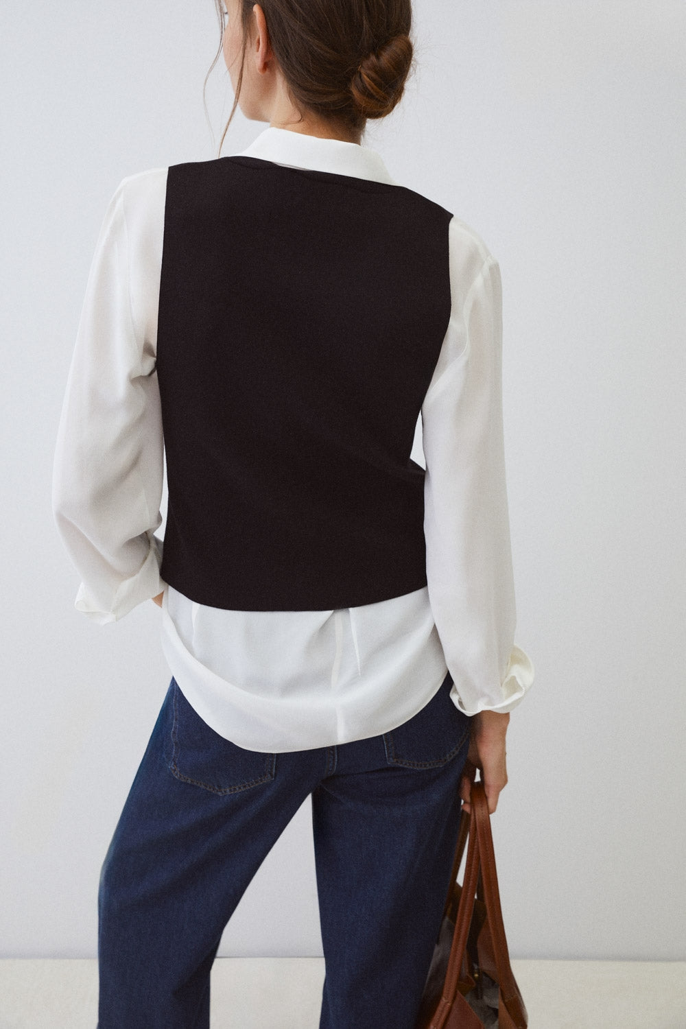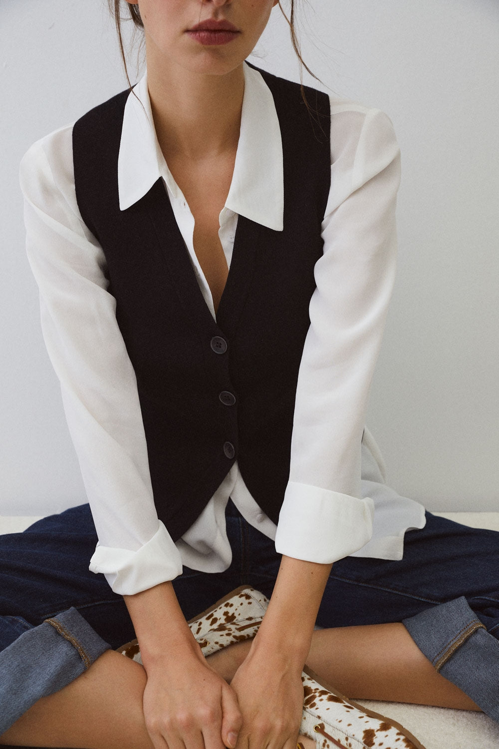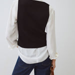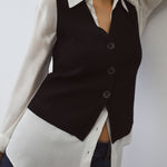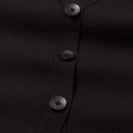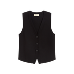 Gestrickte Weste. V-Ausschnitt. Flügelärmel. Farblich passender Knopfverschluss vorne. Gerade Passform.