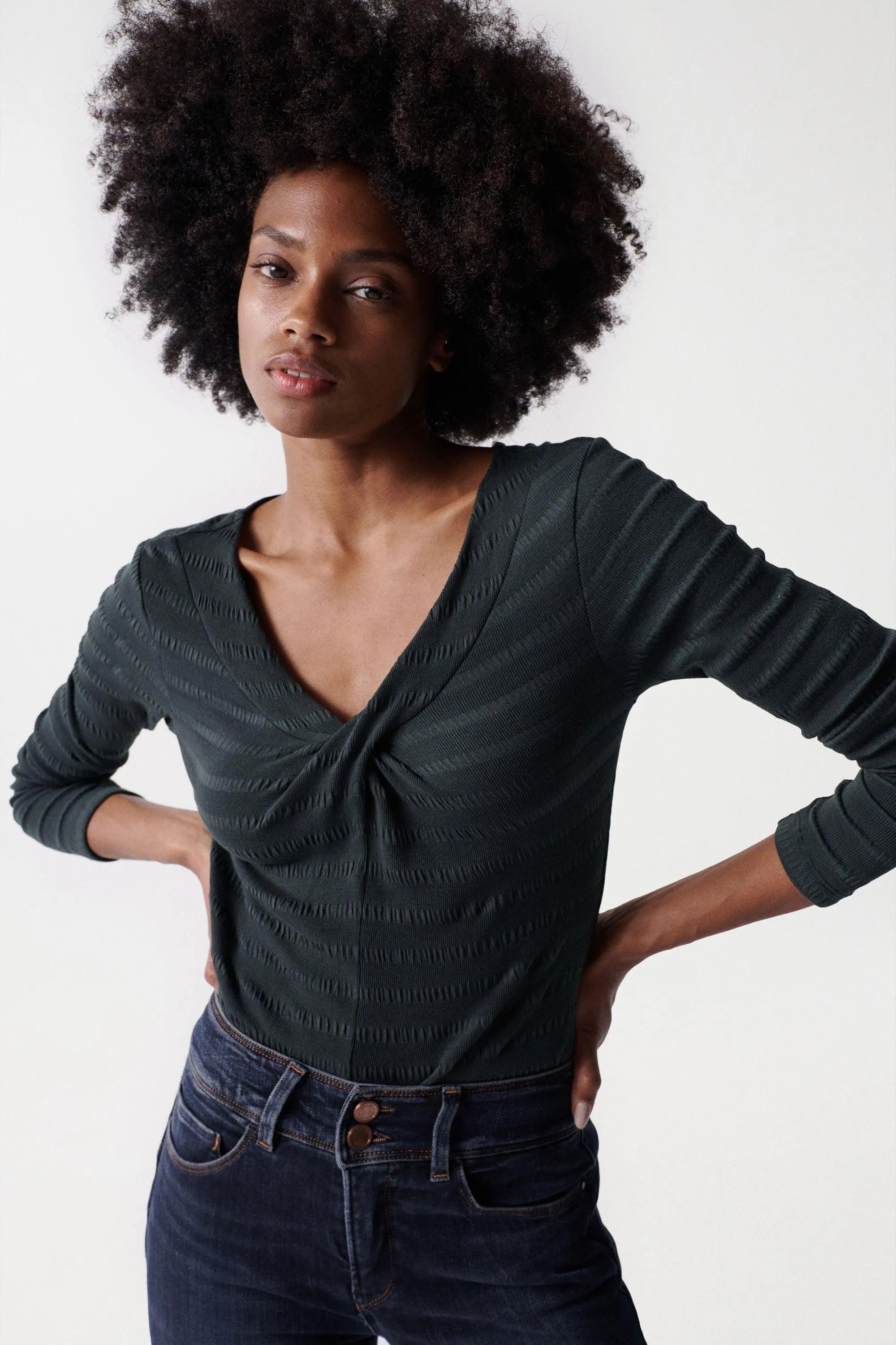 Schlichtes T-Shirt mit Knotenausschnitt. Schmaler Schnitt. V-Ausschnitt mit Knotendetail vorne. Lange Ärmel. Jacquard-Strickstoff. Grün.