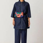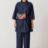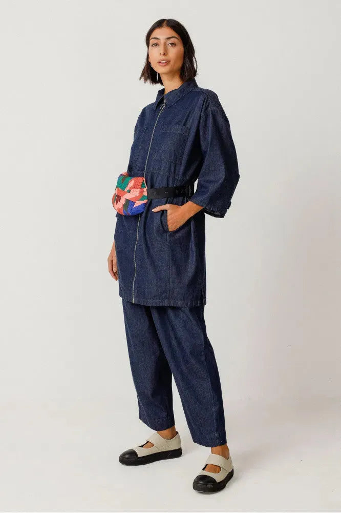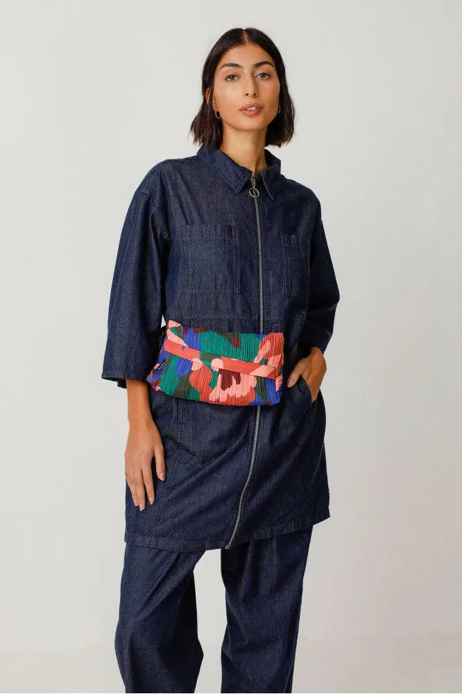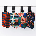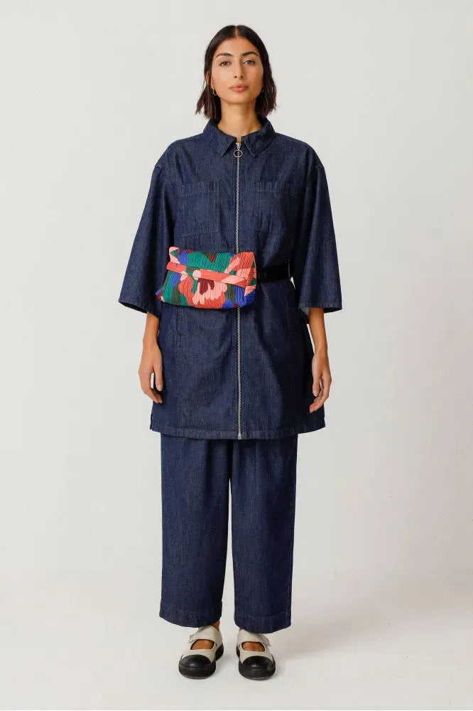 Diagonal plissierte Gürteltasche aus Stoff mit zylindrischer Form, verdeckter Reißverschlussöffnung, verstellbarem Nylongurt und Druckknopfverschluss, Maße 254 x 152 mm.