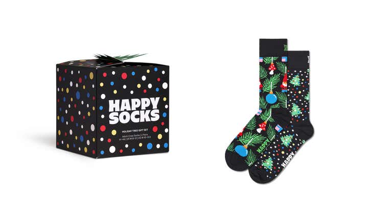 El set regalo 2-Pack Holiday Tree Socks de Happy Socks incluye dos pares de calcetines con motivo navideño, ideales para vestir con espíritu festivo. Ambos pares están confeccionados en una mezcla de 86 % algodón, 12 % poliamida y 2 % elastano, lo que les aporta suavidad al tacto, elasticidad y buena durabilidad gracias a los refuerzos en talón y puntera. El paquete viene presentado en caja temática —que incluso imita un árbol de Navidad—, lo que lo convierte en una opción perfecta como regalo durante la temporada invernal.