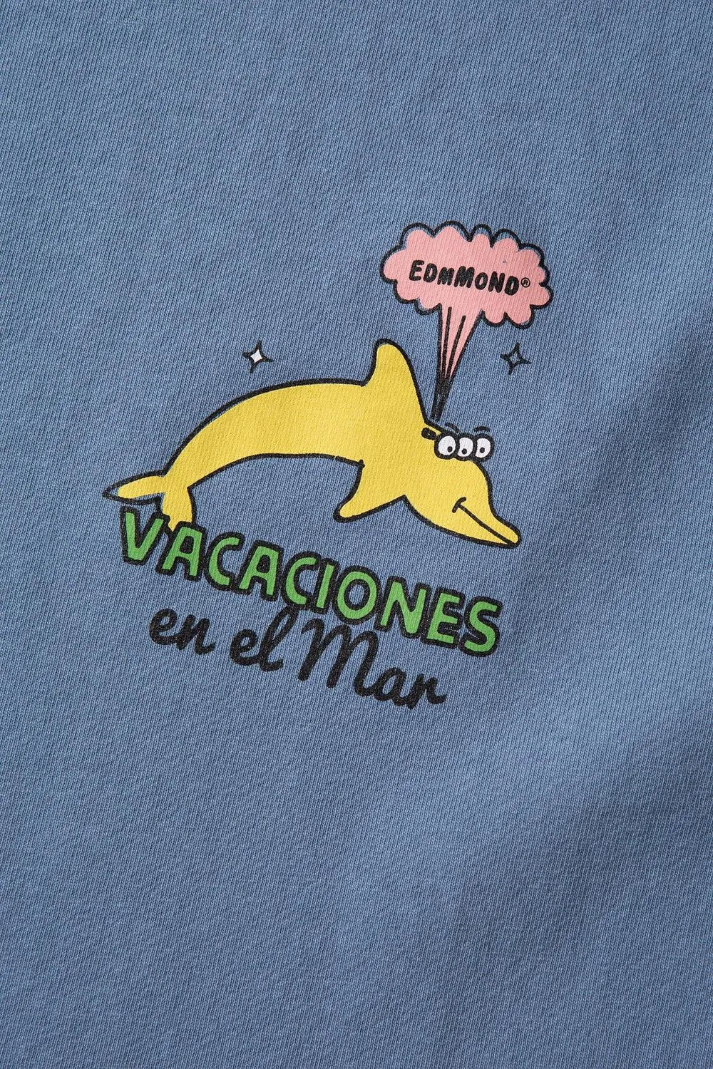 Stahlblaues Kurzarm-T-Shirt. Aus 100 % Bio-Baumwolle. Illustration auf der Vorderseite.