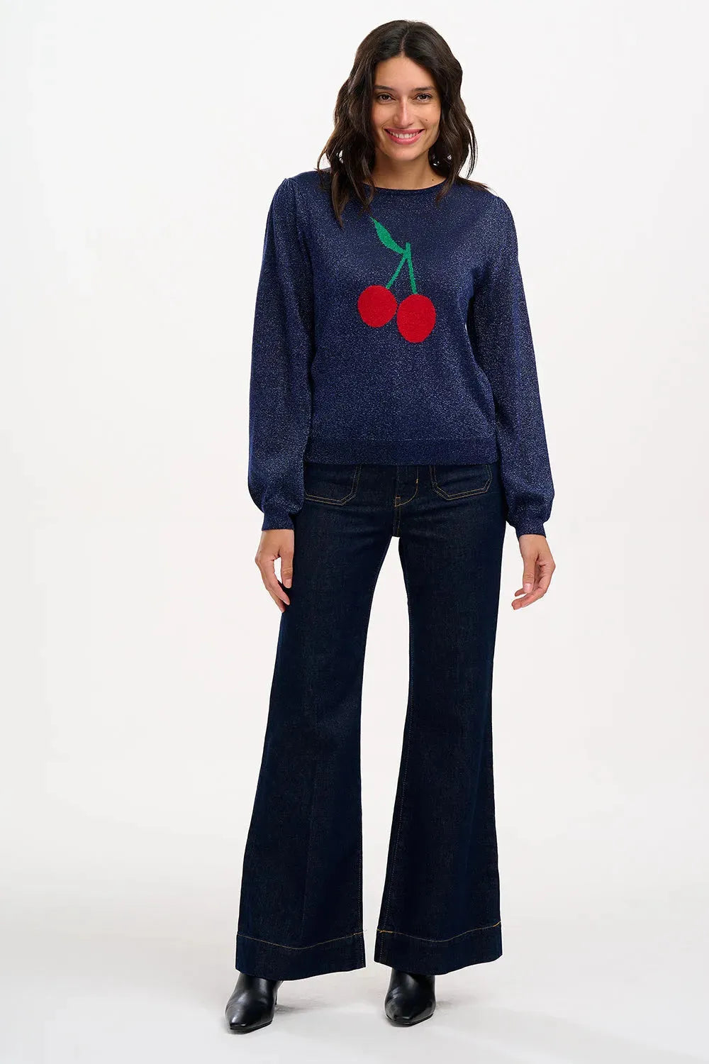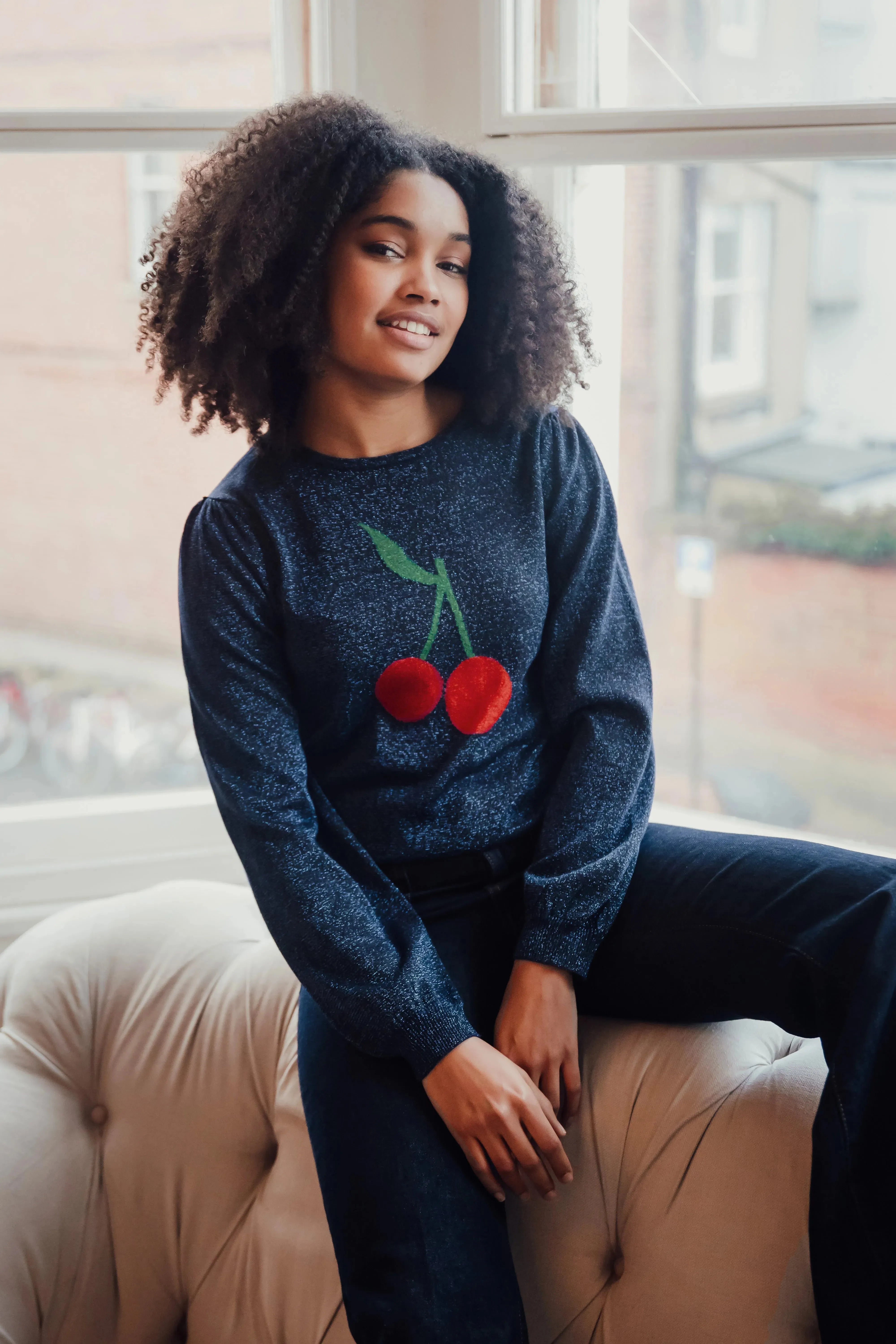 Das Tiff-Modell kombiniert eine halb taillierte Form und eine leichte Baumwollmischung mit markanten Blousonärmeln. Dieses Design zeigt ein fröhliches Kirschmotiv auf einer leuchtend marineblauen Basis.