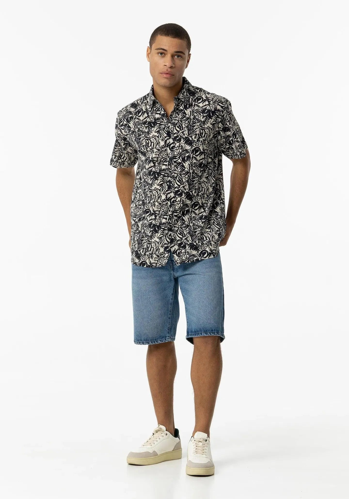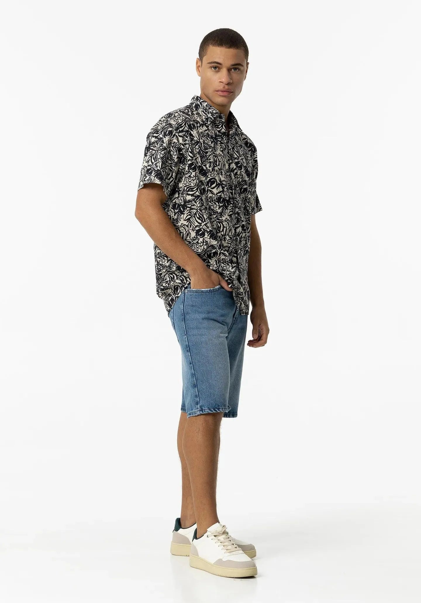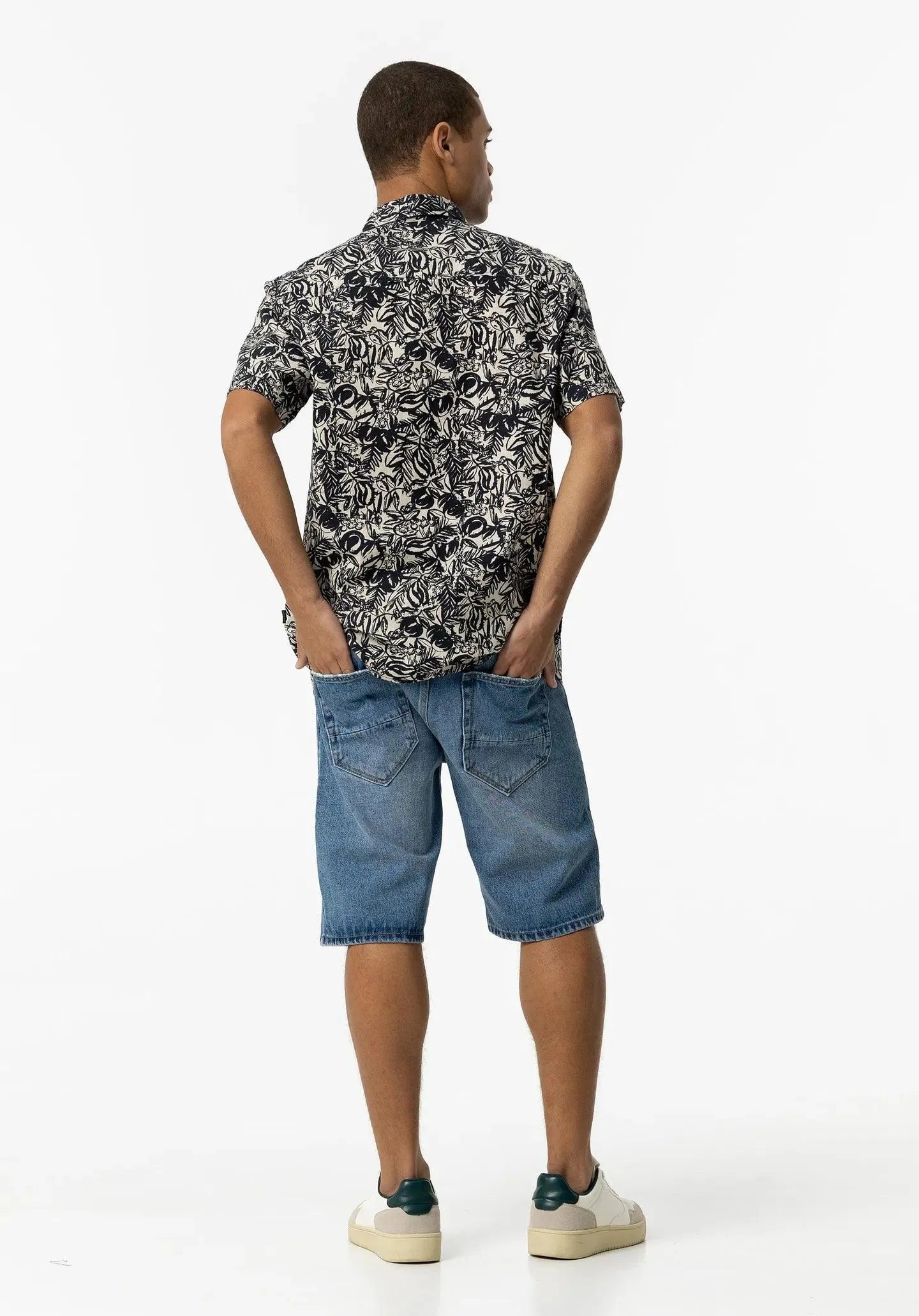 Bermudashorts mit fünf Taschen. Vorderer Verschluss mit durch Patte und Metallknopf verdeckten Knöpfen.