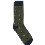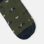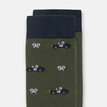 Grüne Socke mit Auto-Print aus Baumwollmischung. Wadenlang und mit Schläger-Detail. Mit Jacquard-Schriftzug SILBON. Hergestellt in Portugal.