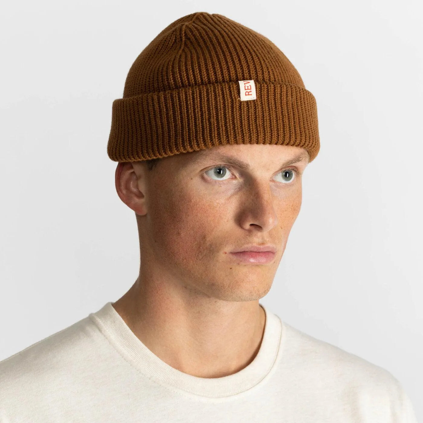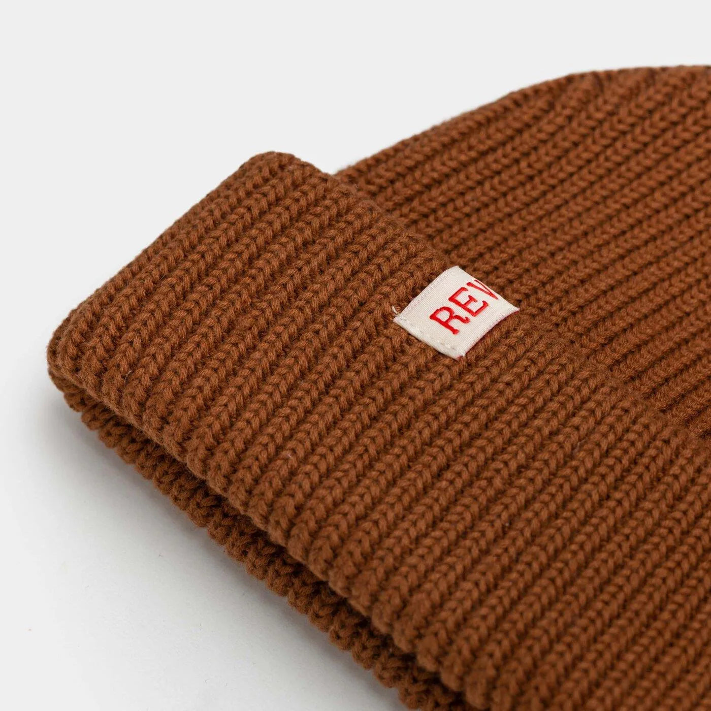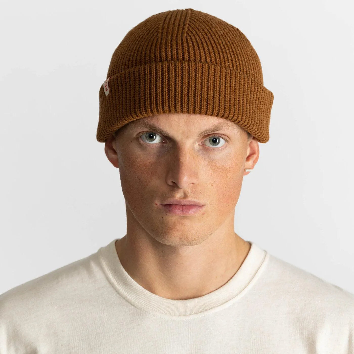 Gestrickte Fischermütze mit Falte. Kommt in einfarbigen Farben mit Markenetikett