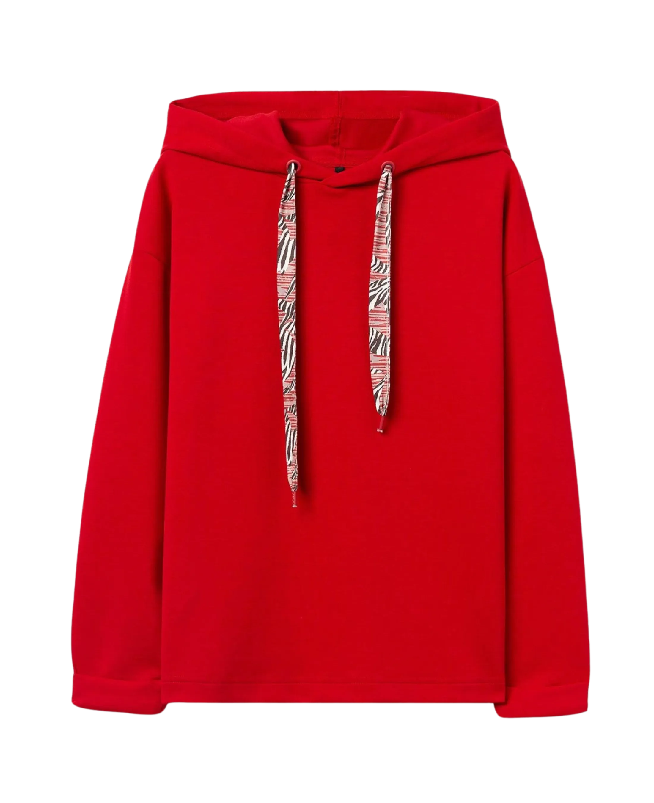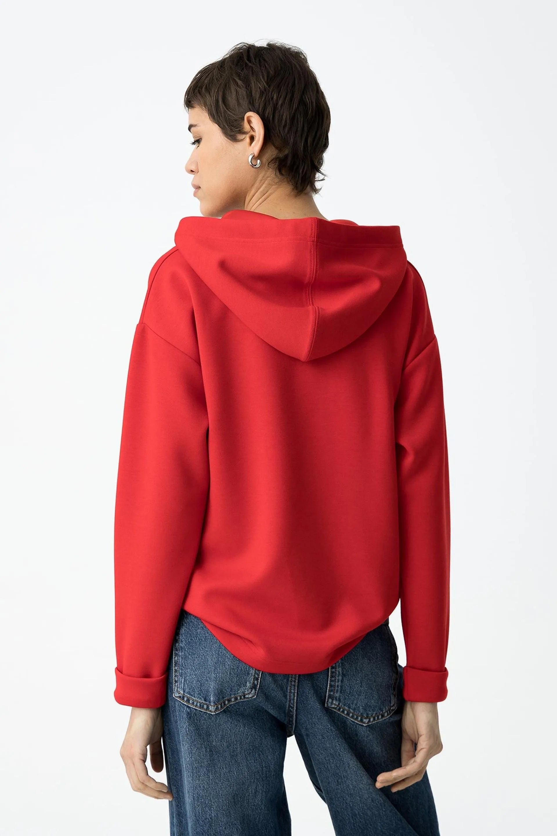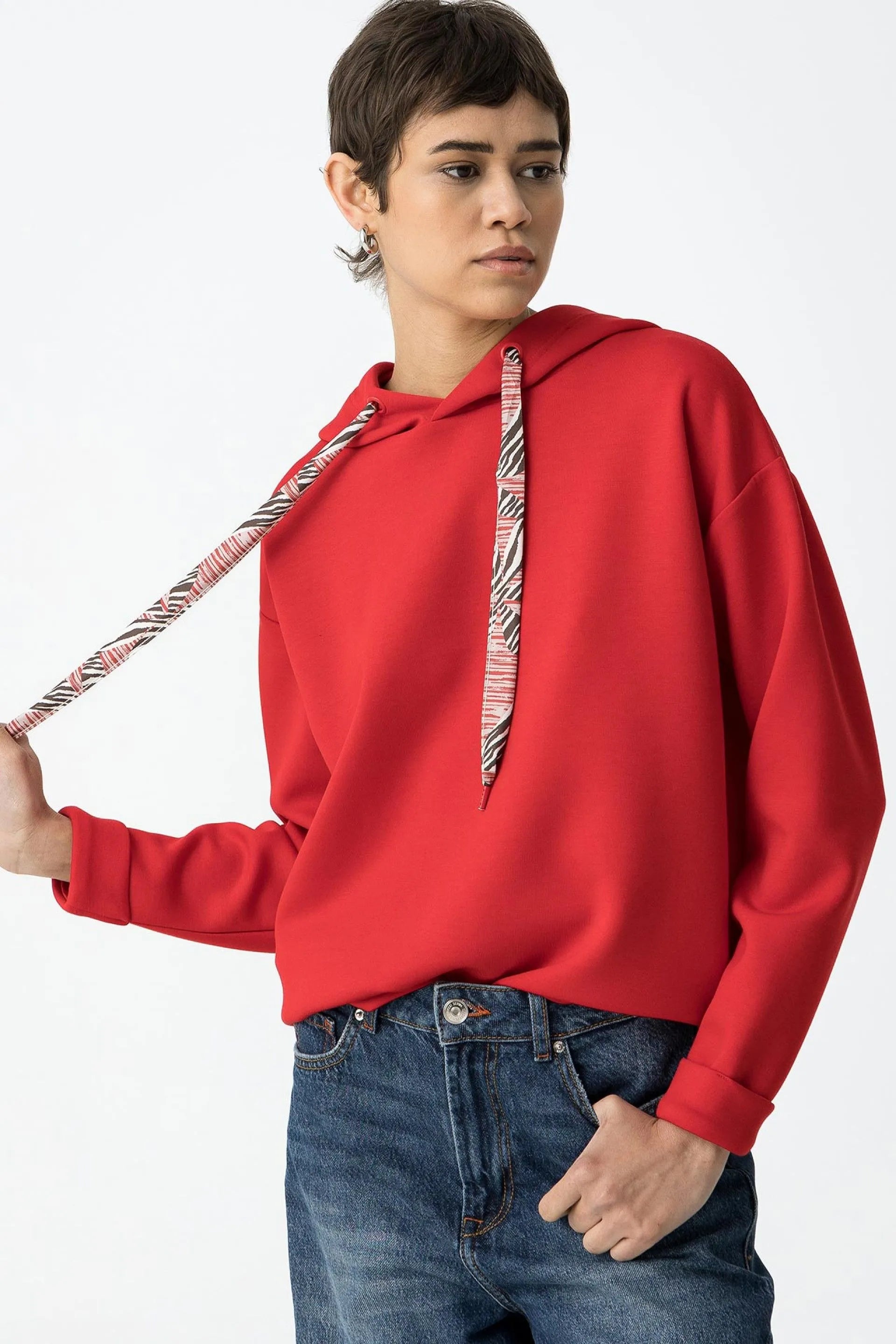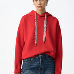 Fein gestricktes Kapuzensweatshirt, entspannte Passform, mit Satin-Kordelzug, langen Ärmeln und umgeschlagenen Bündchen.