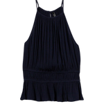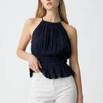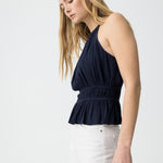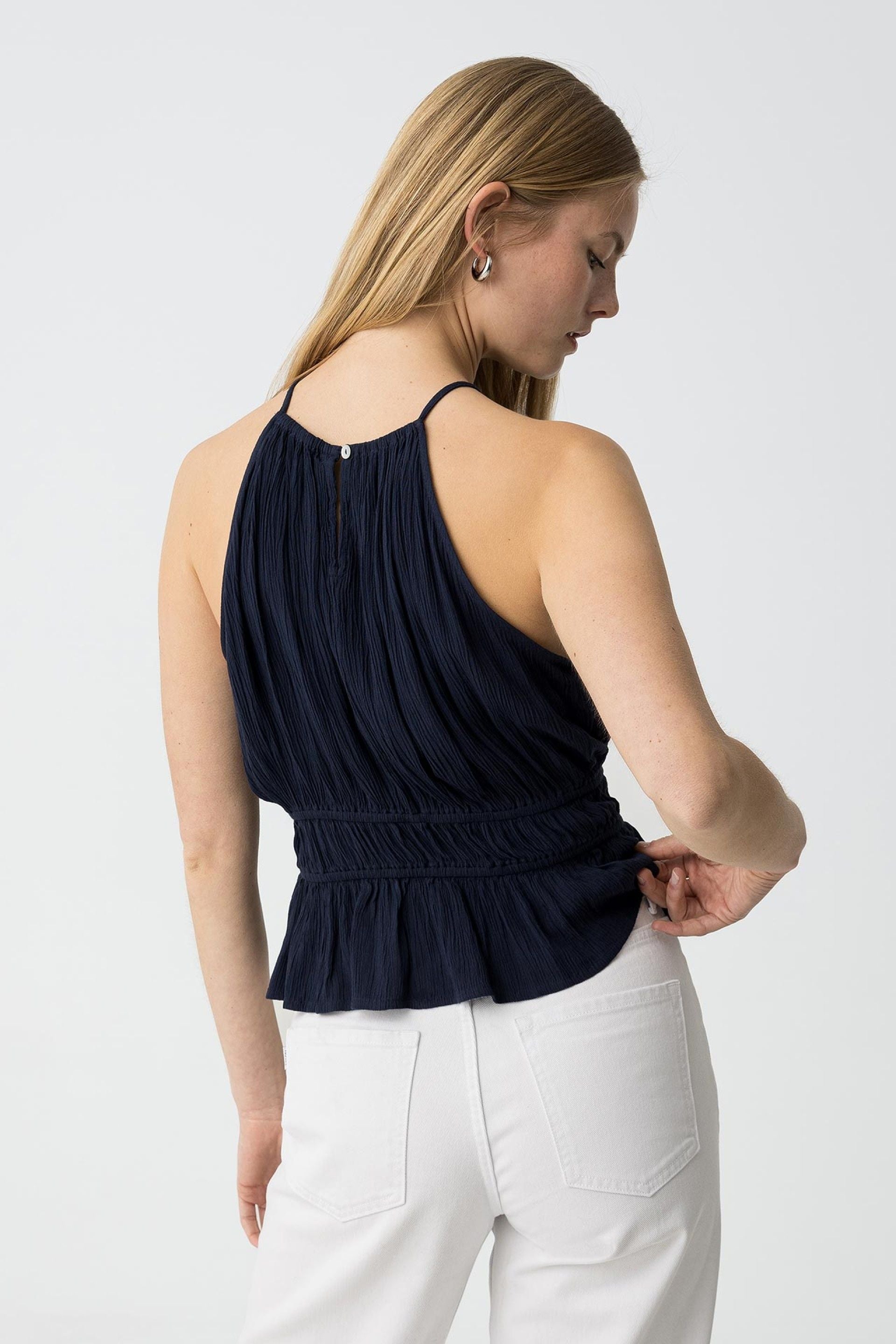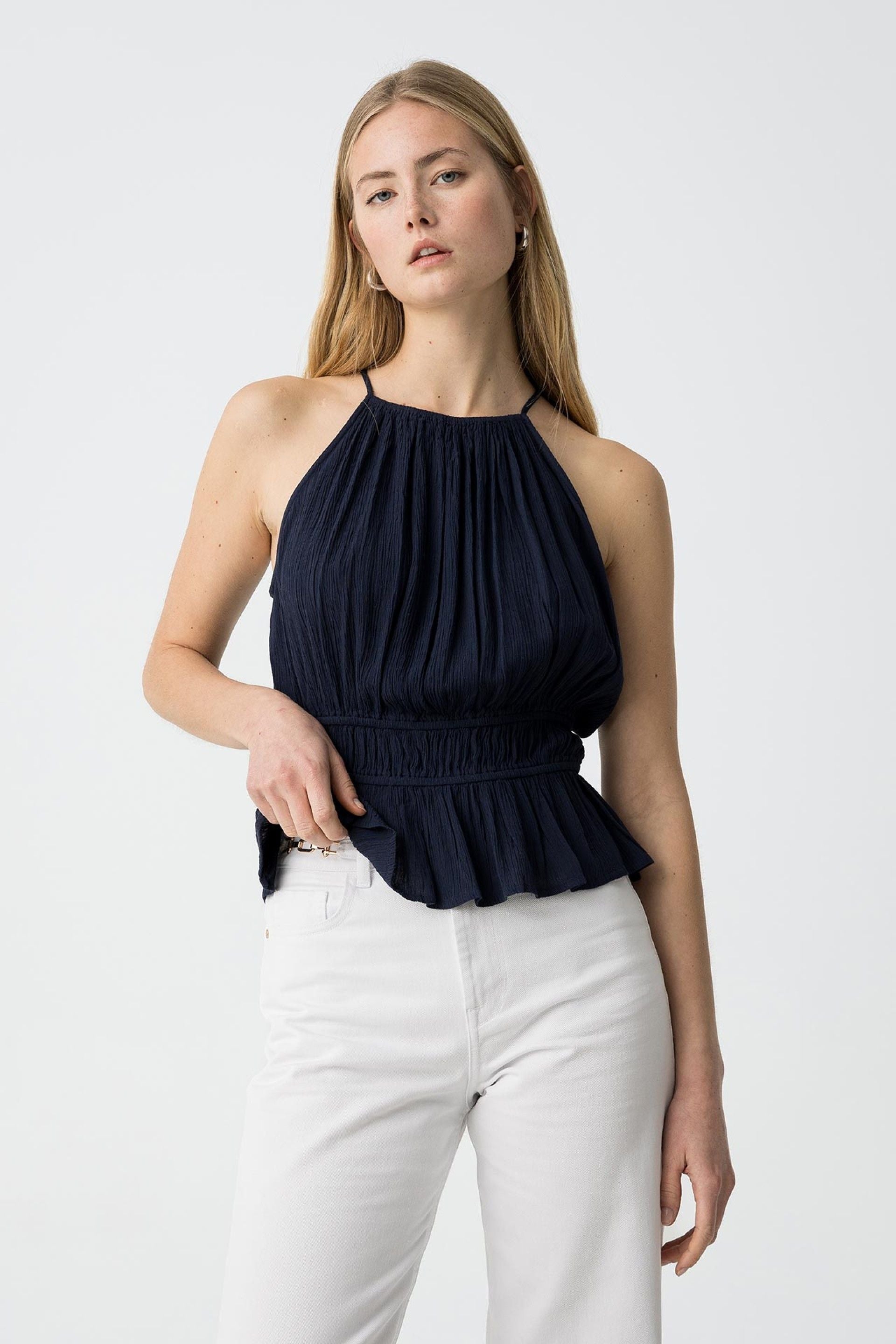 Top mit geradem Ausschnitt, dünnen Trägern und einer Rüsche an der Taille.