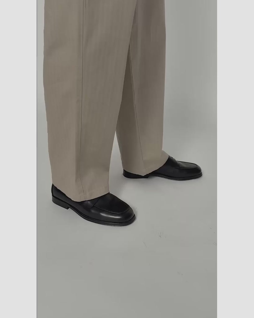 Chinos clásicos, pero más elegantes. Estos pantalones con pliegues están confeccionados con un tejido de algodón en espiga con sutiles rayas tonales, lo que te da ese look de «me importa, pero no demasiado». Anchos y holgados en la pierna, se adaptan fácilmente tanto a las horas de oficina como al tiempo libre.