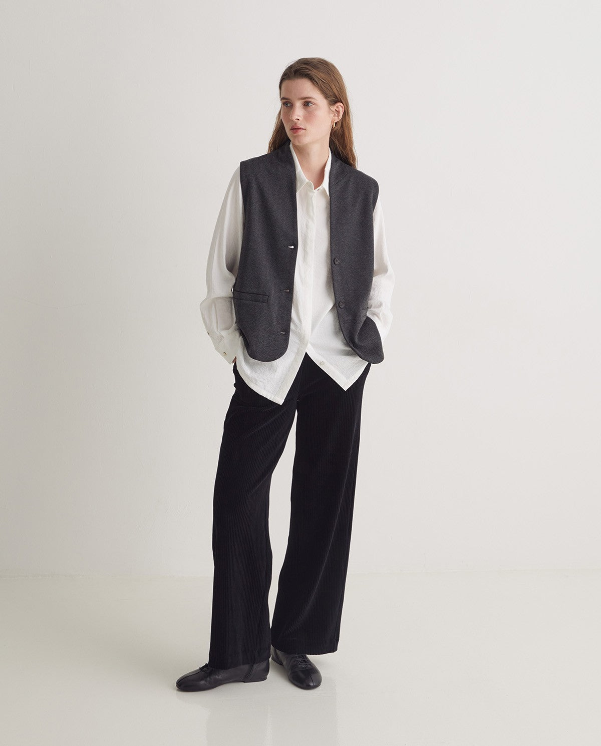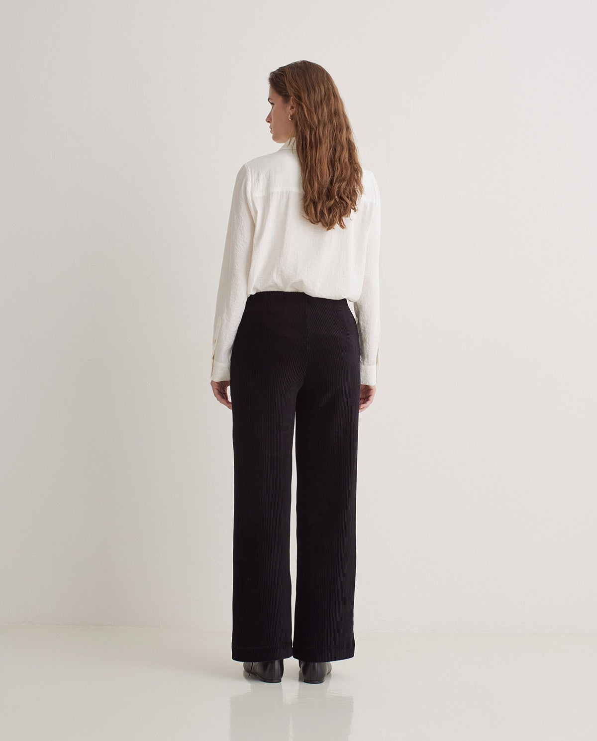 Pantalón de pana de punto. Tejido mezcla de algodón. Corte ancho. Sin cierre. Goma en la cintura. Dos bolsillos laterales.