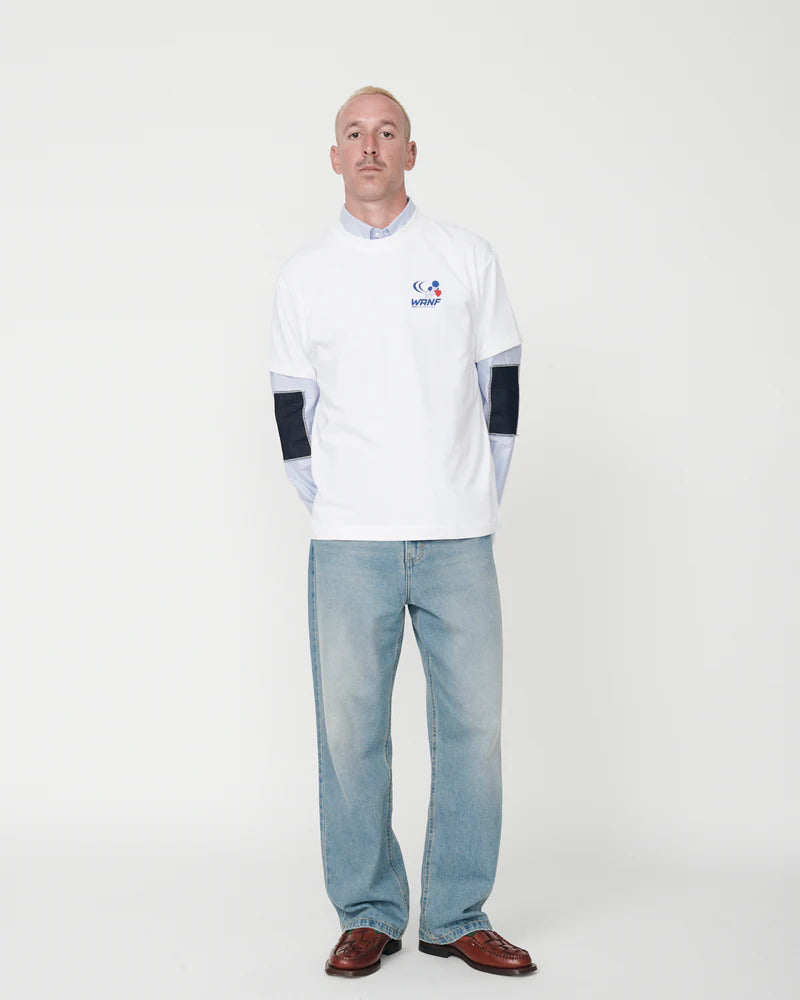 Confeccionada en suave algodón 100 % y con parches superpuestos en las mangas en tejido contrastado, es una declaración de ironía global que se puede llevar puesta. Con un logotipo en el pecho y un llamativo gráfico en la espalda, esta camiseta es a la vez un comentario sobre la cultura de consumo y una prenda esencial para el día a día.