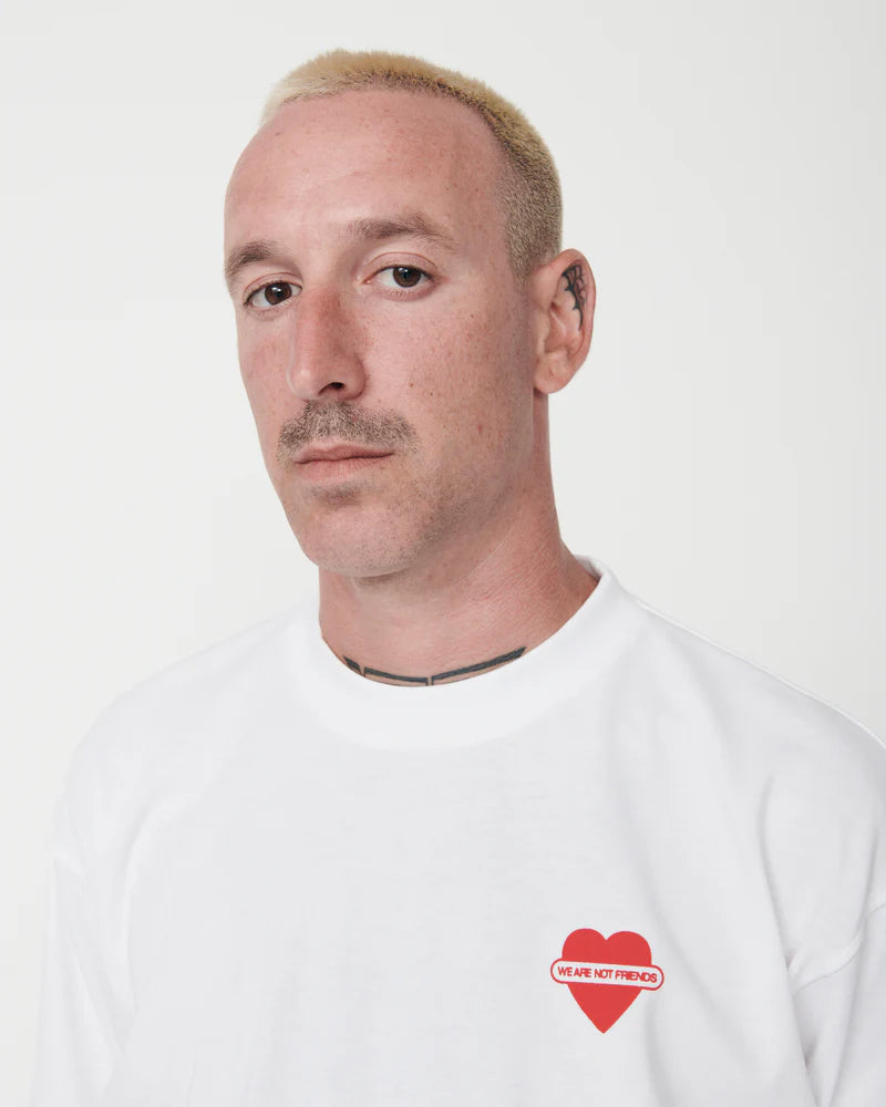 El corazón rojo con la frase «WE ARE NOT FRIENDS» (No somos amigos) atravesándolo se inspira en los antiguos logotipos de los sindicatos ferroviarios de Estados Unidos, donde los trenes solían atravesar emblemas en forma de corazón. ¿El nuestro? Un poco más existencial.
