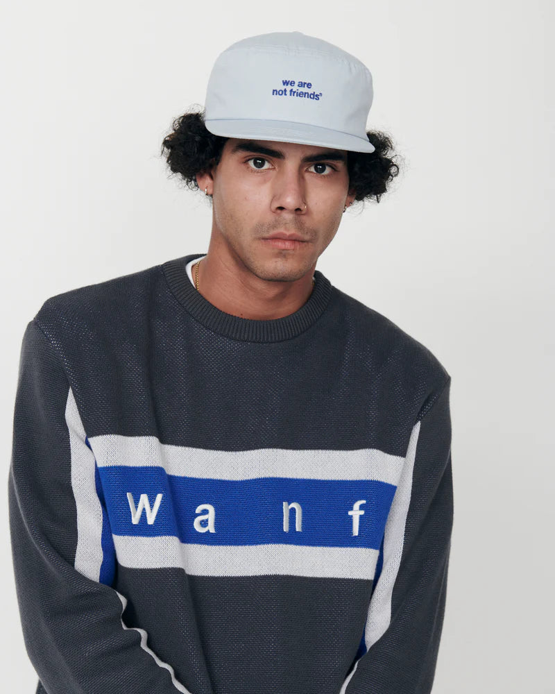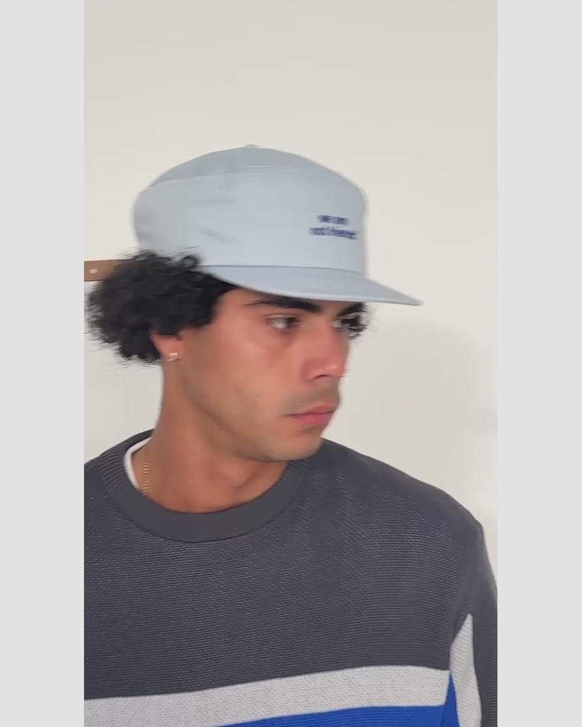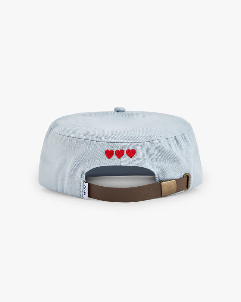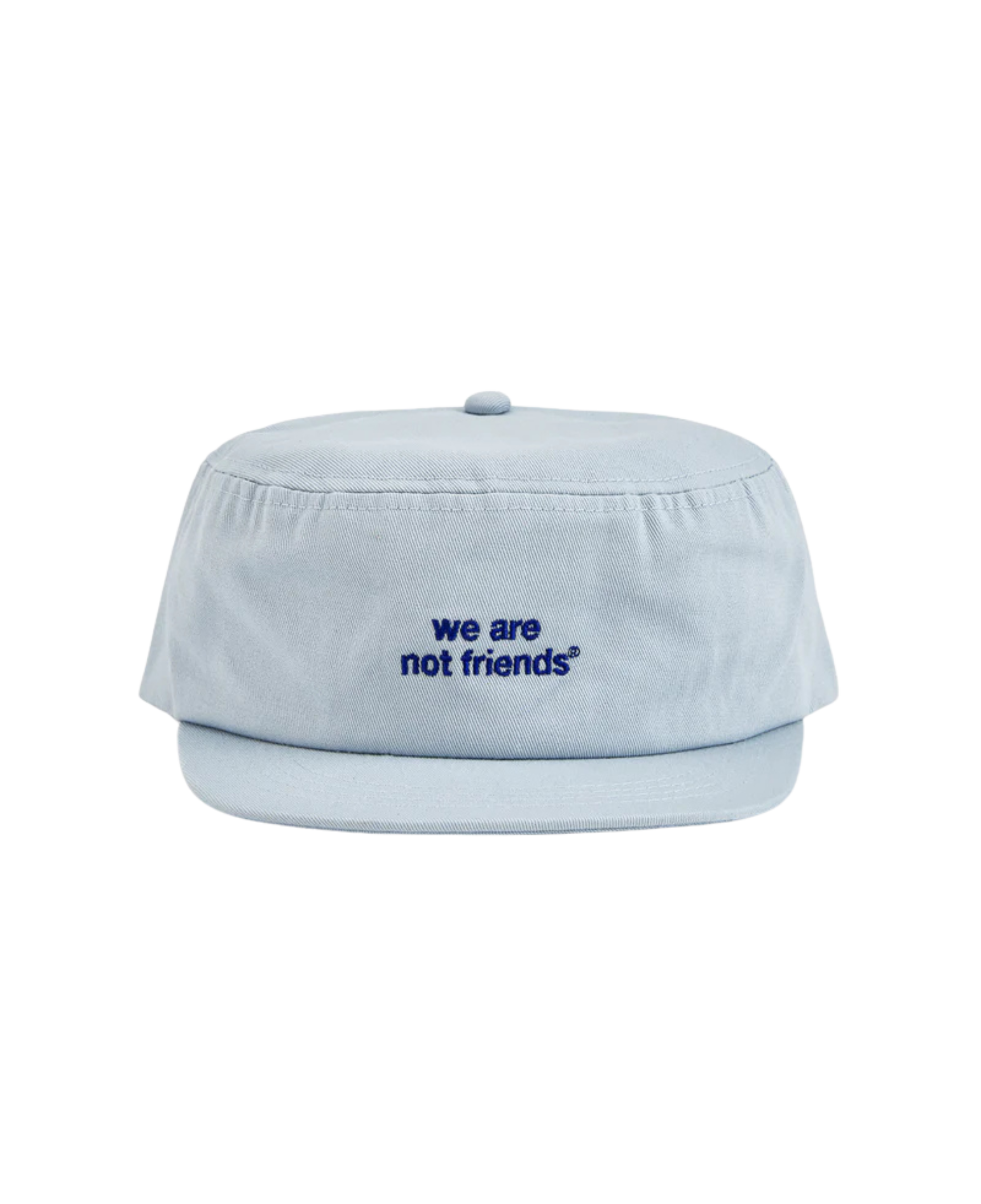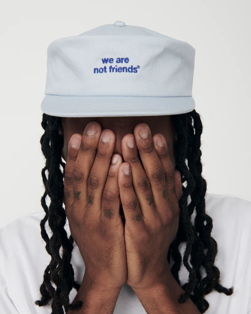 Te presentamos la gorra Pillow Hat: tu nuevo objeto favorito. Confeccionada en 100 % algodón, con una estructura a medio camino entre una gorra y un cojín para tus pensamientos. Viene en un tono azul cielo lavado, con nuestro logotipo we are not friends® bordado en la parte delantera y tres pequeños corazones rojos en la parte trasera, porque incluso la ironía necesita un toque de romanticismo.