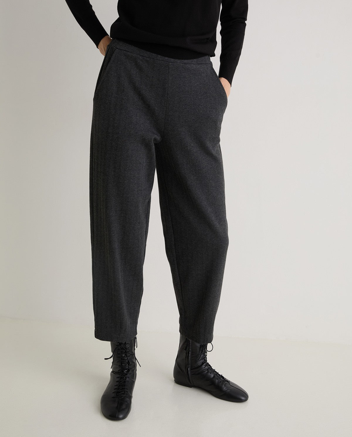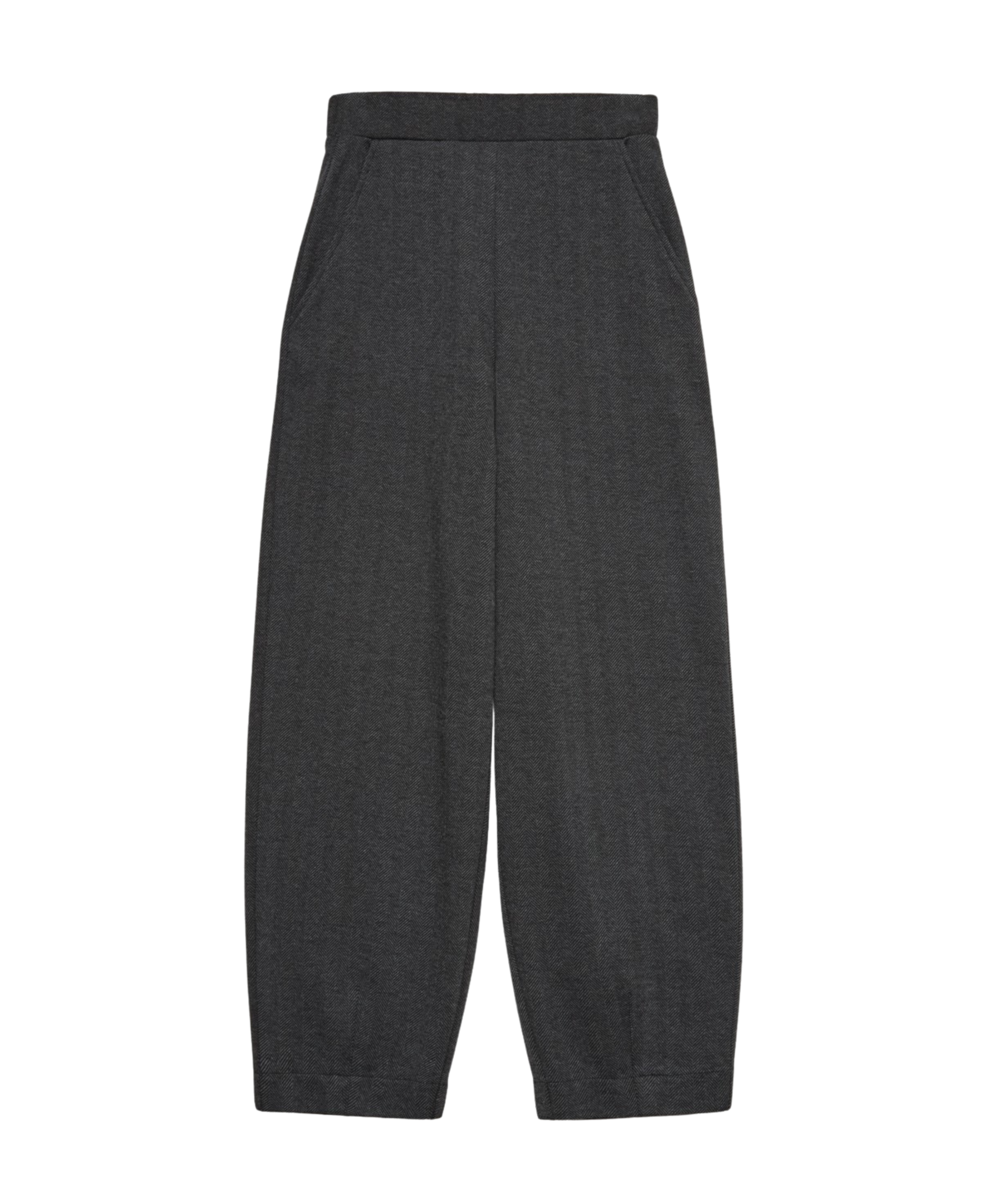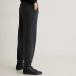 Pantalón de punto en tejido de espiga. Confeccionado con algodón y viscosa. Corte ancho. Cintura con goma elástica. Dos bolsillos laterales y 2 de vivo detrás.