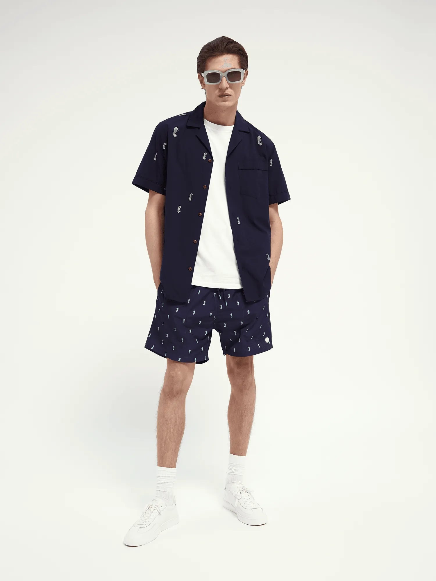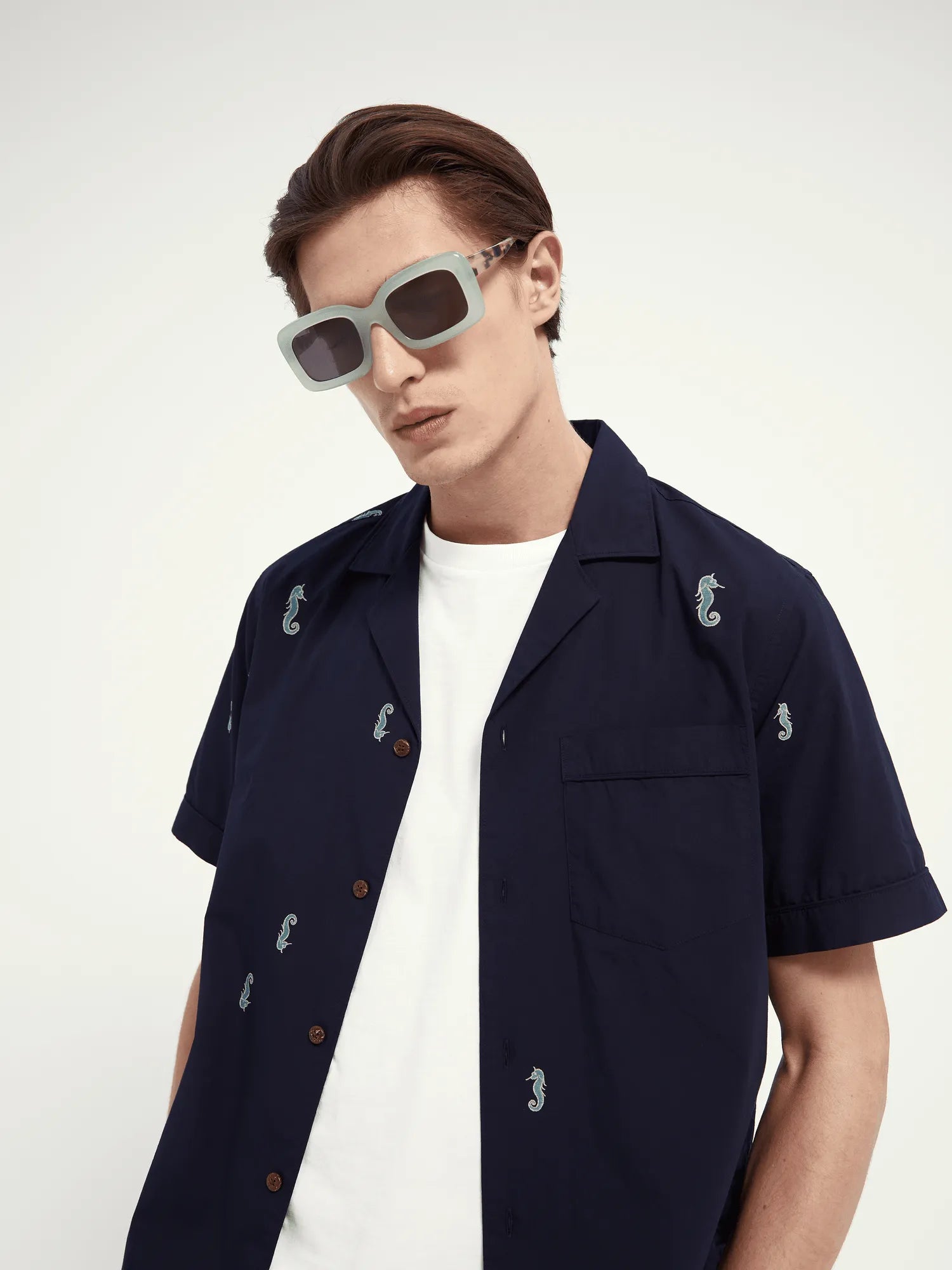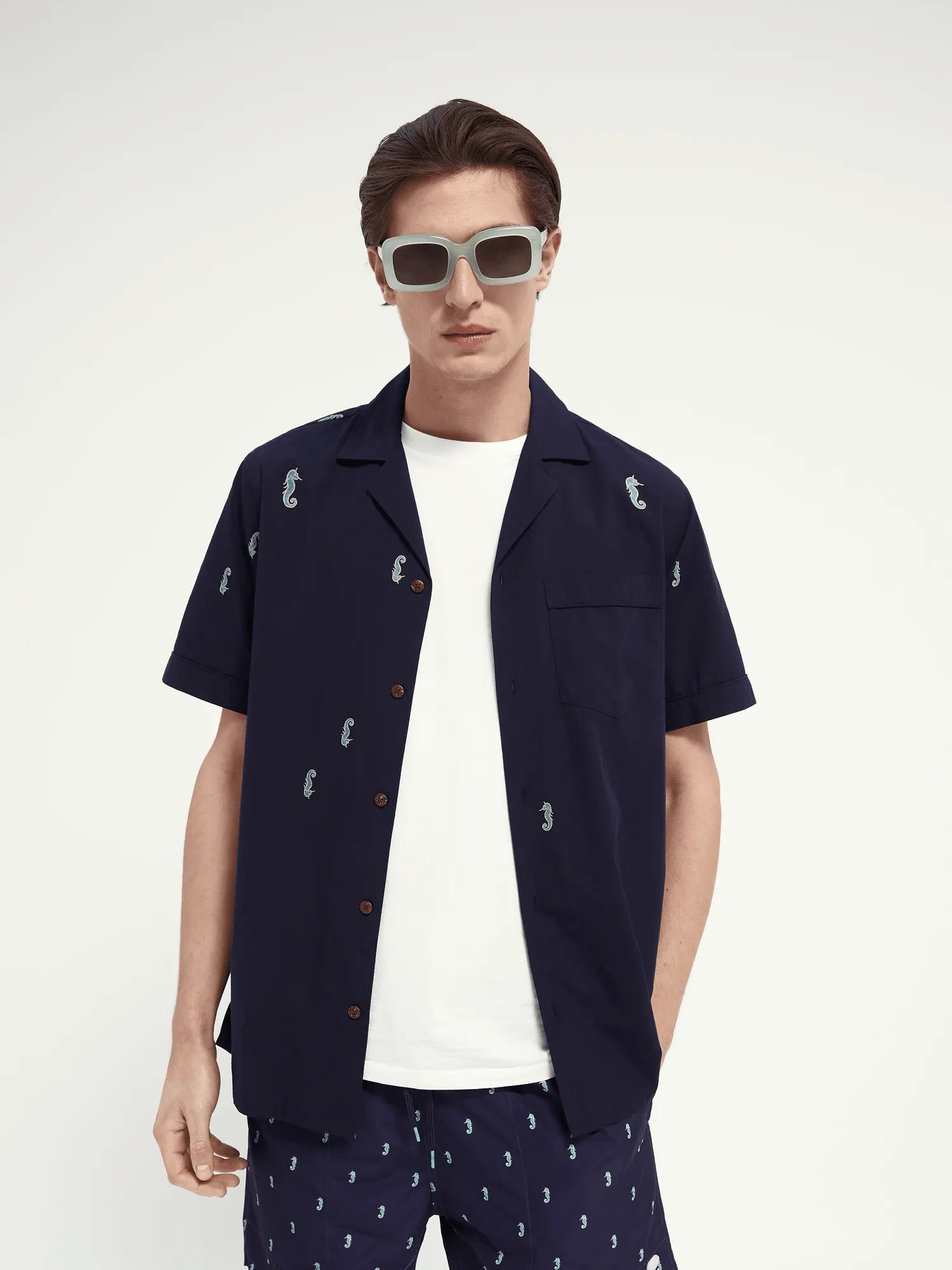 Mit einer entspannten Passform und einem Hawaii-Kragen verleiht dieses Kurzarmhemd Ihrem Outfit einen tropischen Touch. Es besteht aus Fil Coupé und zeigt einen dezenten Aufdruck. Tragen Sie es mit Ihrem Lieblingschinesen.