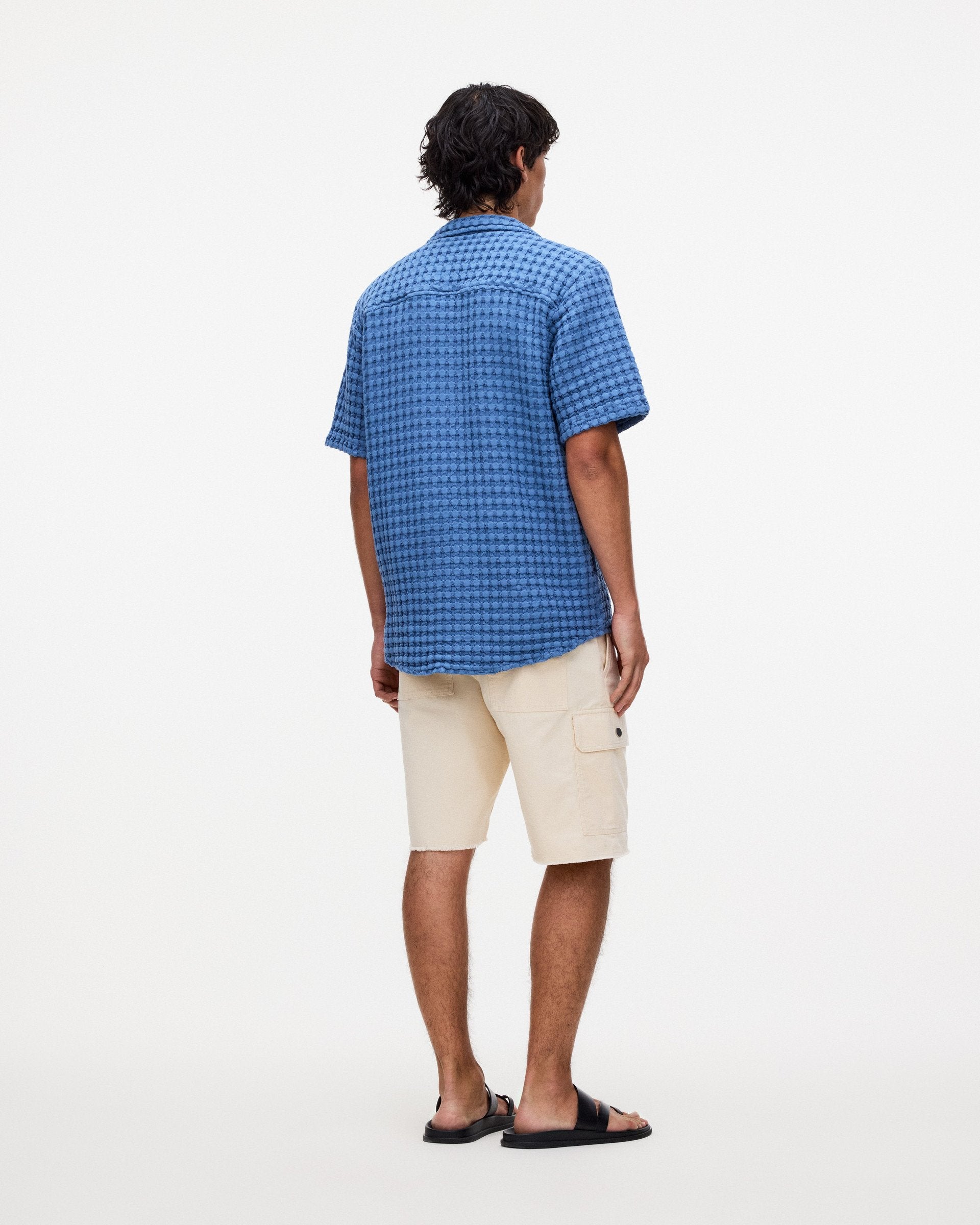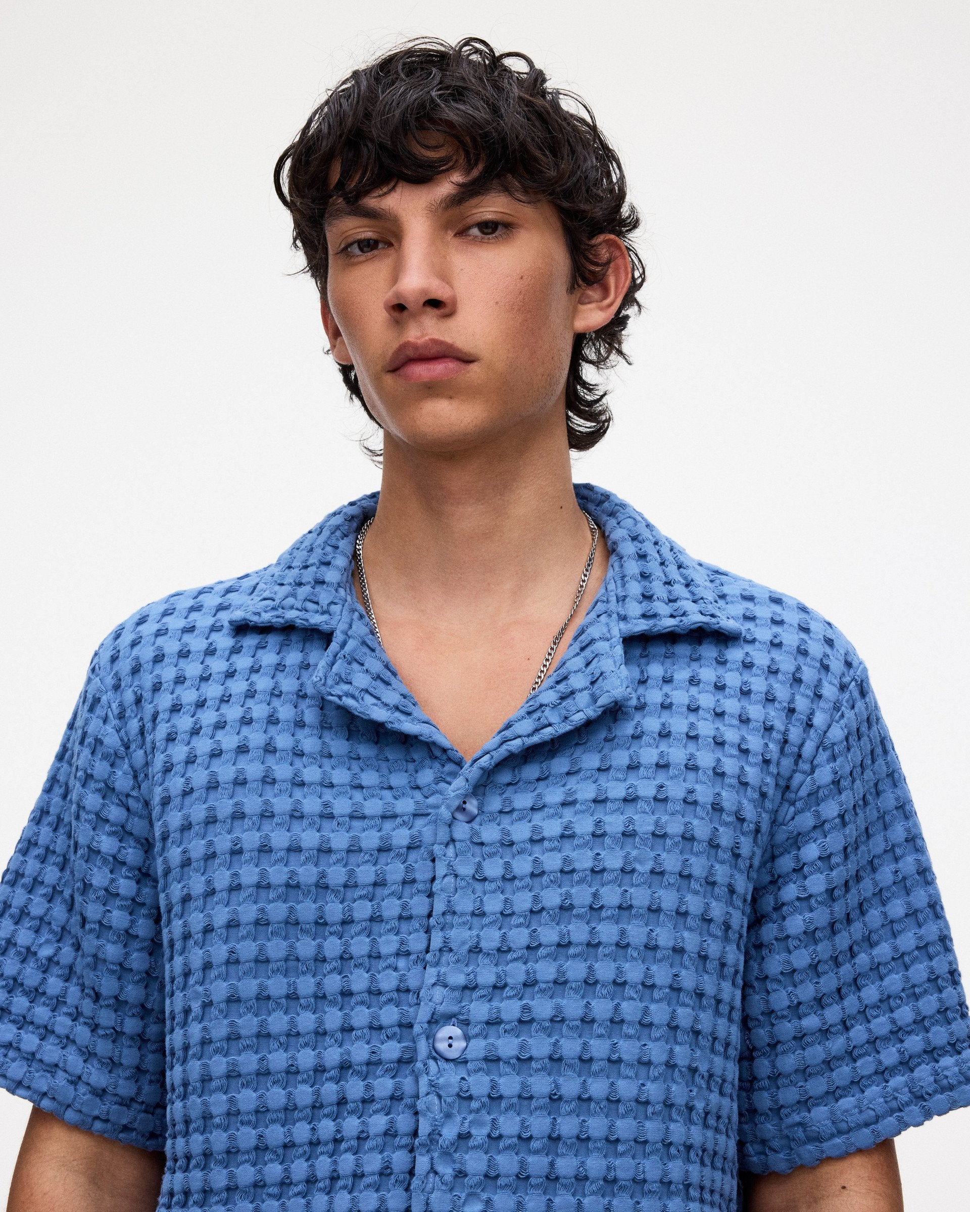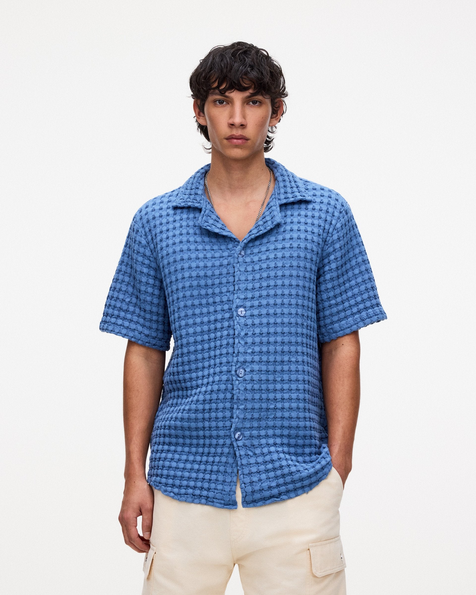 Das Coronet Cuba Waffle Shirt ist mit großzügigem Baumwollanteil in Waffelbindung gewebt und fühlt sich besonders weich und kühl auf der Haut an. Die entspannte Silhouette zeichnet sich durch eckige Ärmel, einen gerippten Kragen und eine Knopfleiste auf der Vorderseite aus.