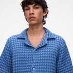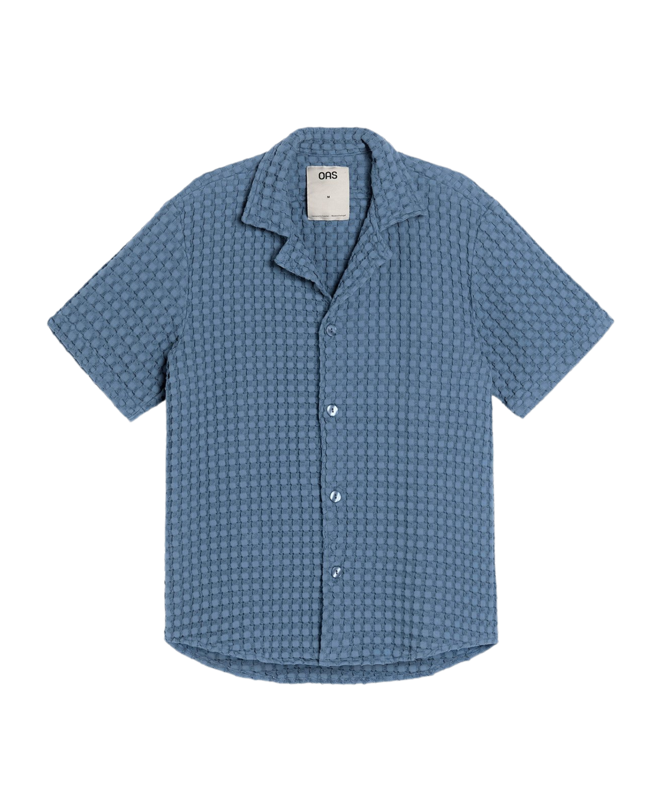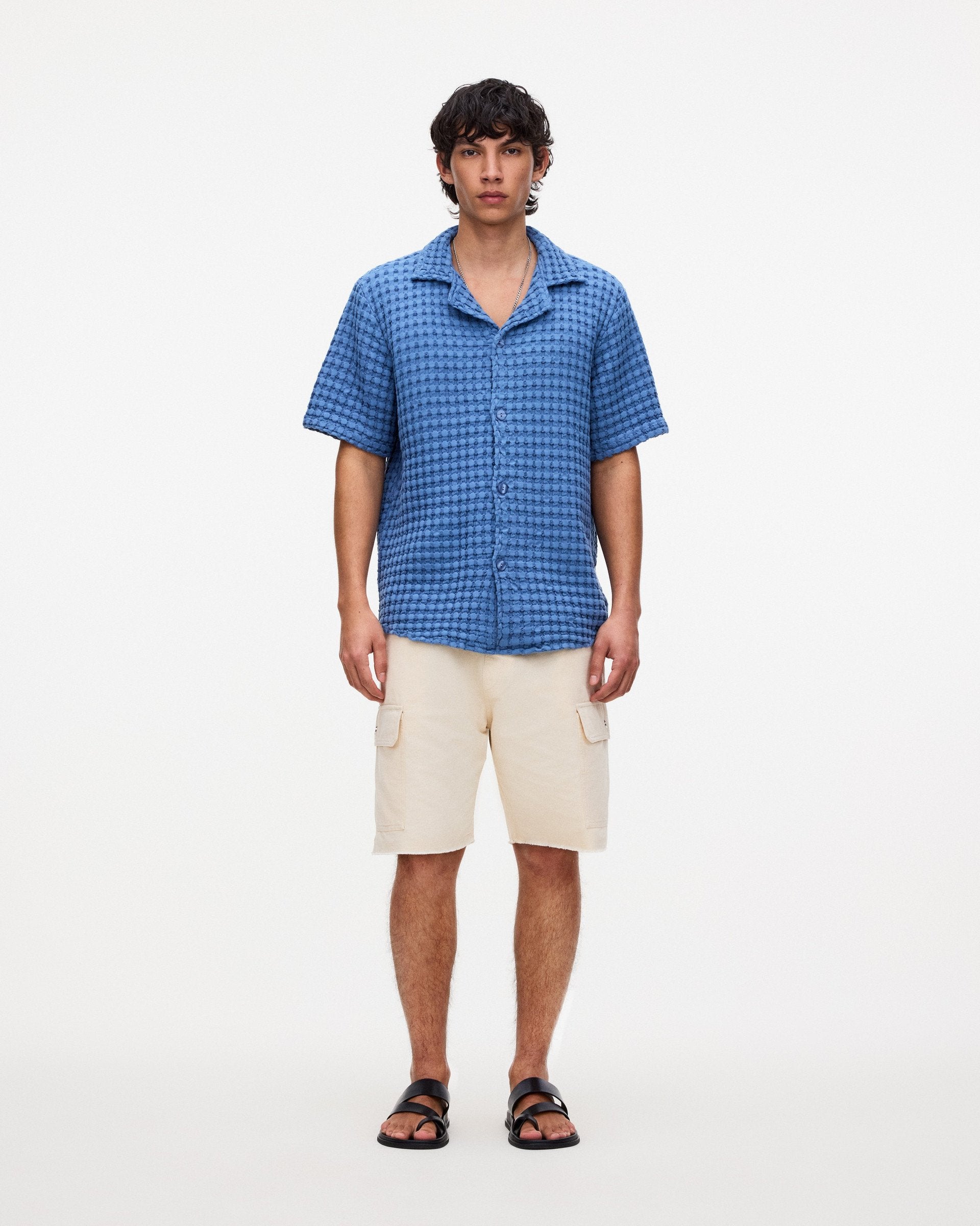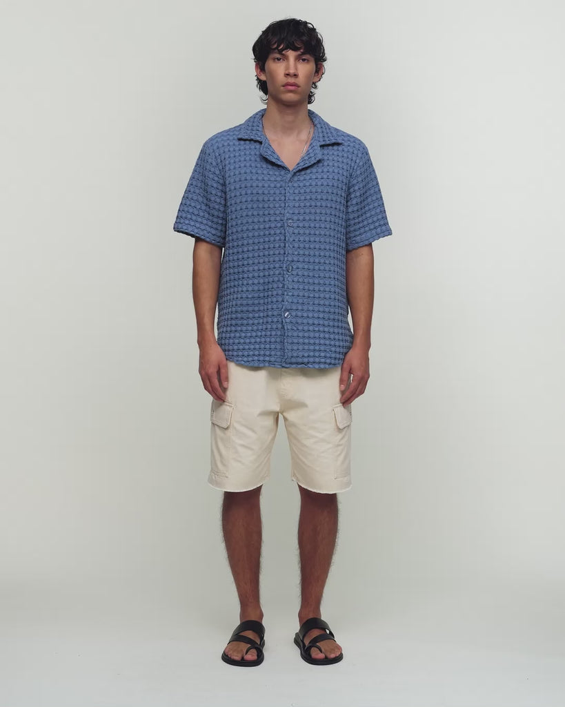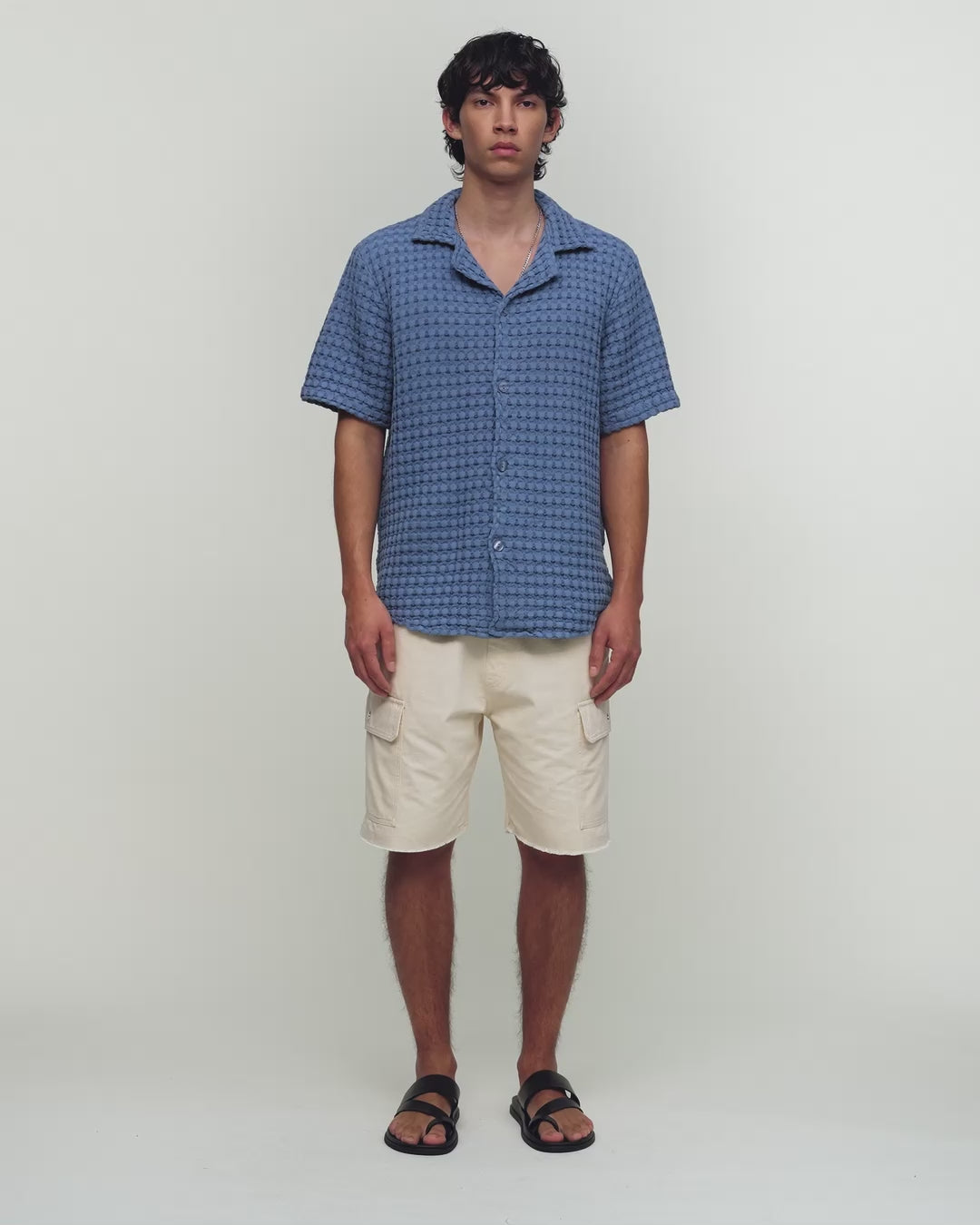 Das Coronet Cuba Waffle Shirt ist mit großzügigem Baumwollanteil in Waffelbindung gewebt und fühlt sich besonders weich und kühl auf der Haut an. Die entspannte Silhouette zeichnet sich durch eckige Ärmel, einen gerippten Kragen und eine Knopfleiste auf der Vorderseite aus.