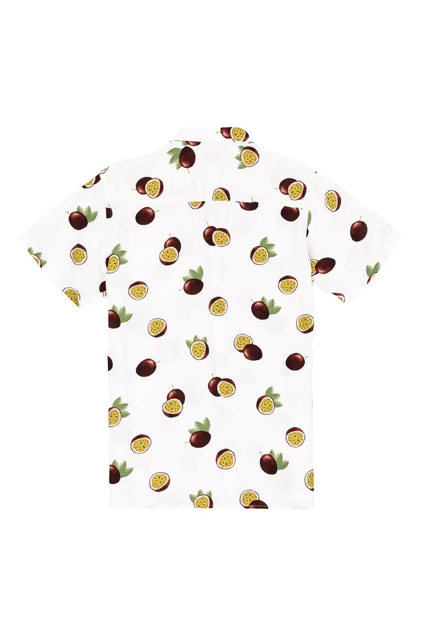 Pasfruit-Hemd mit kurzen Ärmeln in Weiß oder Schwarz und einer Zusammensetzung aus 100 % weicher Viskose mit Fruchtdekor und All-Over-Print (AOP) von Passionsfrucht, öko-verarbeitet von OEKO-TEX, für den neuen Frühling-Sommer Sammlung.