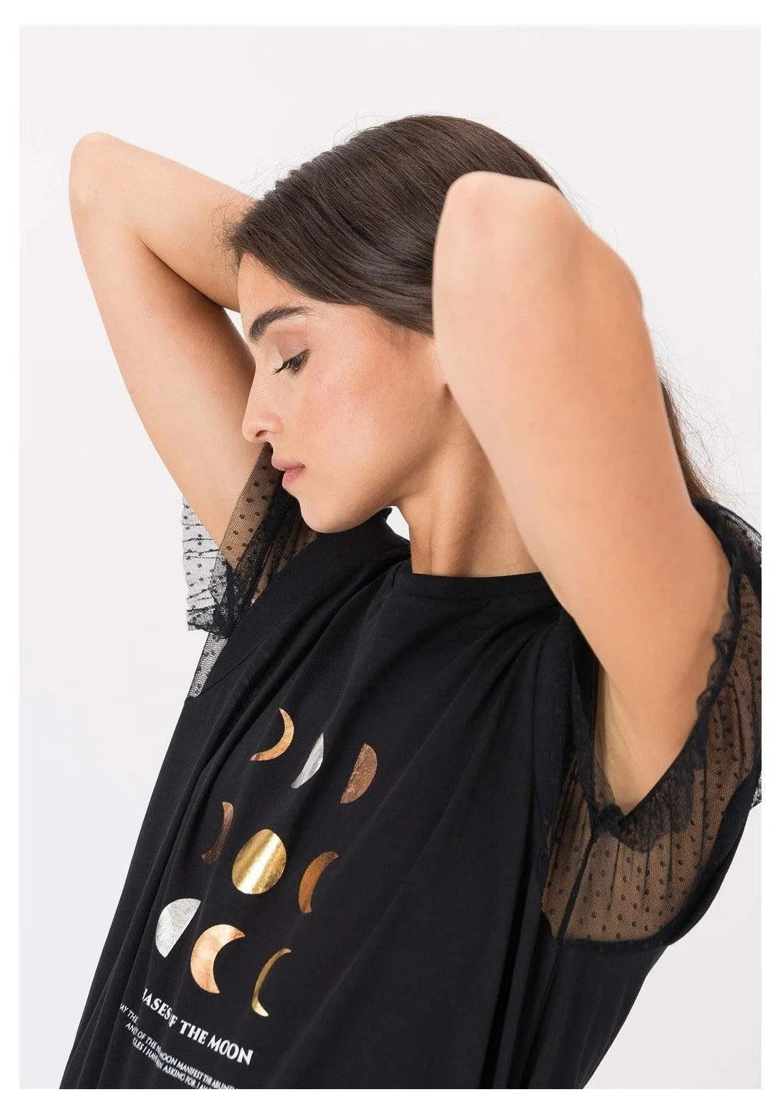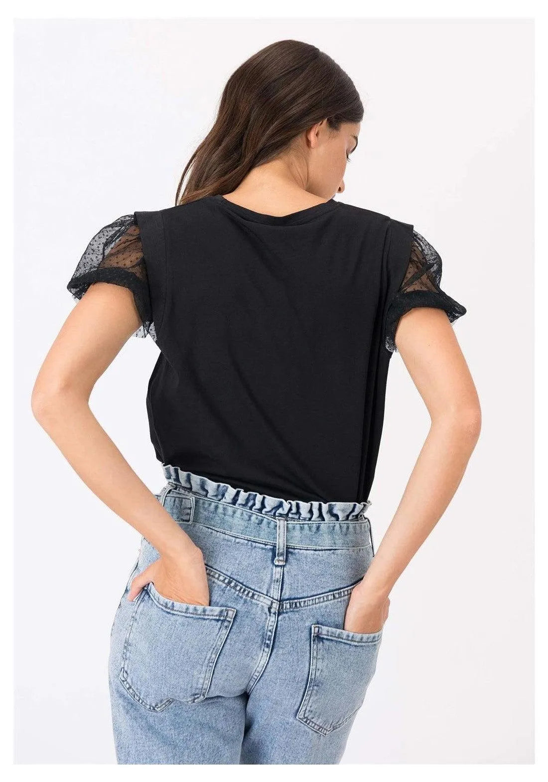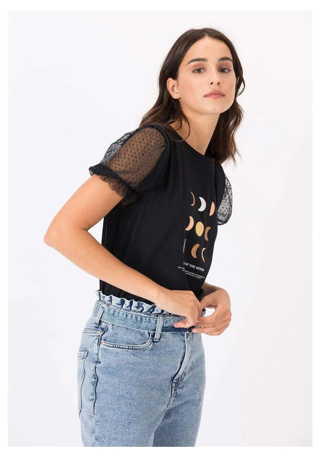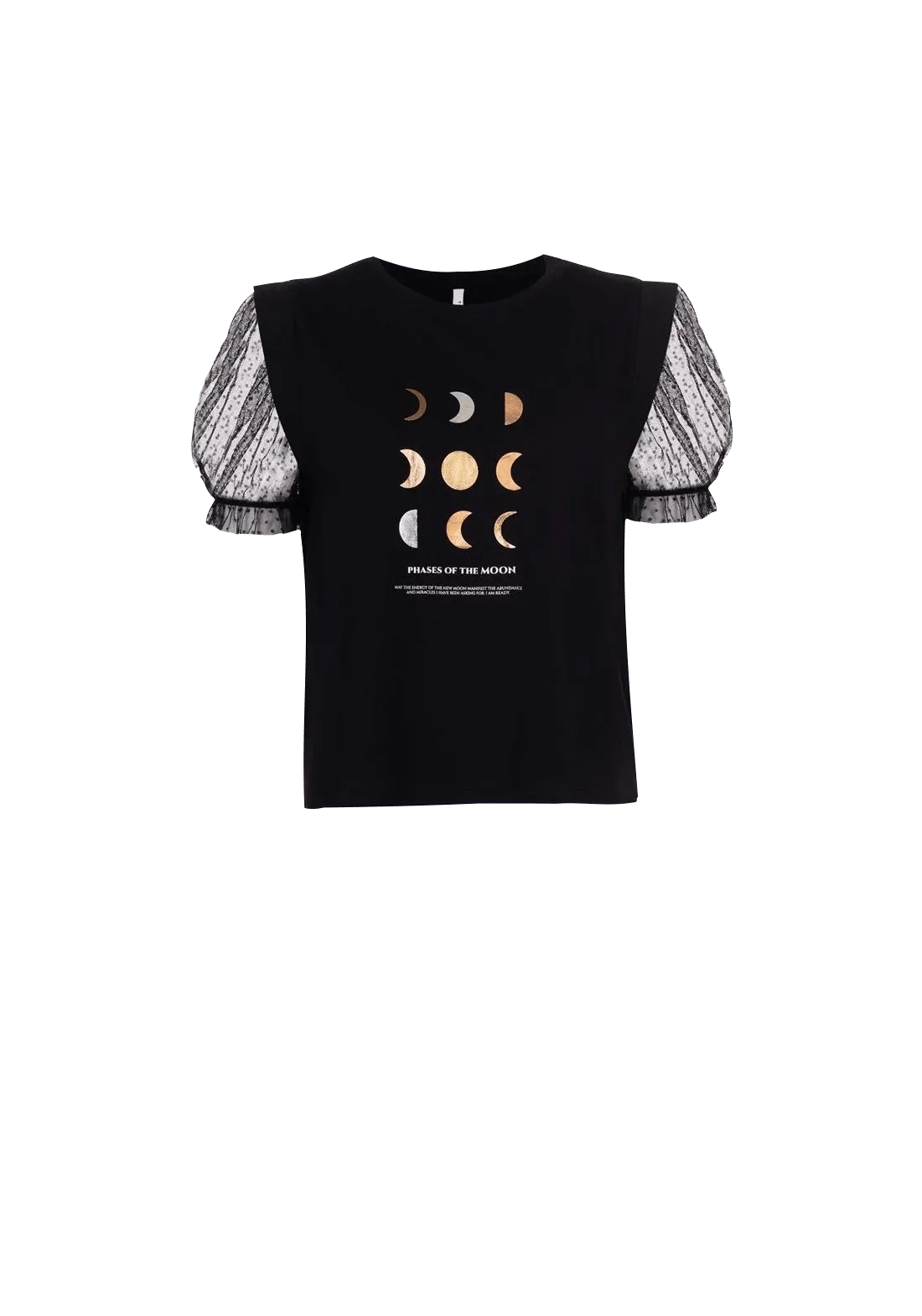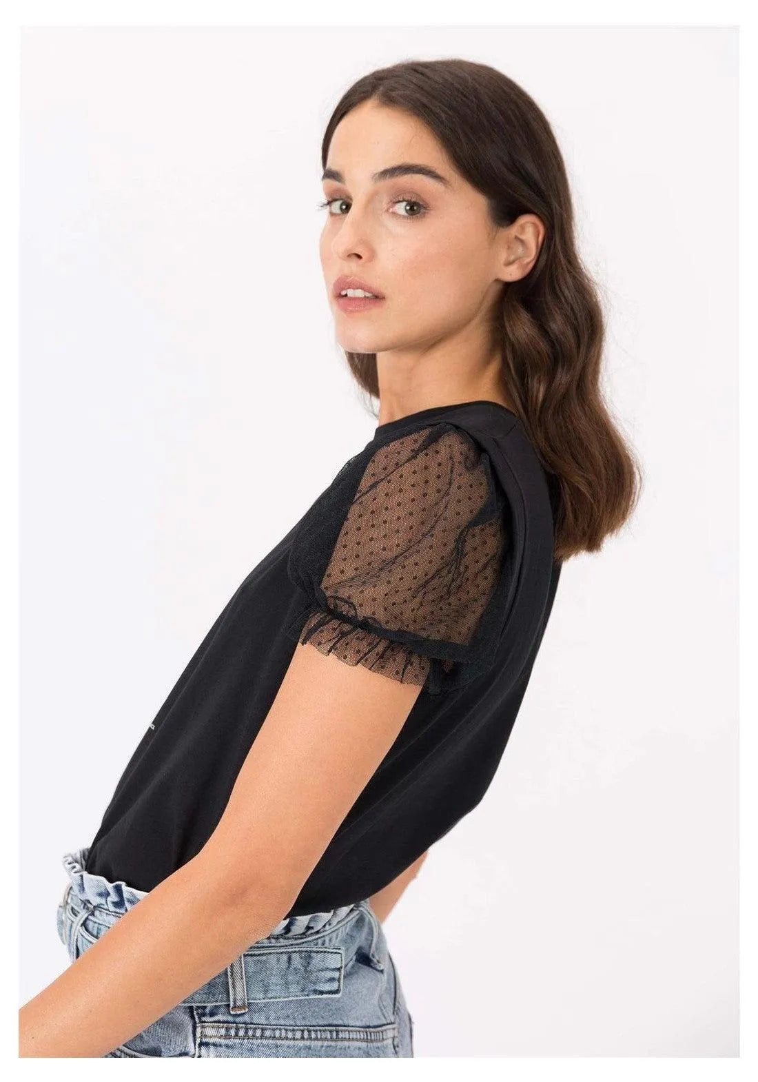 Schwarzes Kurzarm-T-Shirt mit transparenten Puffärmeln.