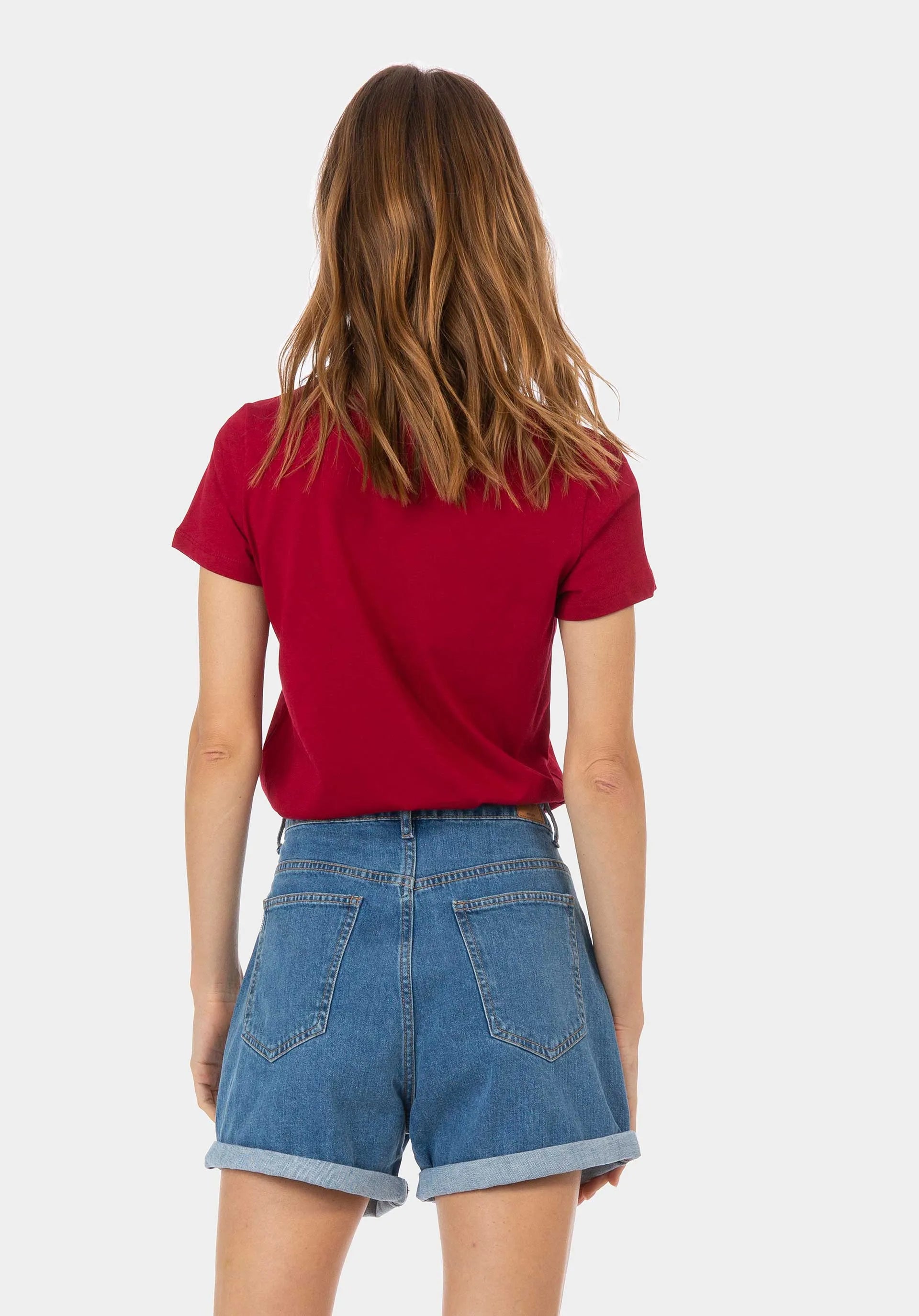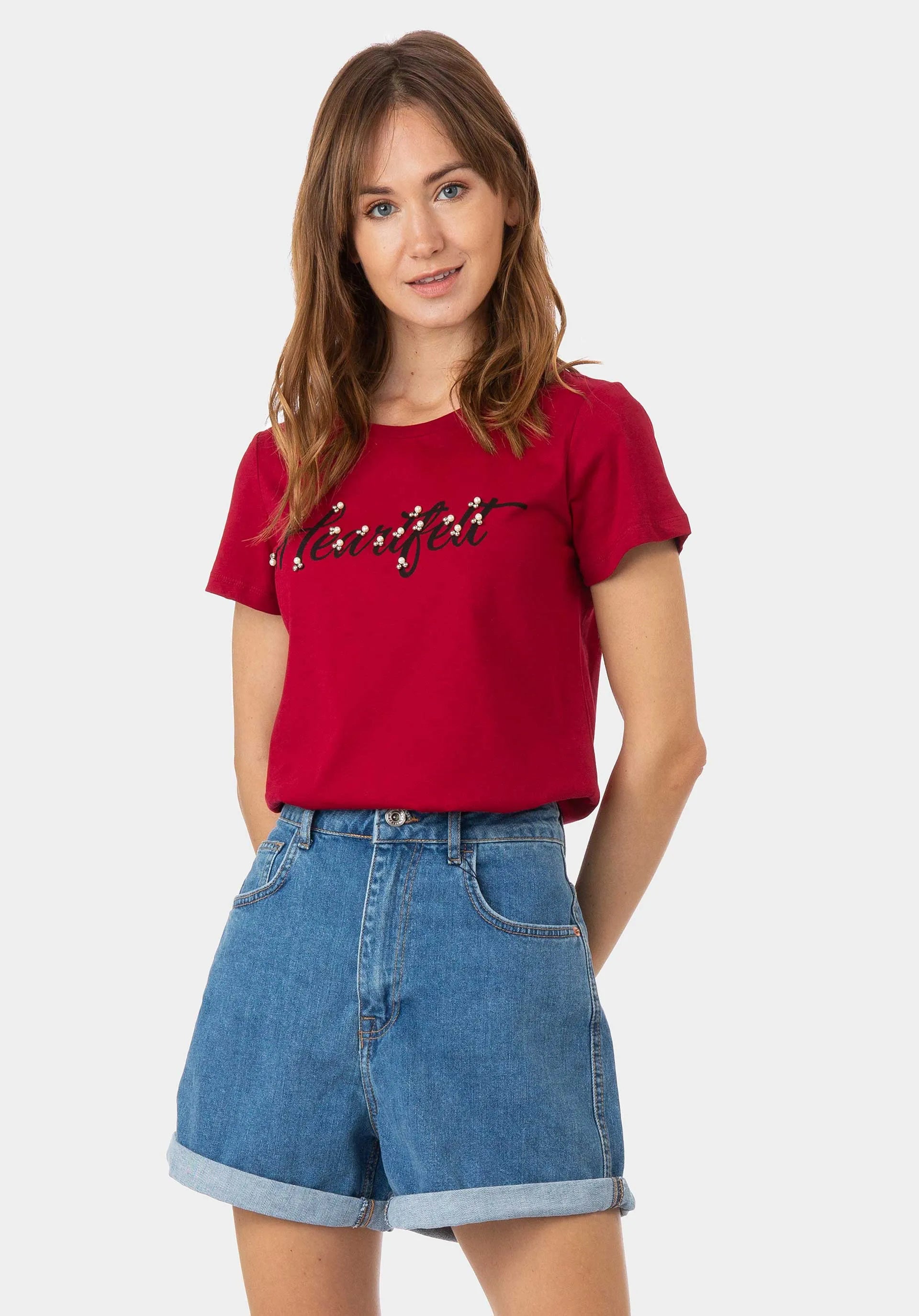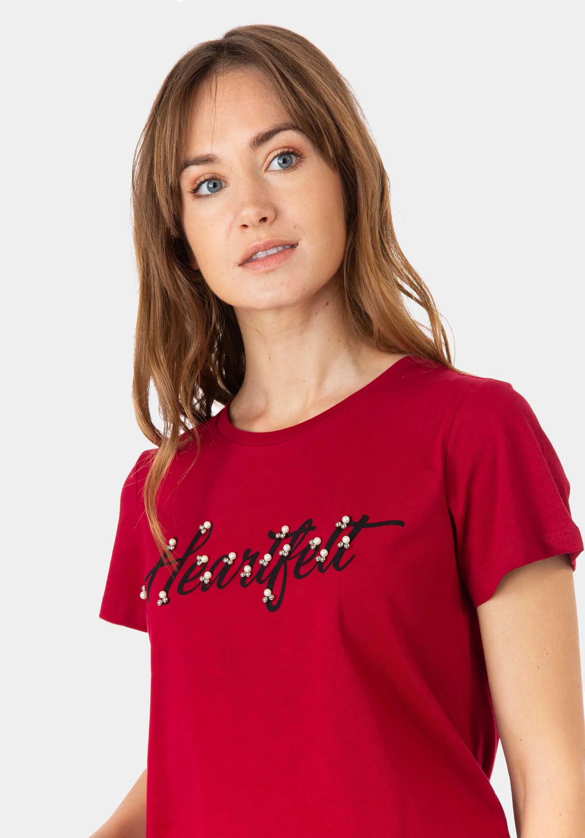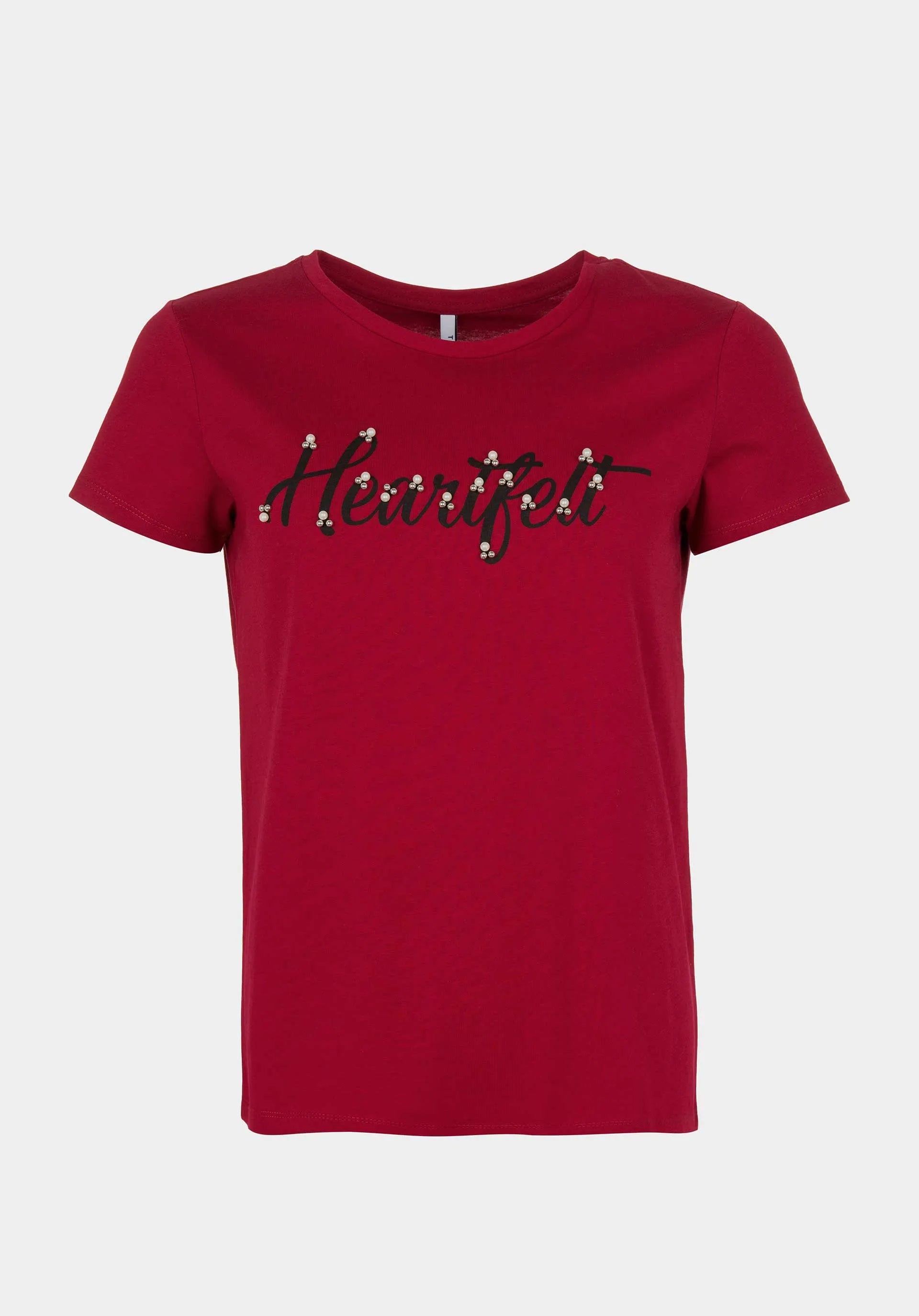 Rotes Kurzarm-T-Shirt mit Aufdruck auf der Brust und schwarzem Besatz. Motto „Herzlich“.