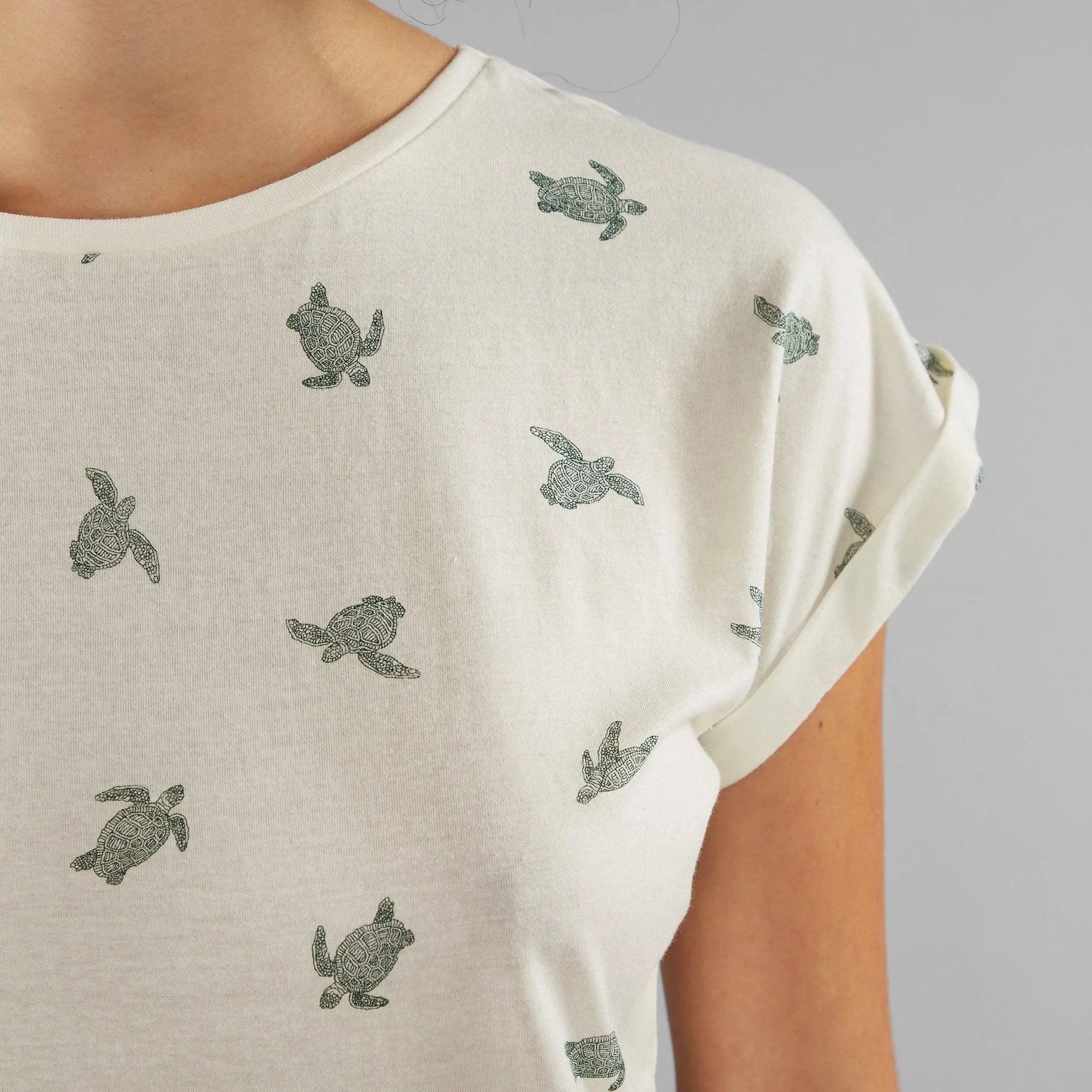 Damen-T-Shirt mit Rundhalsausschnitt und umgeschlagenen kurzen Ärmeln, nachhaltig hergestellt mit Rücksicht auf Mensch und Umwelt.