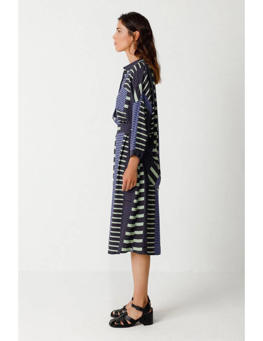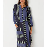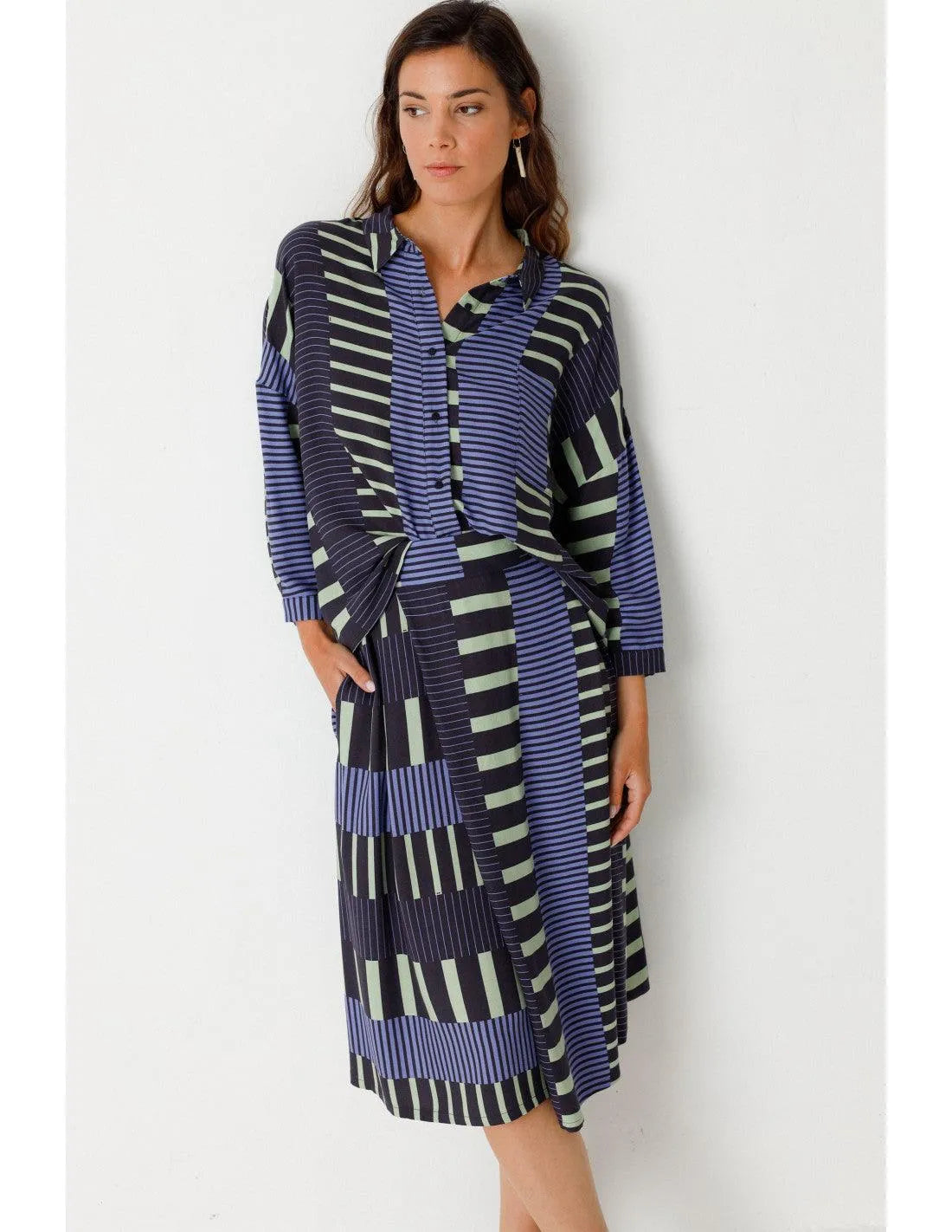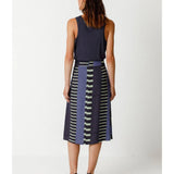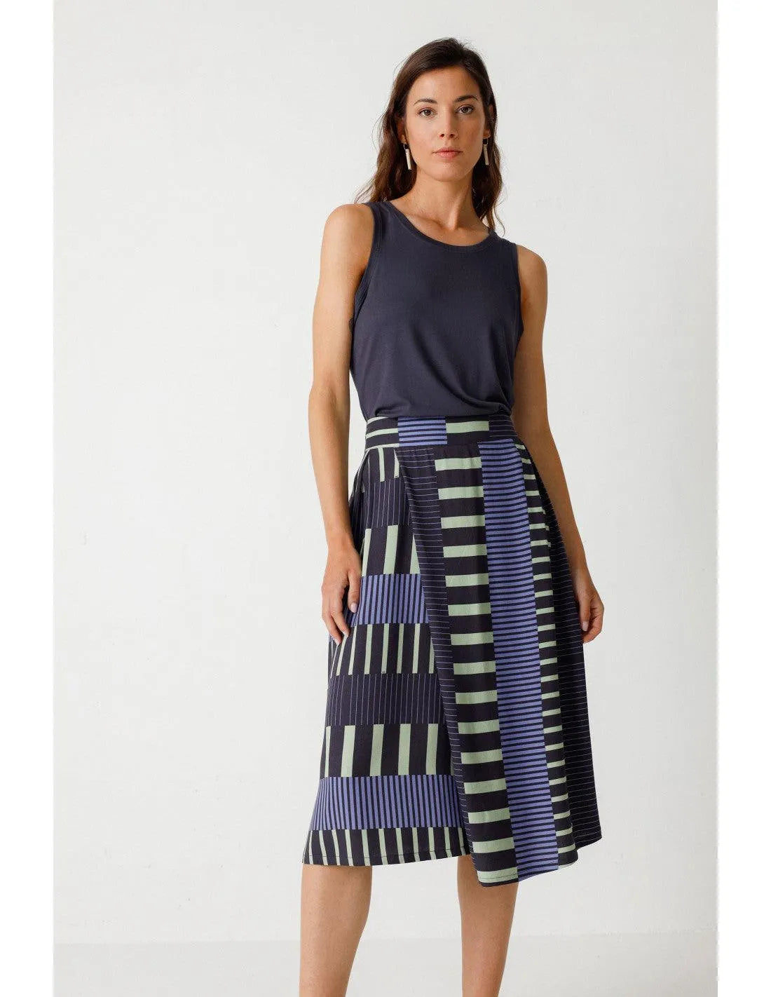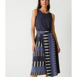 Ausgestellter Rock mit Crossover-Effekt und Länge unterhalb des Knies. Praktische Seitentaschen und Reißverschluss hinten. Grafischer Druck.