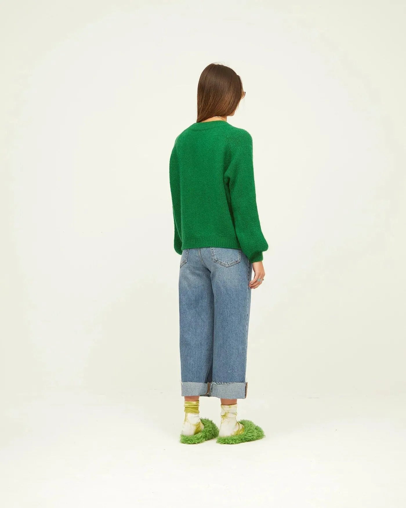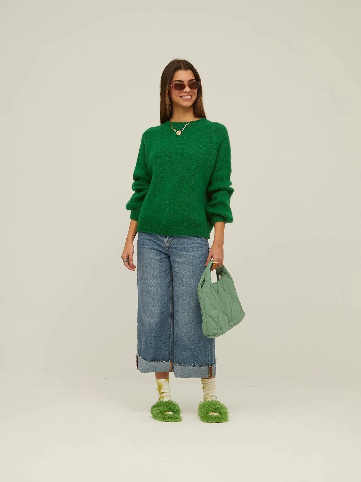 Grüner schlichter Pullover mit Puffärmeln