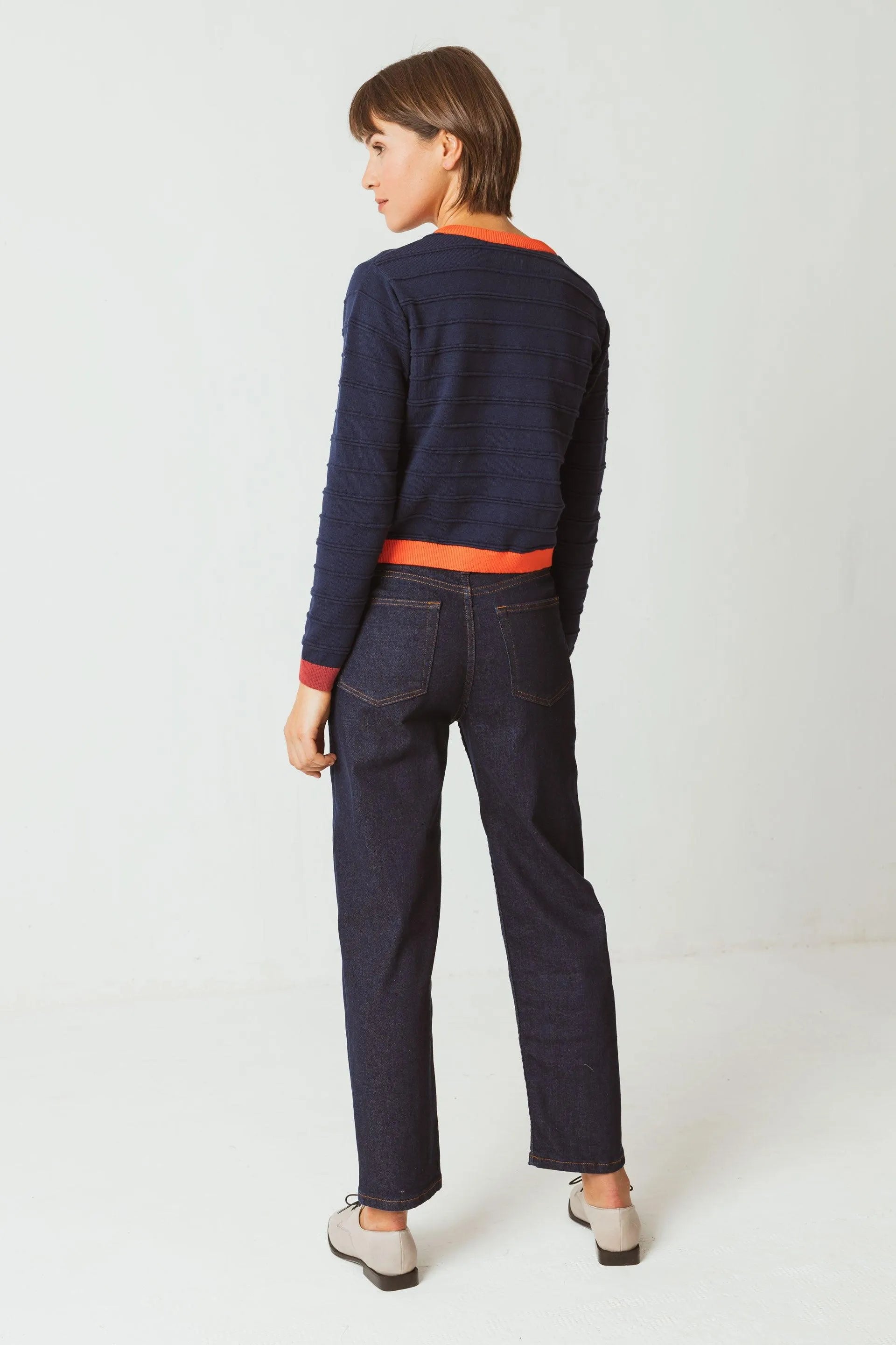 Kurze Jacke mit Rundhalsausschnitt und Knopfverschluss aus Bio-Baumwollstrick mit Farbblockdruck und Bourrelet-Sticheffekten. Navy blau. Bio-Baumwolle wird mit Methoden und Mitteln angebaut, die nur minimale Auswirkungen auf die Umwelt haben. Beim Anbau werden keine giftigen Düngemittel oder Pestizide verwendet und die Böden bleiben fruchtbar.