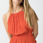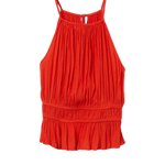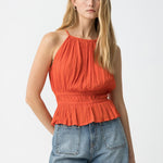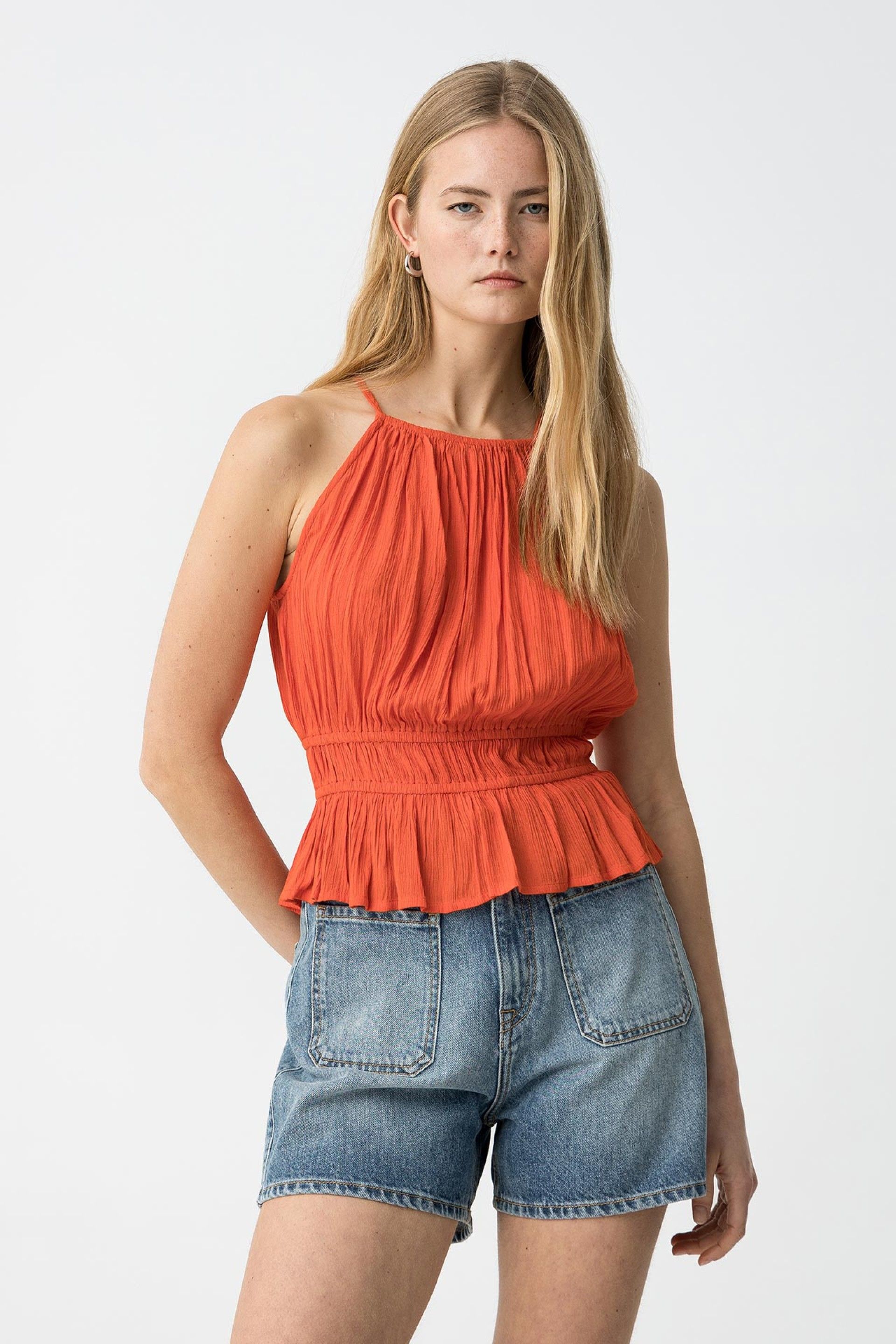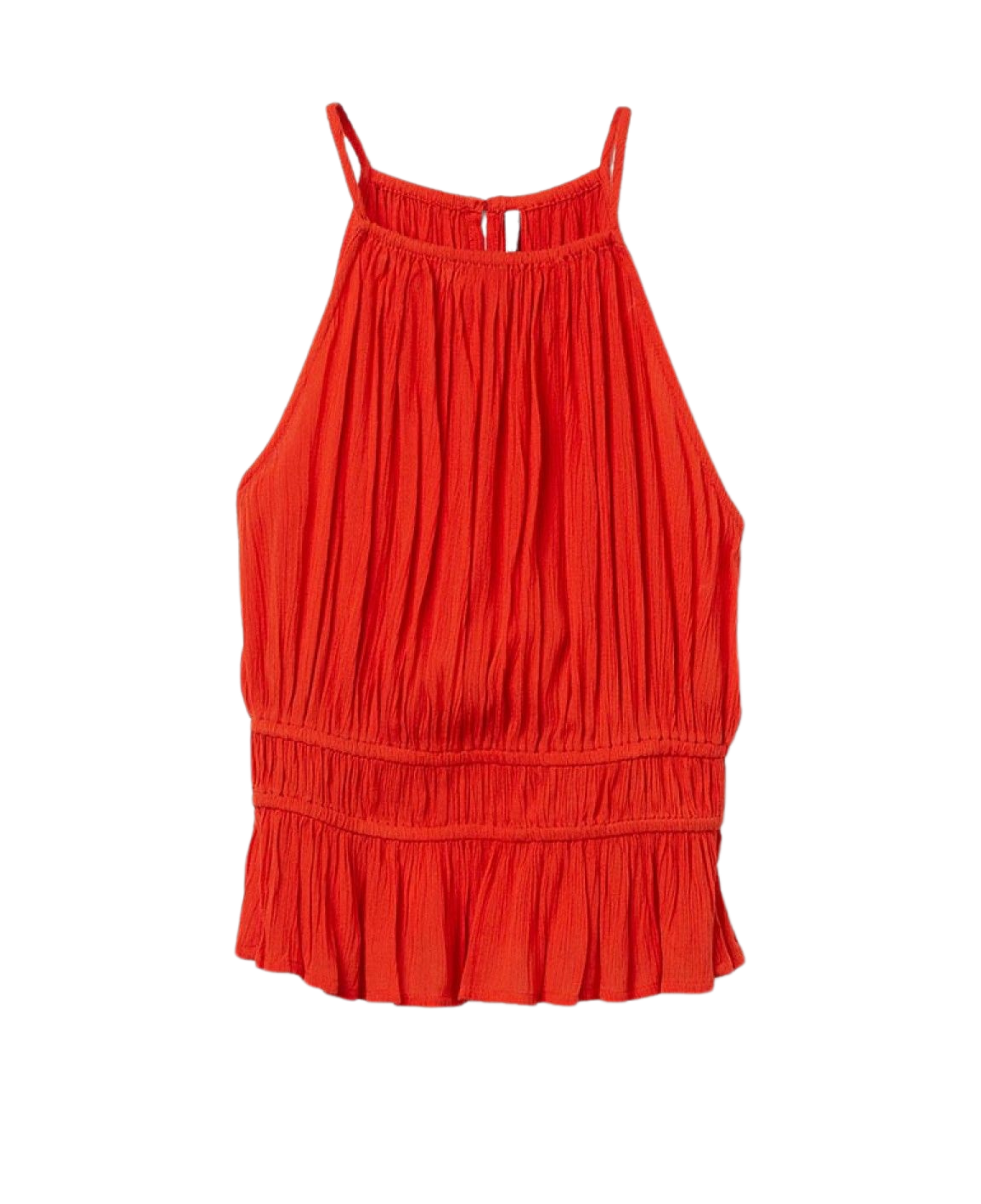 Top mit geradem Ausschnitt, dünnen Trägern und einer Rüsche an der Taille.