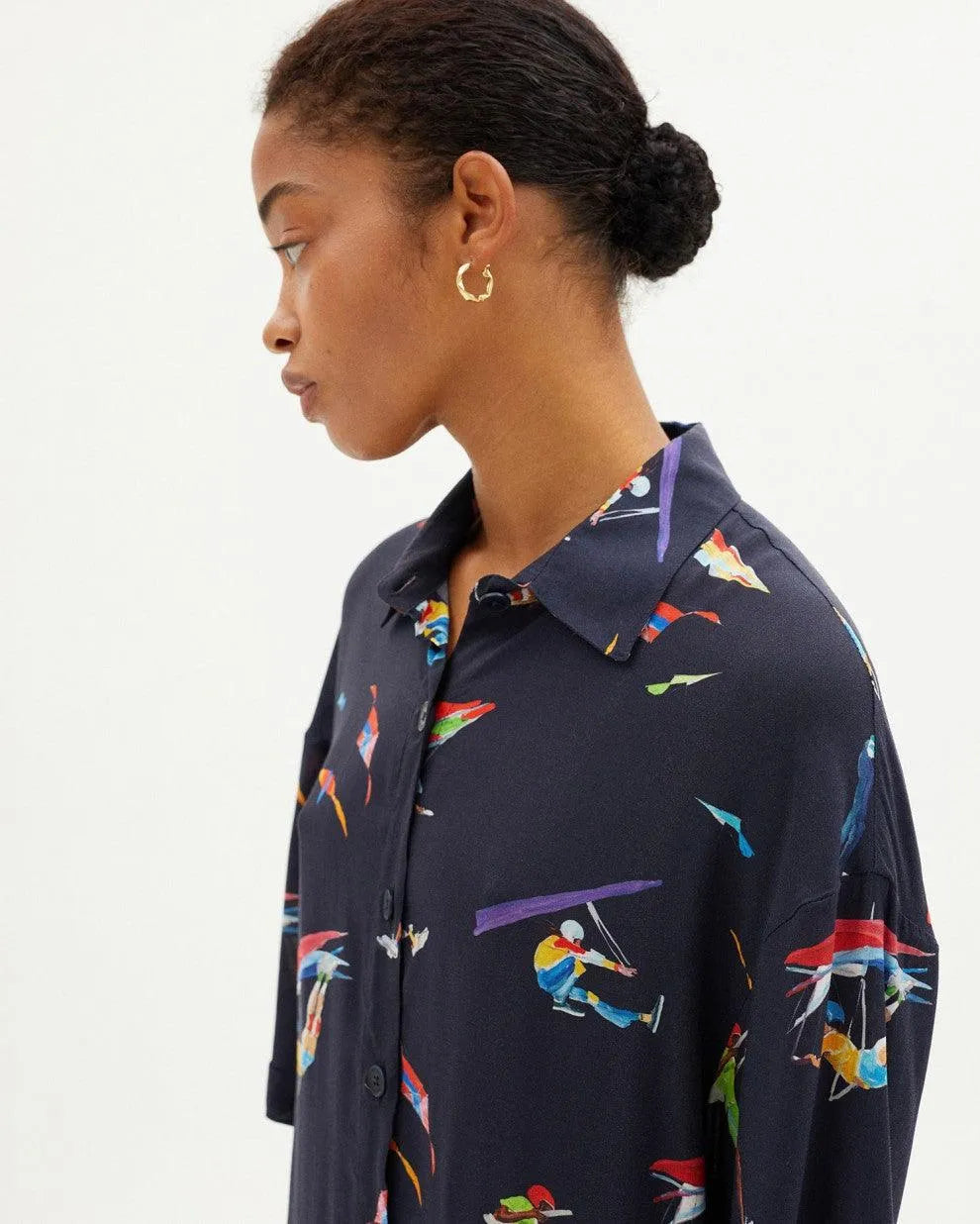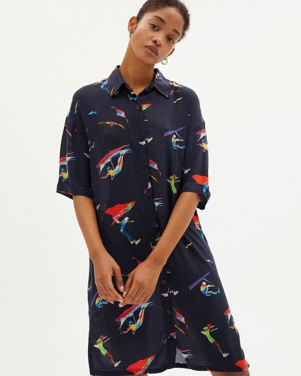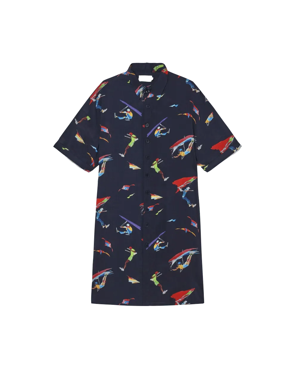 KURZARMES OVERSIZE-HEMDKLEID MIT DRUCK IN ZUSAMMENARBEIT MIT DEM KÜNSTLER MARIO GONZALEZ. VORDERER VERSCHLUSS MIT NATÜRLICHEN STEINKNÖPFEN.